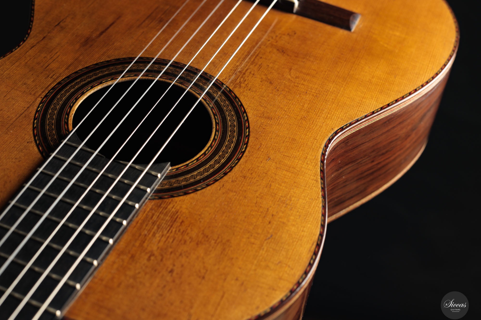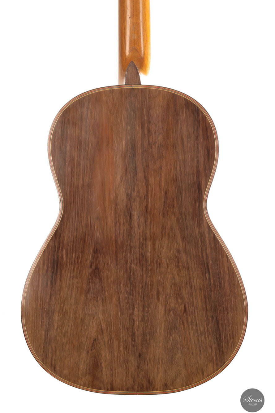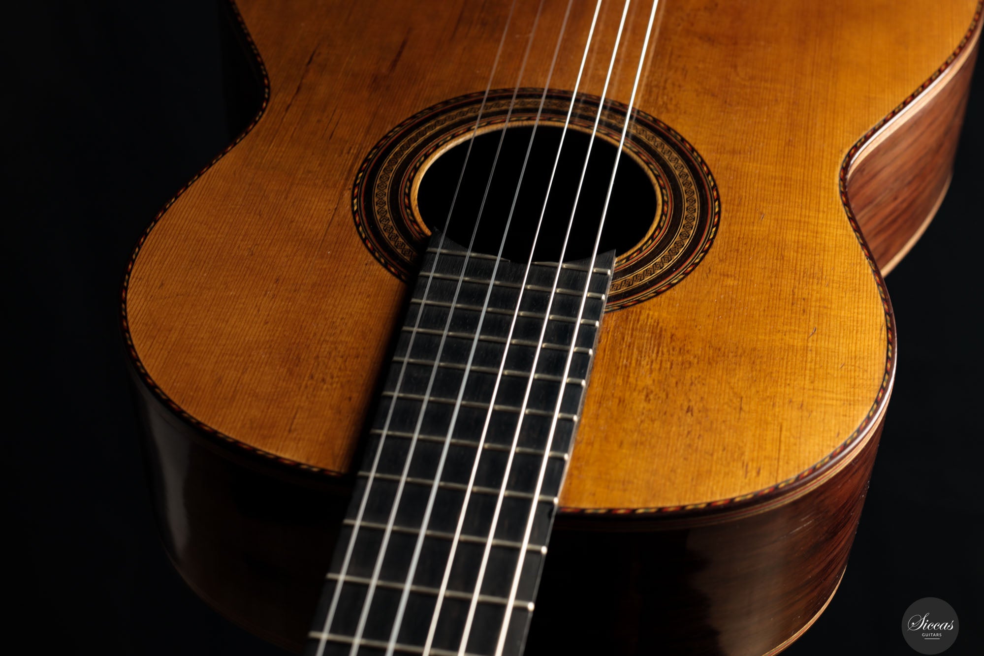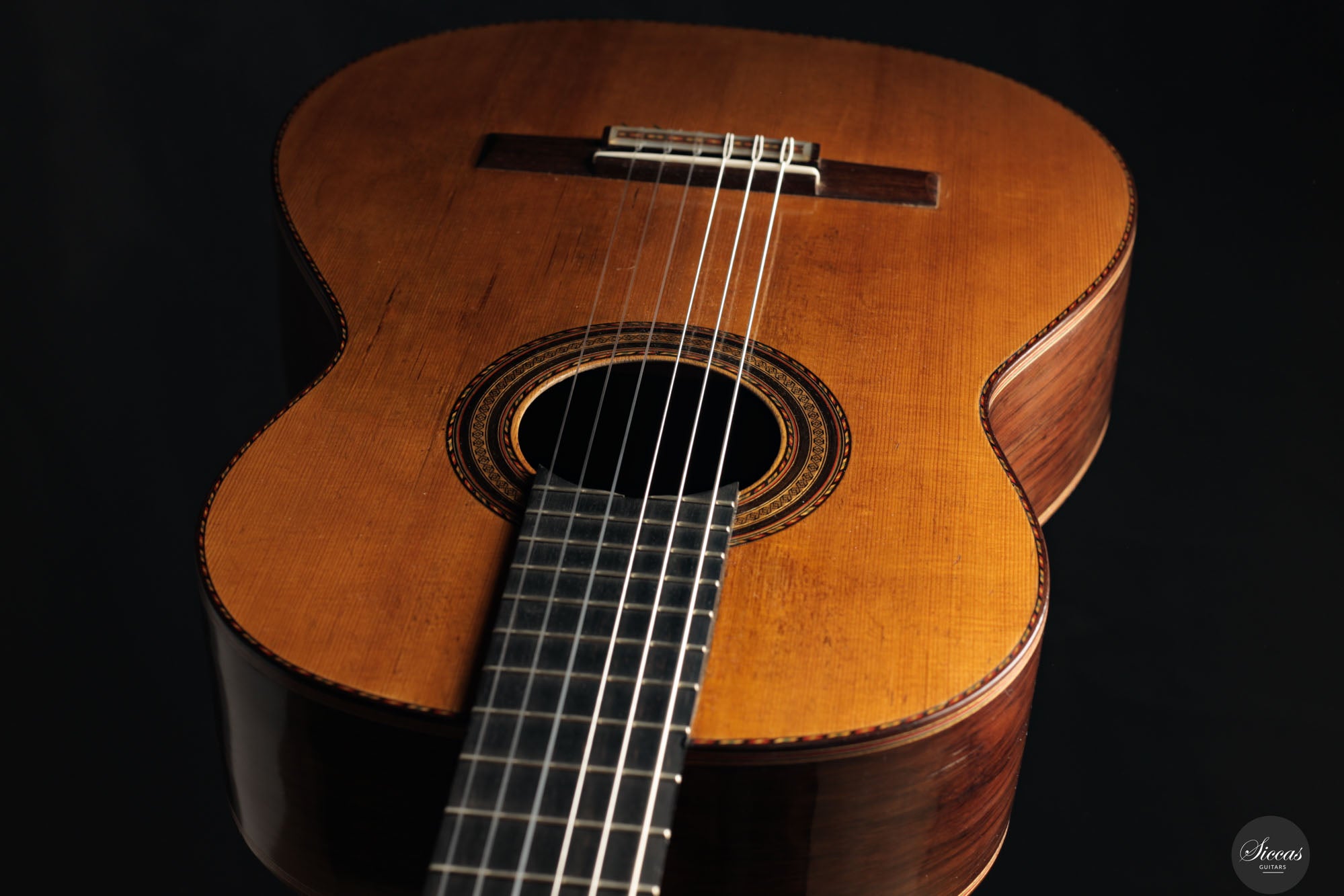 Built in 1933 at the height of Domingo Esteso’s career, this extraordinary guitar is a rare and exquisite model with Brazilian rosewood back and sides. It embodies Esteso’s renowned purist design, characterized by simple yet elegant lines and intricate inlays. The French-style rosette exudes sophistication, while the headstock stands out as the most elaborate of Esteso’s models, reminiscent of the finest creations from the workshop of Manuel Ramirez. This guitar underwent a meticulous restoration by a professional luthier is Sevilla, in 2014. The expertly repaired cracks are not easily visible from the outside: two cracks located behind the bridge, three cracks located between the bridge and the soundhole, and two cracks located to the right of the soundhole. All cracks have been reinforced with cleats to ensure the long term stability of the repair, preserving both its structural integrity and its authentic, brilliant sound. There is also a very small crack on the side that has been glued as a preventive measure. Despite nearing its centenary, this instrument is vibrant, playful, and rich in tonal colors, a testament to its timeless craftsmanship. This guitar is a masterpiece of craftsmanship and a tonal treasure, representing the quintessence of Spanish sound from the early 20th century.Regular care extends the life of the instrument
