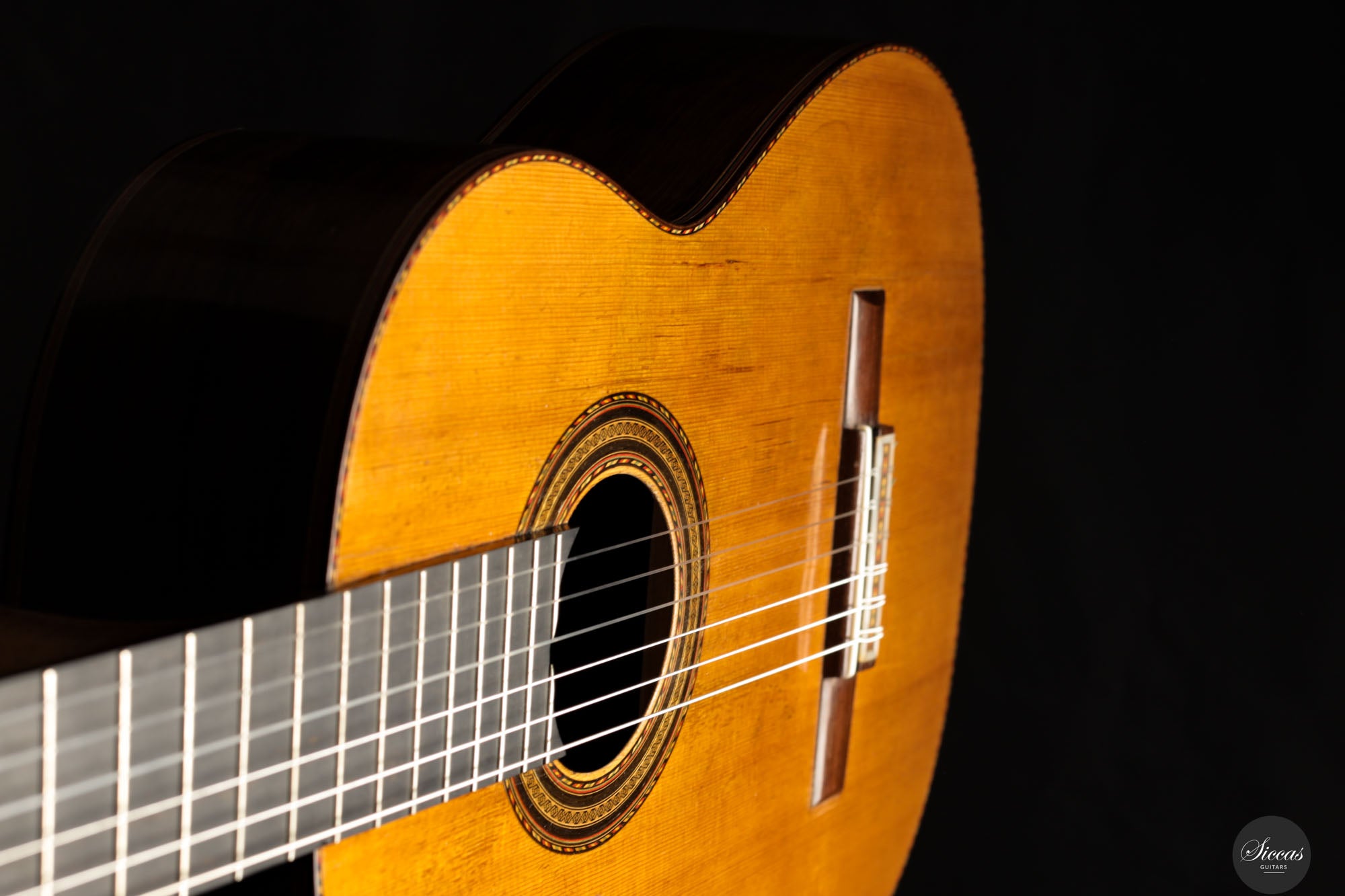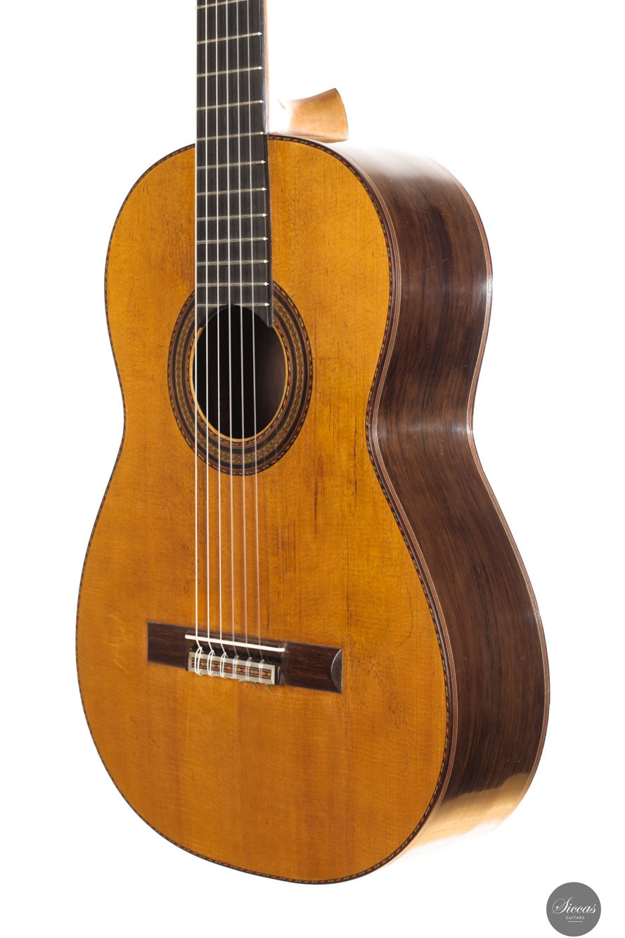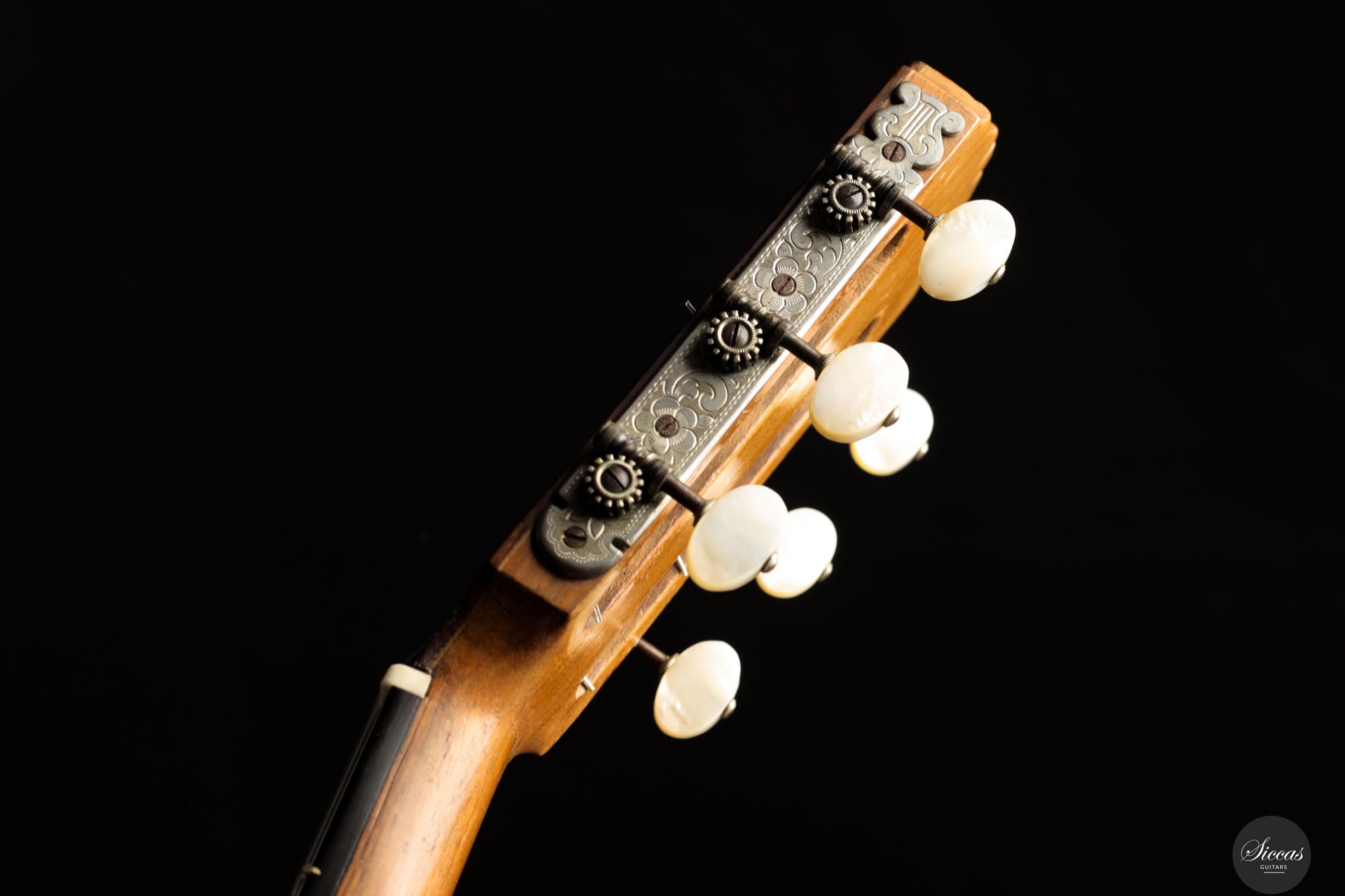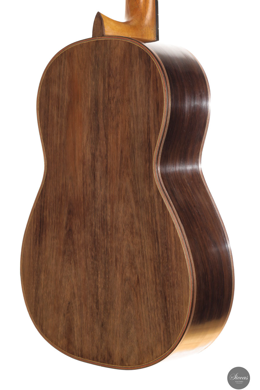 Built in 1933 at the height of Domingo Esteso’s career, this extraordinary guitar is a rare and exquisite model with Brazilian rosewood back and sides. It embodies Esteso’s renowned purist design, characterized by simple yet elegant lines and intricate inlays. The French-style rosette exudes sophistication, while the headstock stands out as the most elaborate of Esteso’s models, reminiscent of the finest creations from the workshop of Manuel Ramirez. This guitar underwent a meticulous restoration by a professional luthier is Sevilla, in 2014. The expertly repaired cracks are not easily visible from the outside: two cracks located behind the bridge, three cracks located between the bridge and the soundhole, and two cracks located to the right of the soundhole. All cracks have been reinforced with cleats to ensure the long term stability of the repair, preserving both its structural integrity and its authentic, brilliant sound. There is also a very small crack on the side that has been glued as a preventive measure. Despite nearing its centenary, this instrument is vibrant, playful, and rich in tonal colors, a testament to its timeless craftsmanship. This guitar is a masterpiece of craftsmanship and a tonal treasure, representing the quintessence of Spanish sound from the early 20th century.Regular care extends the life of the instrument