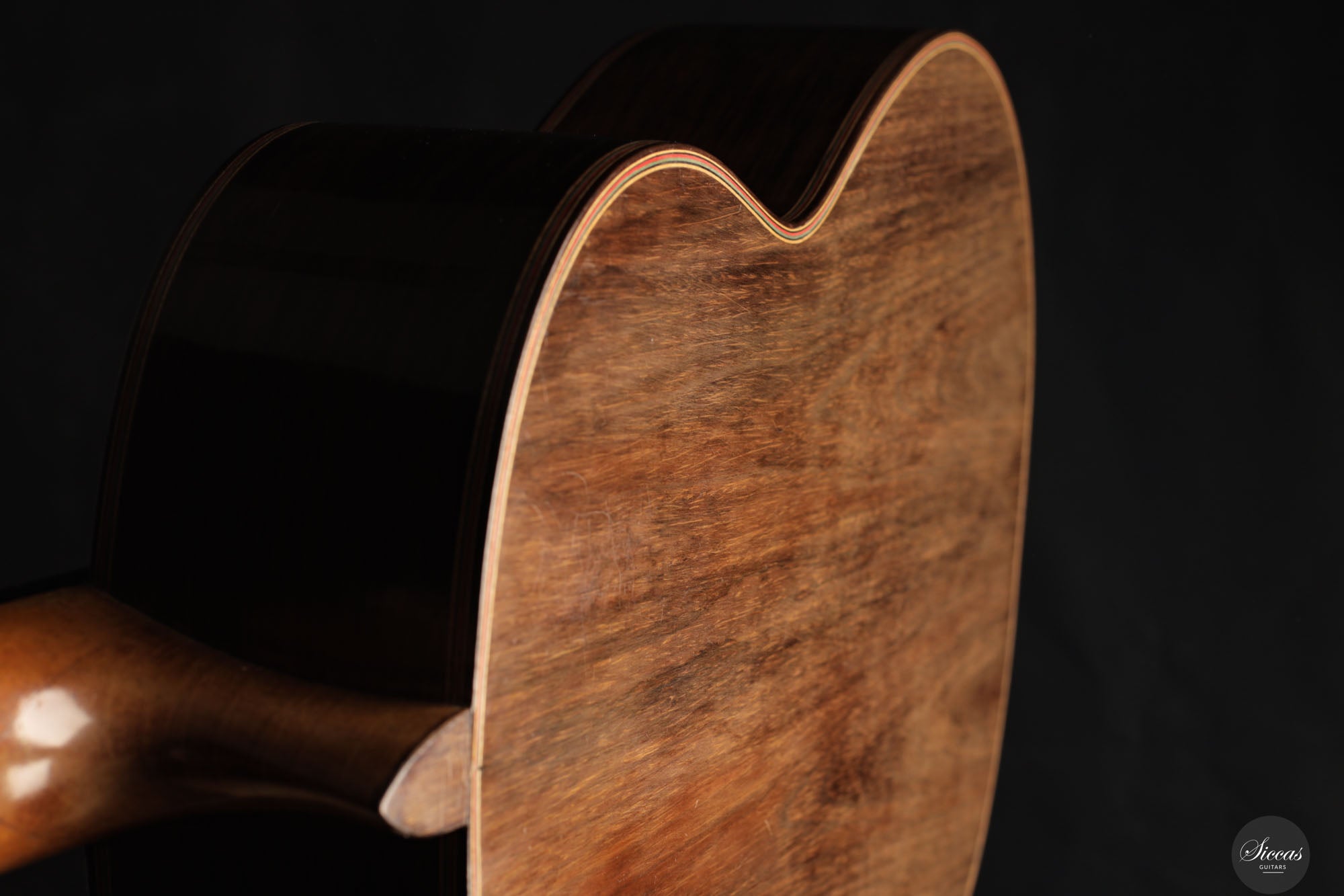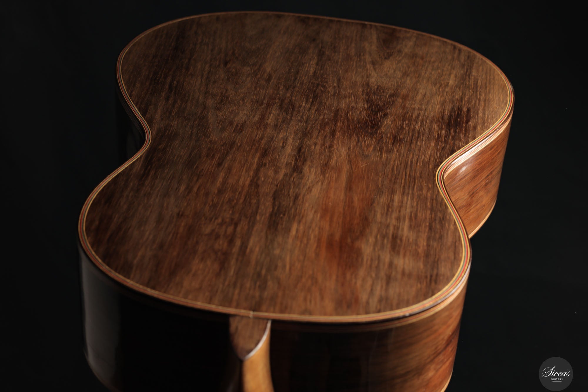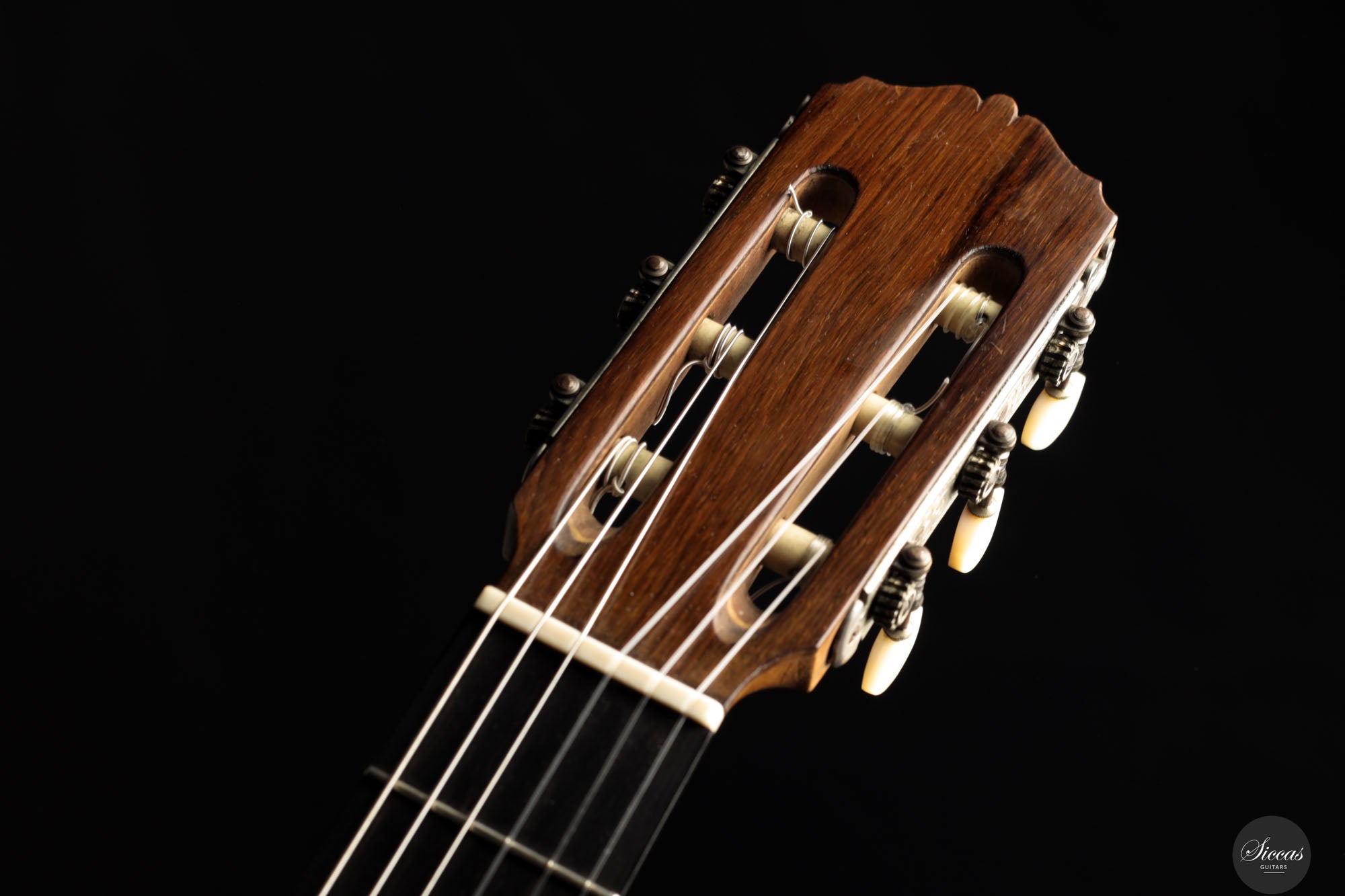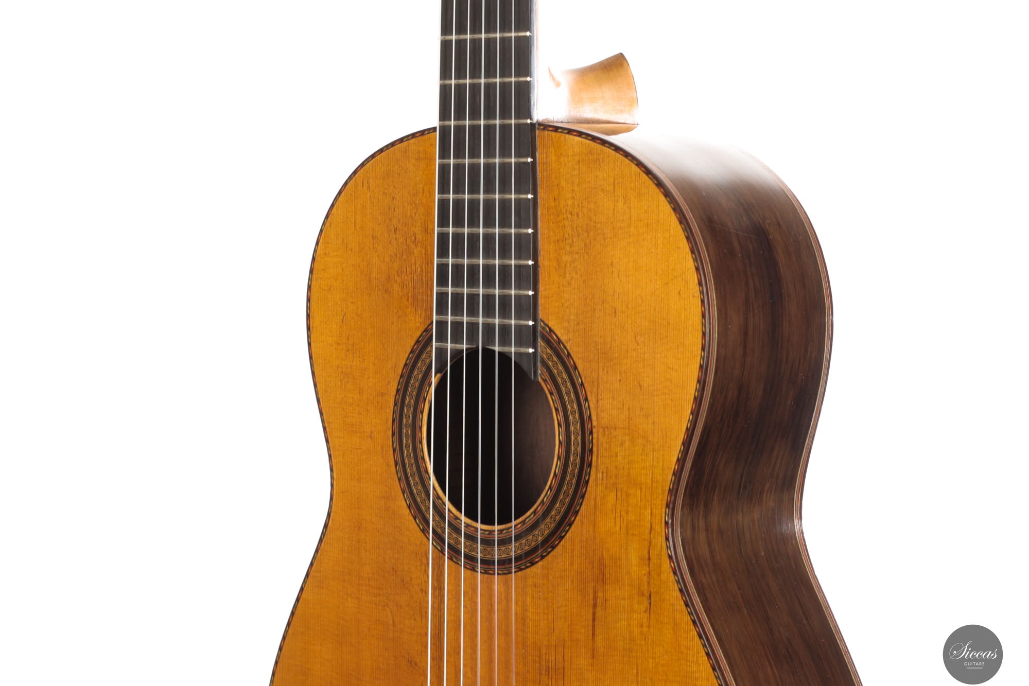 Built in 1933 at the height of Domingo Esteso’s career, this extraordinary guitar is a rare and exquisite model with Brazilian rosewood back and sides. It embodies Esteso’s renowned purist design, characterized by simple yet elegant lines and intricate inlays. The French-style rosette exudes sophistication, while the headstock stands out as the most elaborate of Esteso’s models, reminiscent of the finest creations from the workshop of Manuel Ramirez. This guitar underwent a meticulous restoration by a professional luthier is Sevilla, in 2014. The expertly repaired cracks are not easily visible from the outside: two cracks located behind the bridge, three cracks located between the bridge and the soundhole, and two cracks located to the right of the soundhole. All cracks have been reinforced with cleats to ensure the long term stability of the repair, preserving both its structural integrity and its authentic, brilliant sound. There is also a very small crack on the side that has been glued as a preventive measure. Despite nearing its centenary, this instrument is vibrant, playful, and rich in tonal colors, a testament to its timeless craftsmanship. This guitar is a masterpiece of craftsmanship and a tonal treasure, representing the quintessence of Spanish sound from the early 20th century.Regular care extends the life of the instrument