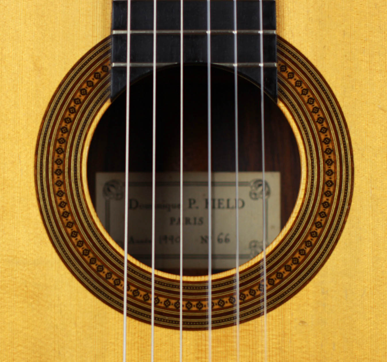 Dominique Field is simply one of the best makers in the world today. He is internationally recognized as one of the best guitar makers world-wide. The demand for his traditional built instruments is so extreme that his enormous wait-list of 15 years was finally closed in August of 2006. Field´s guitars are played by some of the world's leading concert artists. So as you can imagine his instruments are really hard to find. This instrument, built in 1990, has the typical Field headstock. The top, made of European spruce, has a very fine quality and a beautiful detailed rosette. Back and sides are made of well seasoned Indian rosewood. The guitar has still the well working original Sloane tuners. The guitar has the original French polish finish. There are some marks on the top and the back but nothing serious. The guitar had a crack at the heel but it was repaired perfectly.