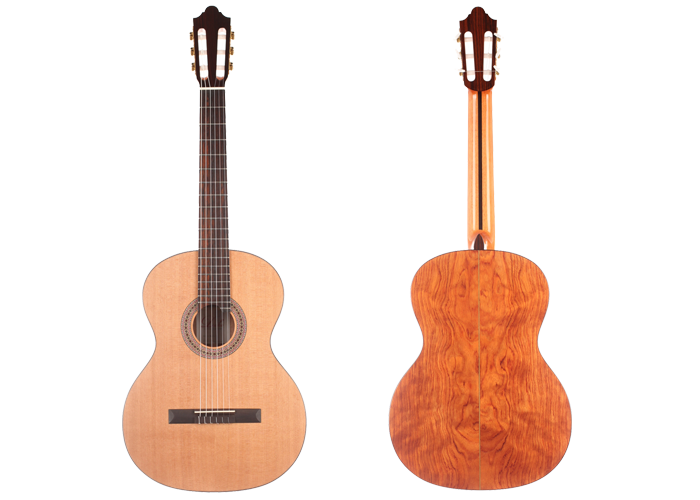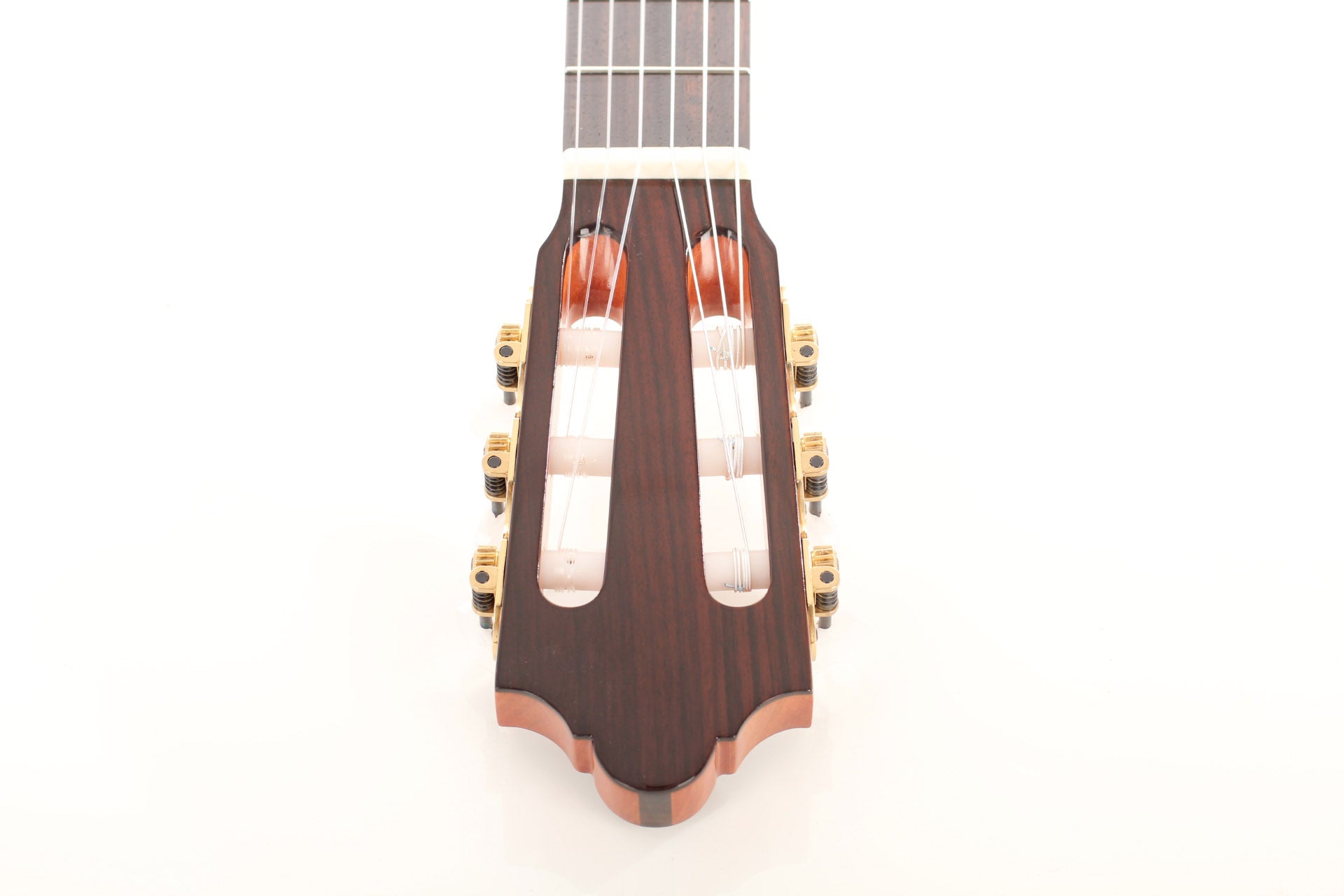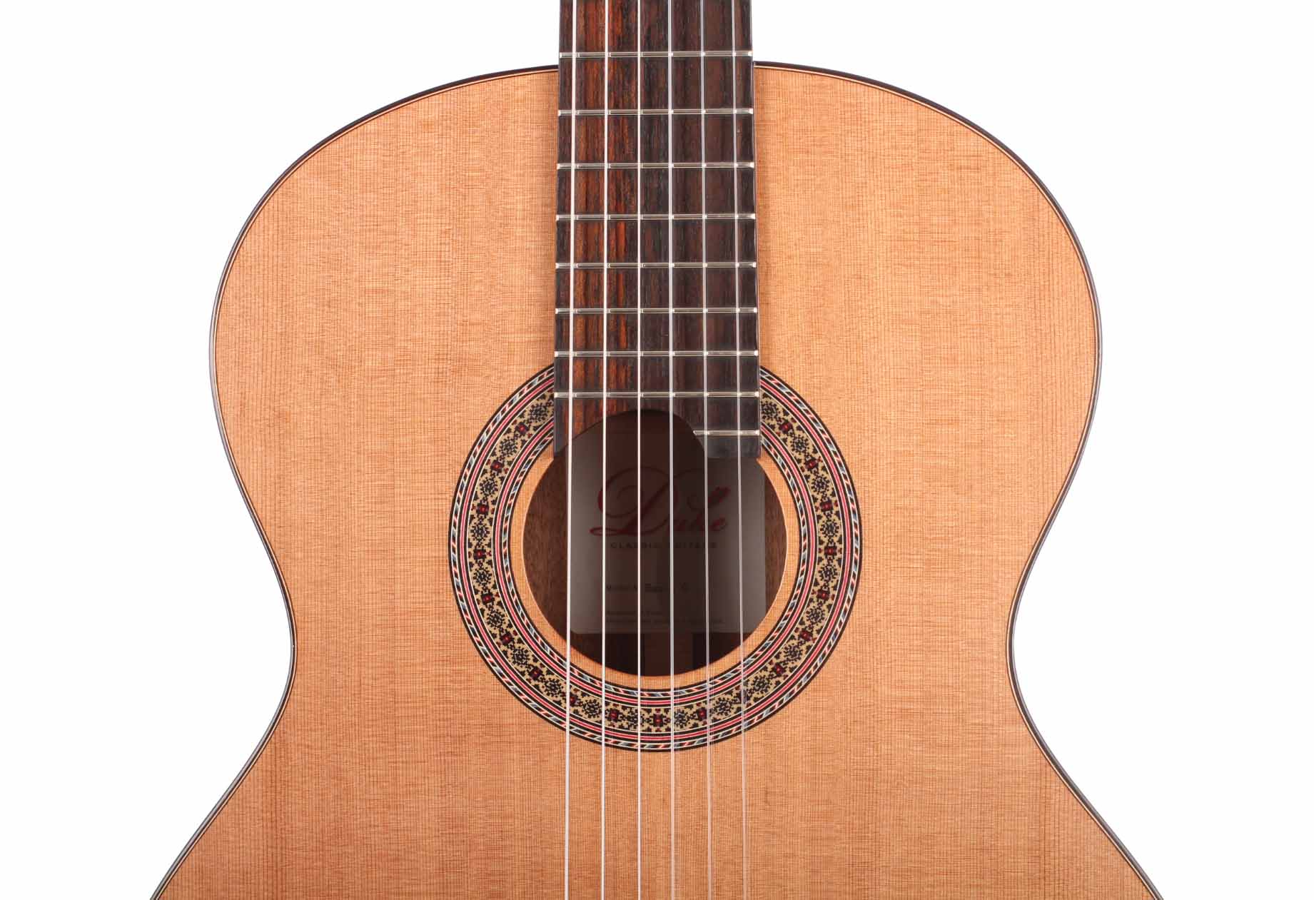 This Duke Basis C model has a scale of 65 cm. The top is made of very fine solid cedar, back and sides are made of laminated Bubinga. The neck is made of cedro and is reinforced in the middle of the neck with Indian rosewood. The machine heads are R1 by Rubner. The guitars are refined with a high gloss finish.