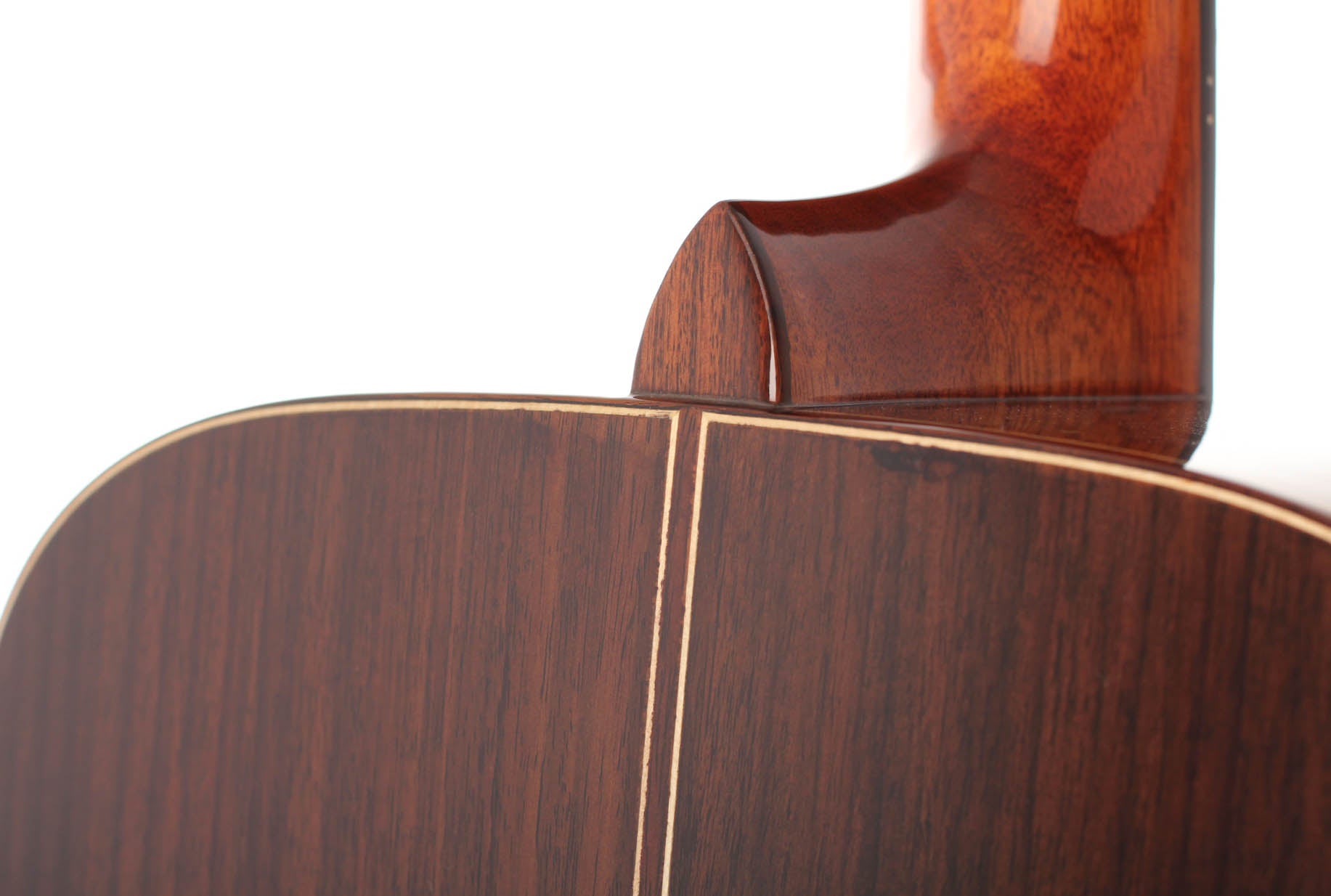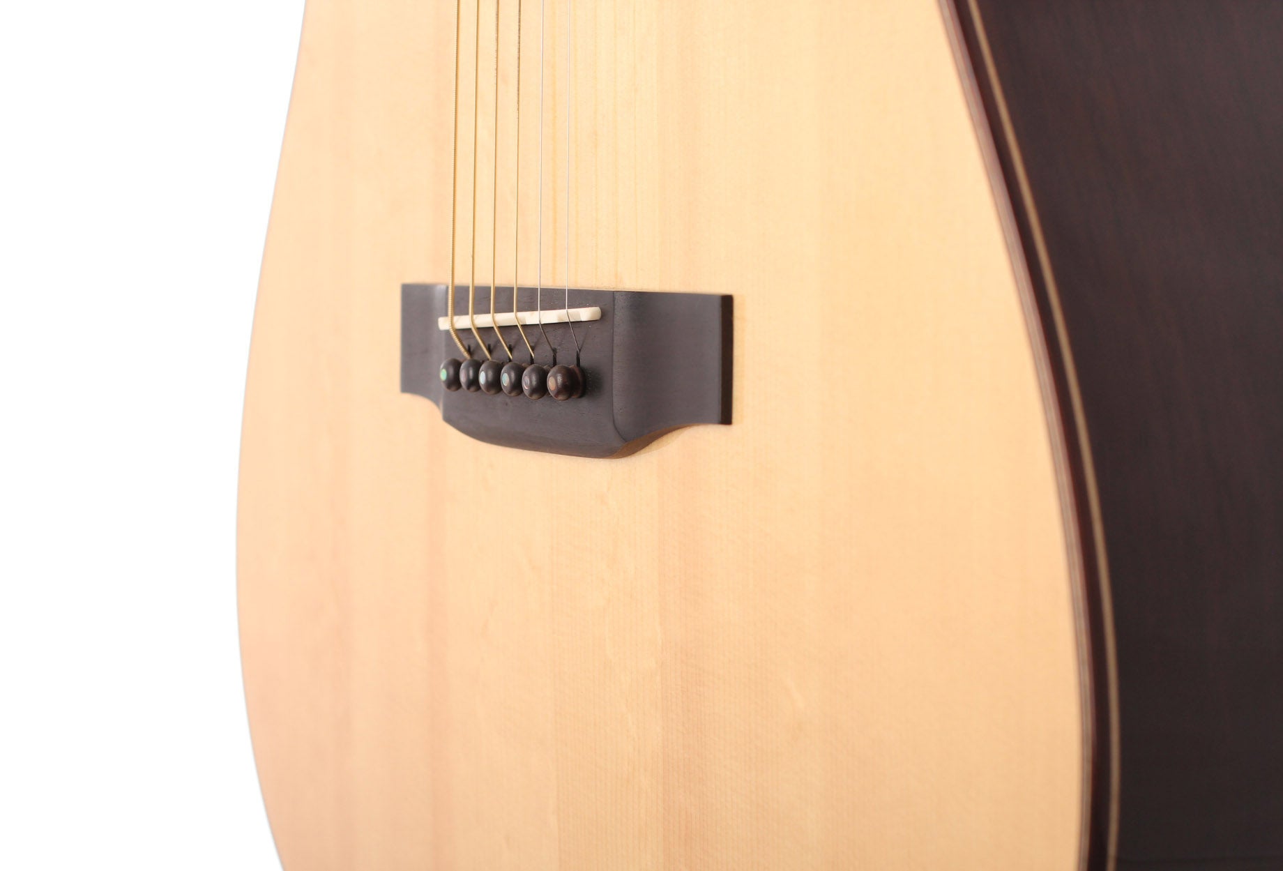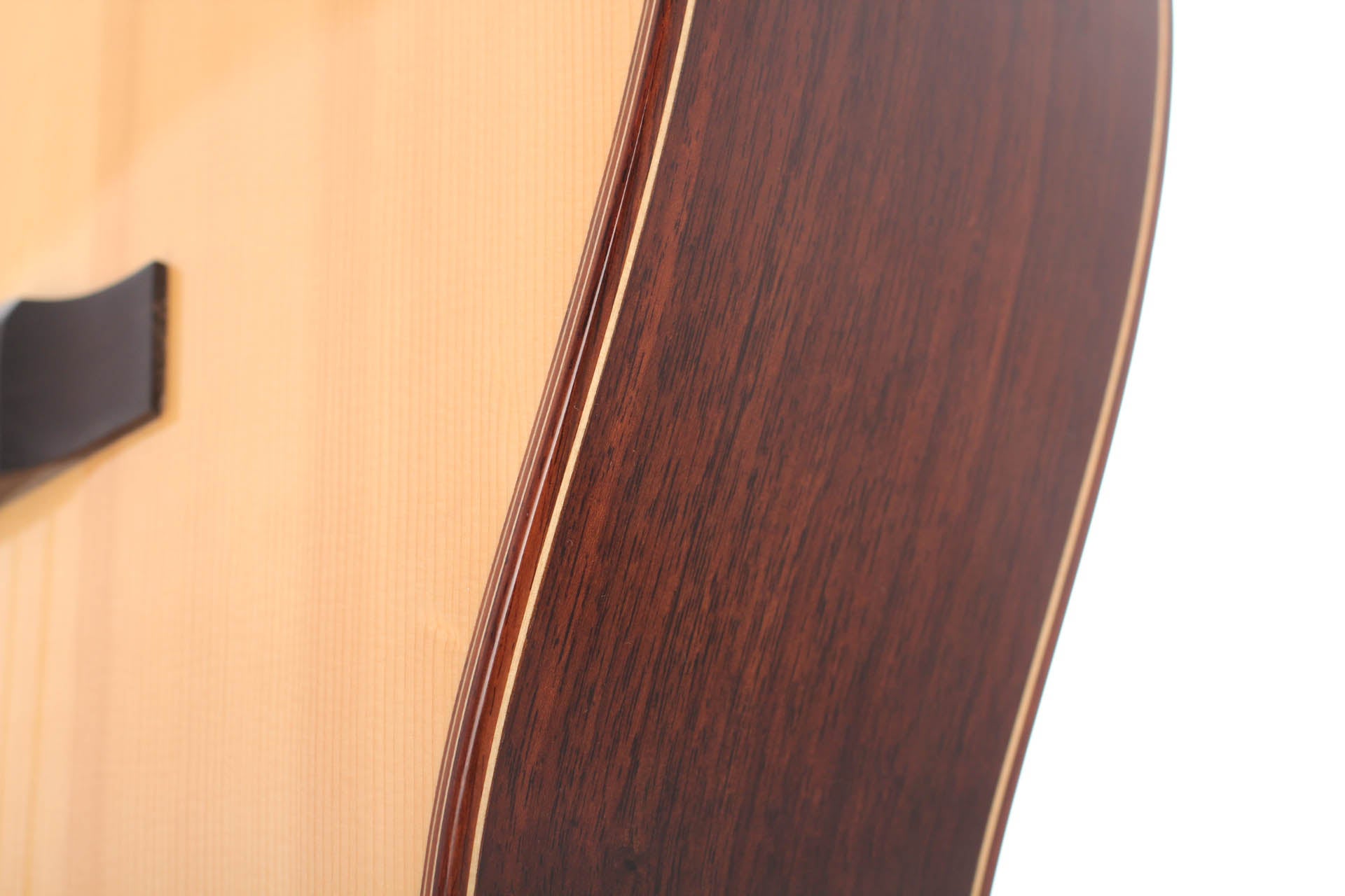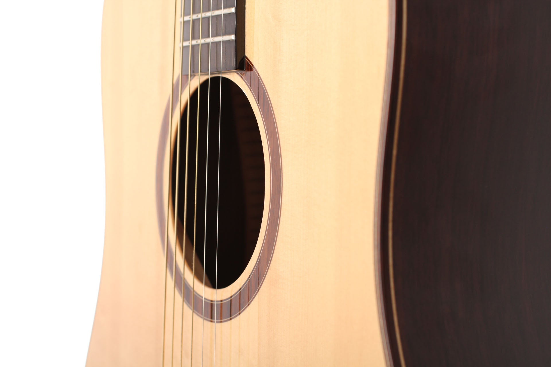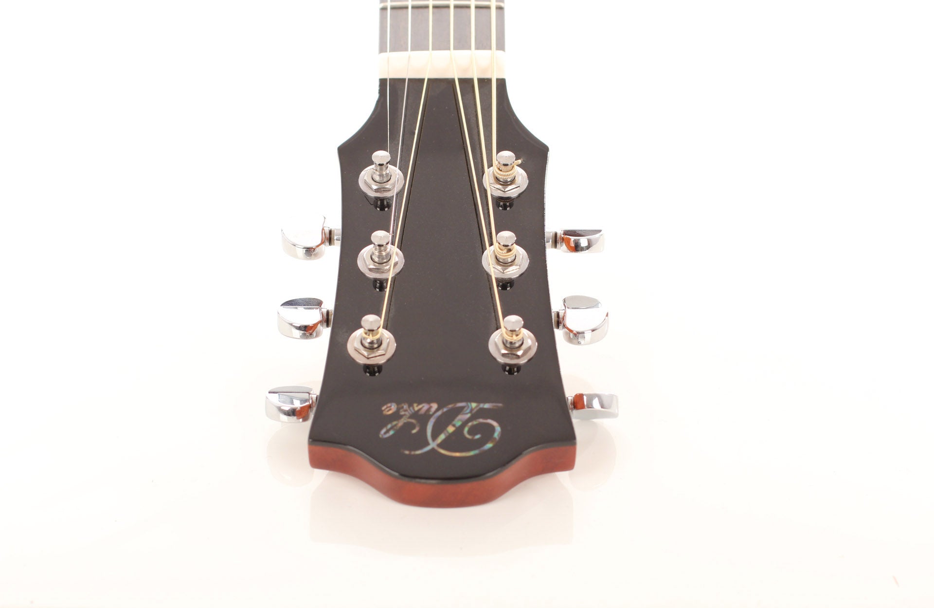 This Duke Dreadnought guitar has an exceptional quality. It has a very powerful and equilibrated sound. This guitar is perfect for beginners and also professional players. The Duke D-PF guitar has a solid spruce top and back and sides that are made of laminated Indian rosewood. The guitars are refined with a high gloss finish. Included is a gig-bag by Duke.