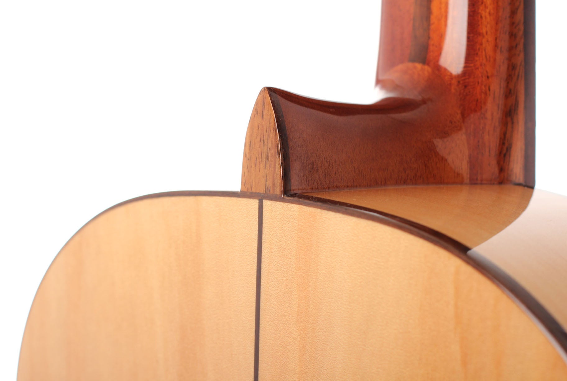 This beautiful Duke Flamenco guitar convinces through it's sound and construction. The top is made of spruce, back and sides are made of very fine cypress. The neck is made of cedro and is reinforced with Indian rosewood. The machine heads are R1 by Rubner, it has an golpeador and a high gloss finish.