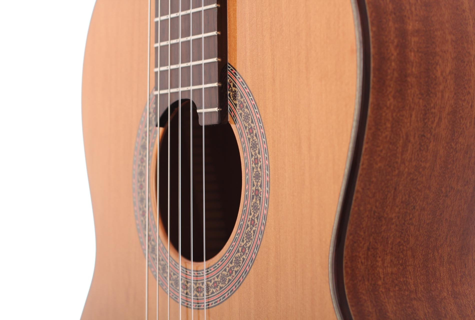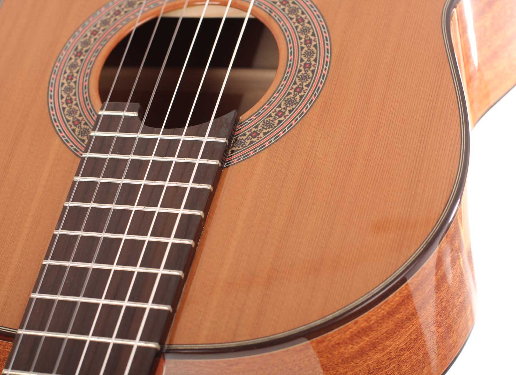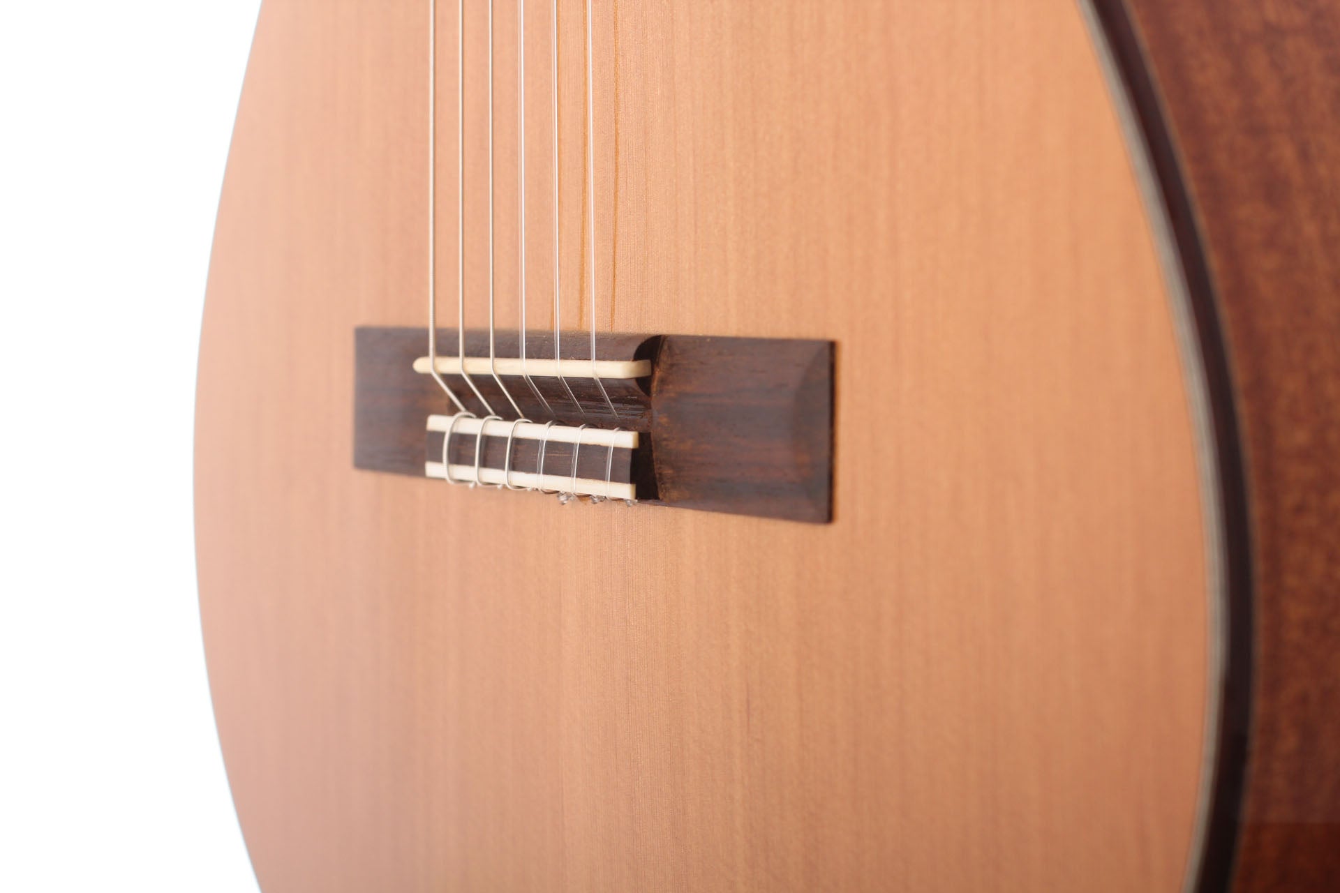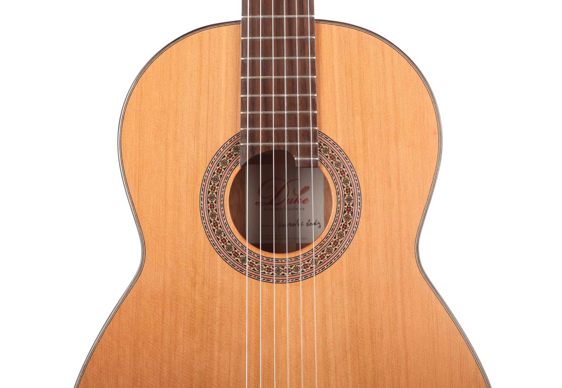 Only strictly selected materials are used for the manufacturing of LaCorda guitars. For example, the tops of the Konzert C models are made exclusively out of Canadian cedar. The back and sides are made of solid mahogany, the neck is made of cedro and has a rosewood reinforcement throughout. The tuners are high-quality Rubner R 1 and the finish is high-gloss lacquer. The Duke Konzert C is a guitar with an excellent price-performance ratio for a full solid guitar of this range. A good quality and versatile instrument with a warm and balanced tone, good projection and easy playability. With a scale length of 63 cm, this model is especially comfortable for growing guitarists or players with smaller hands.