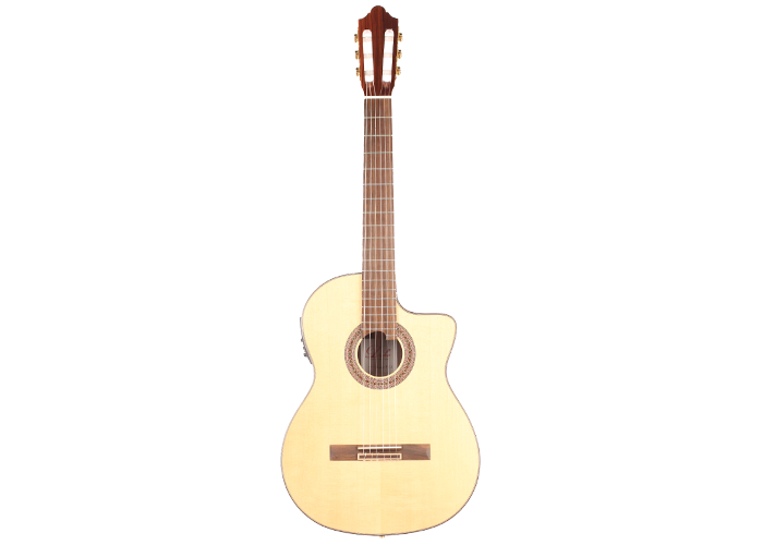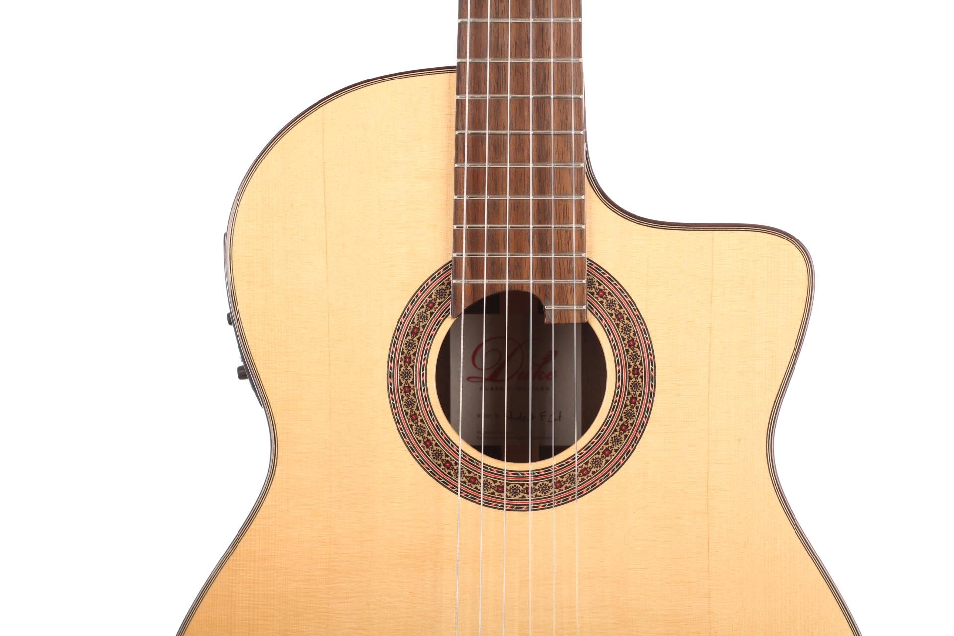 Only selected woods and materials are used for Duke Guitars by LaCorda, a subsidiary company of the famous German guitar workshop. The wood used for building the top of the Student F Cut Pickup comes from Switzerland. Back and sides are made of Indian rosewood. The neck is made of Cedro and is reinforced with Indian rosewood. The tuning machines heads are R2E by Rubner. The guitar has a refined a high gloss finish. The Duke Student F Cut Pickup not only is best value for, but has also got a brilliant and balanced tone, good projection and easy playability.