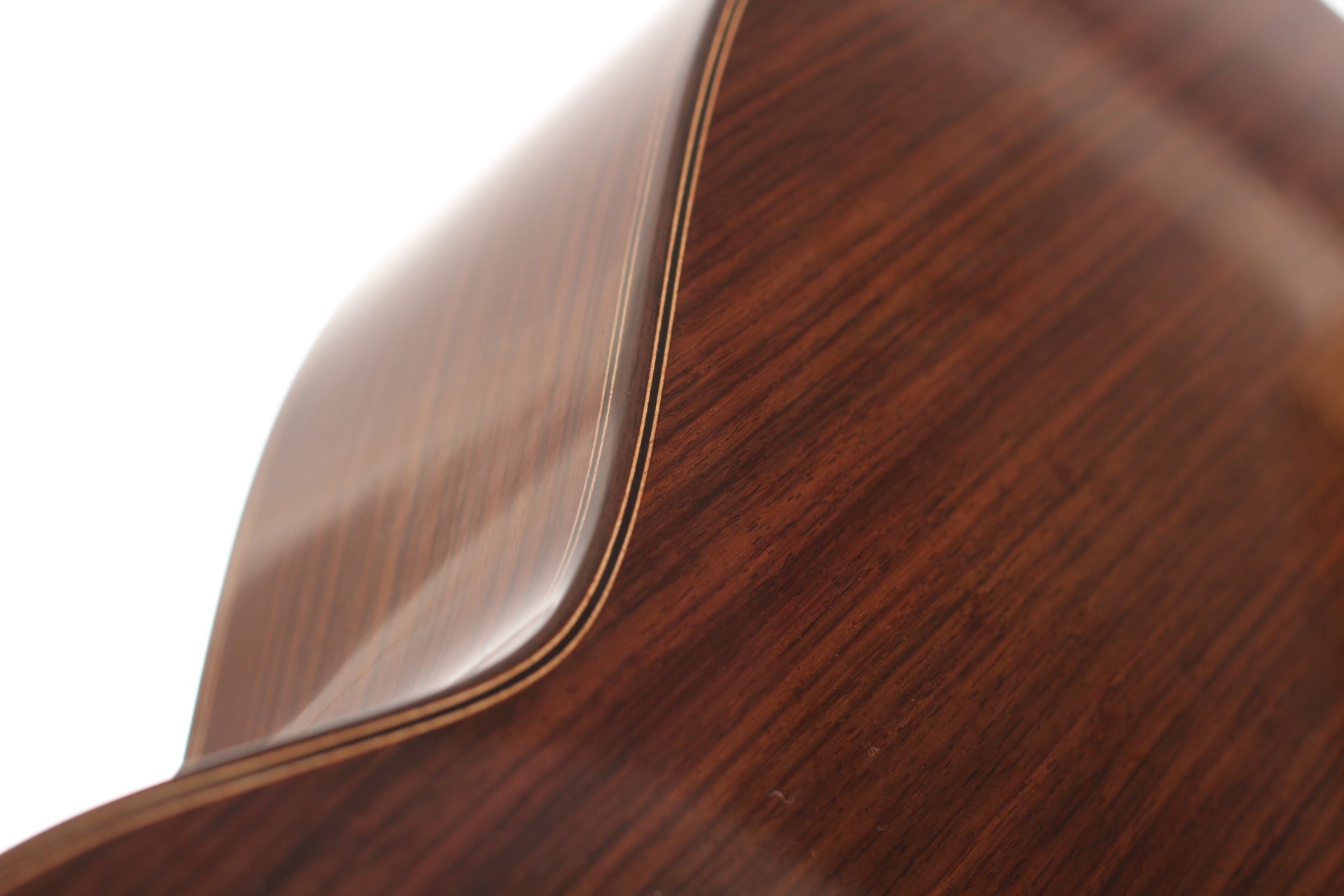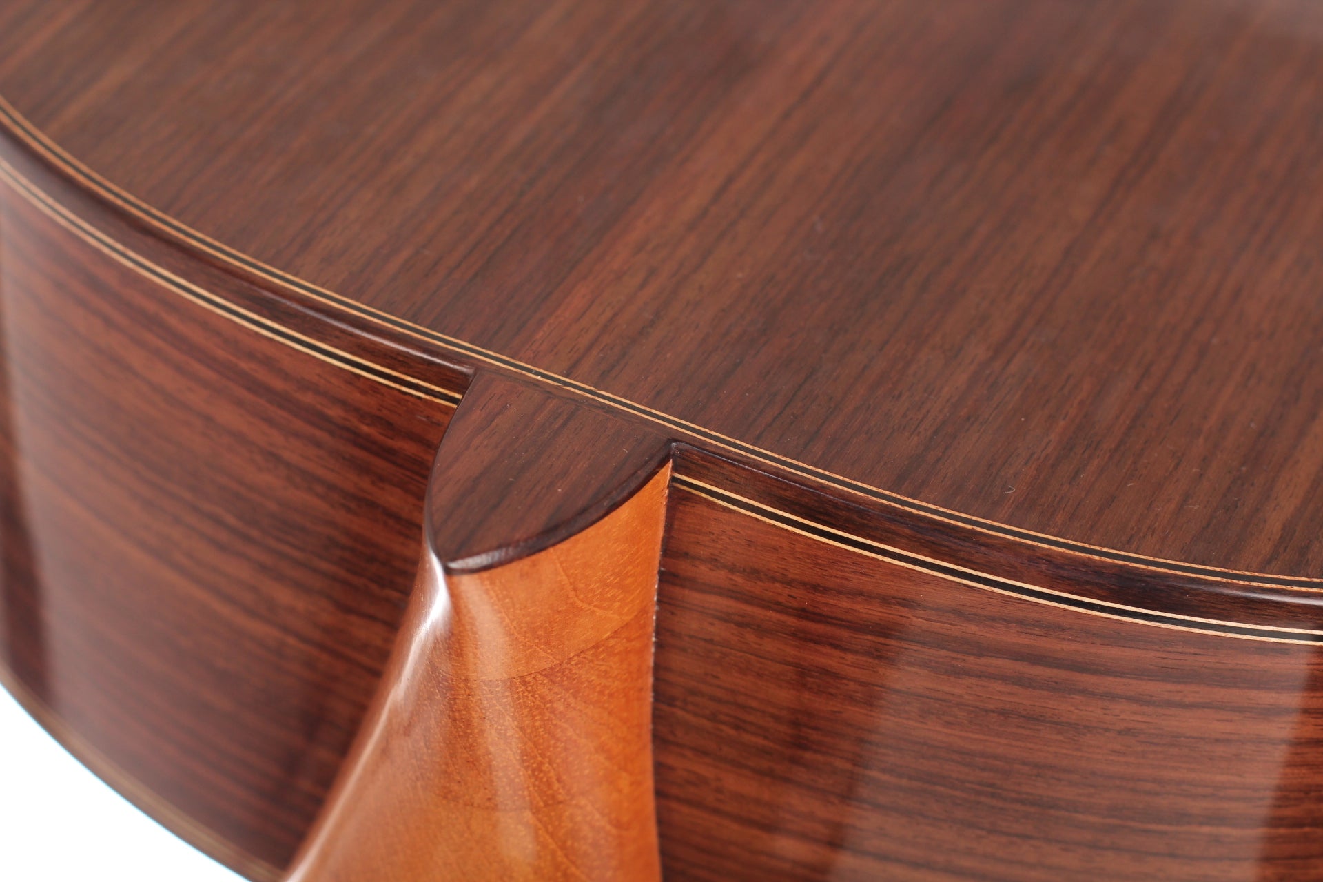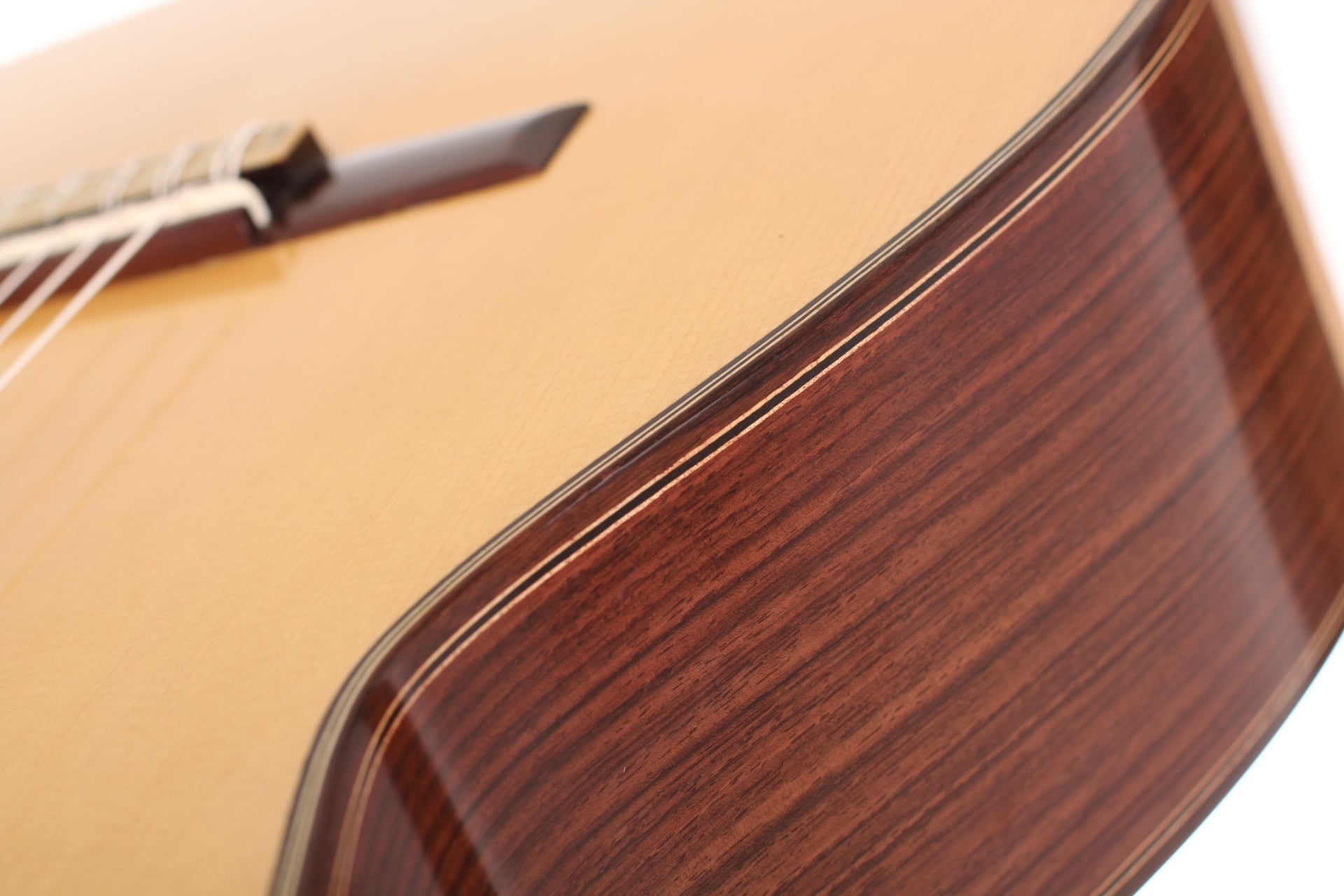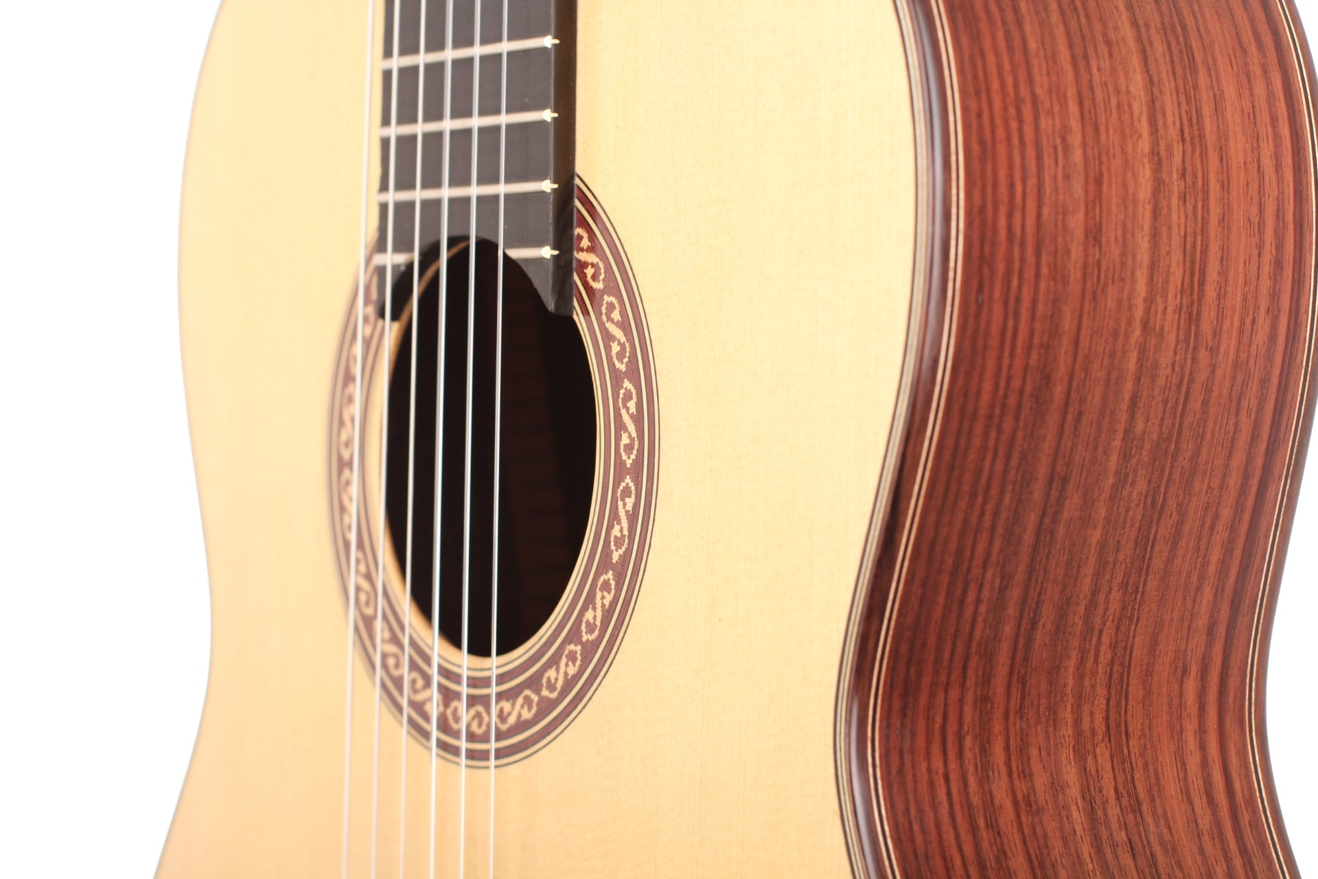This elegant spruce top classical guitar has a very nice rosette with brown shavings. The rosewood bridge is framed with bone inlays. The back and the sides are made of Indian rosewood. The whole guitar is shellac French-polished. About the sound we can say that the guitar has good volume and a round sound. The tuners are made by Rubner. All French-polished. Hardshell case included.