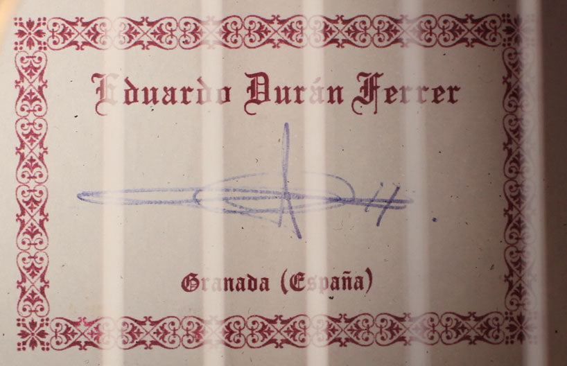 Eduardo Durán Ferrer was born in Granada in 1965, to a family with a long artisan tradition which begun in 1875 with his grandfather’s uncle Benito Ferrer. His grandfather, Eduardo Ferrer, was the teacher of almost every guitar maker in Granada, being also a teacher in the Yamaha guitar factory in Japan (in 1966-67-68).