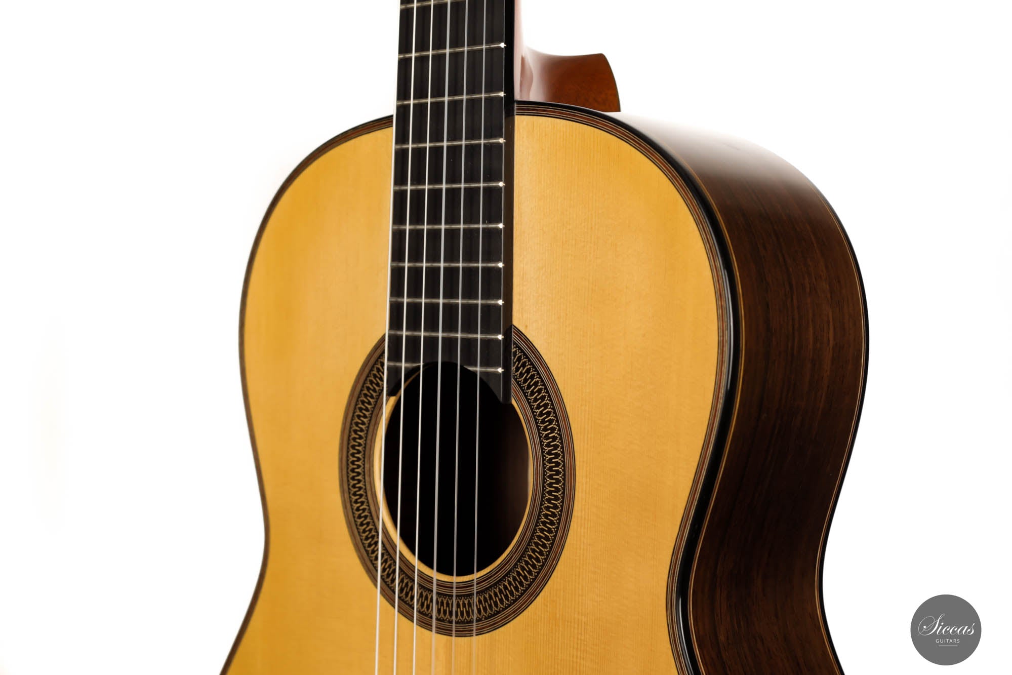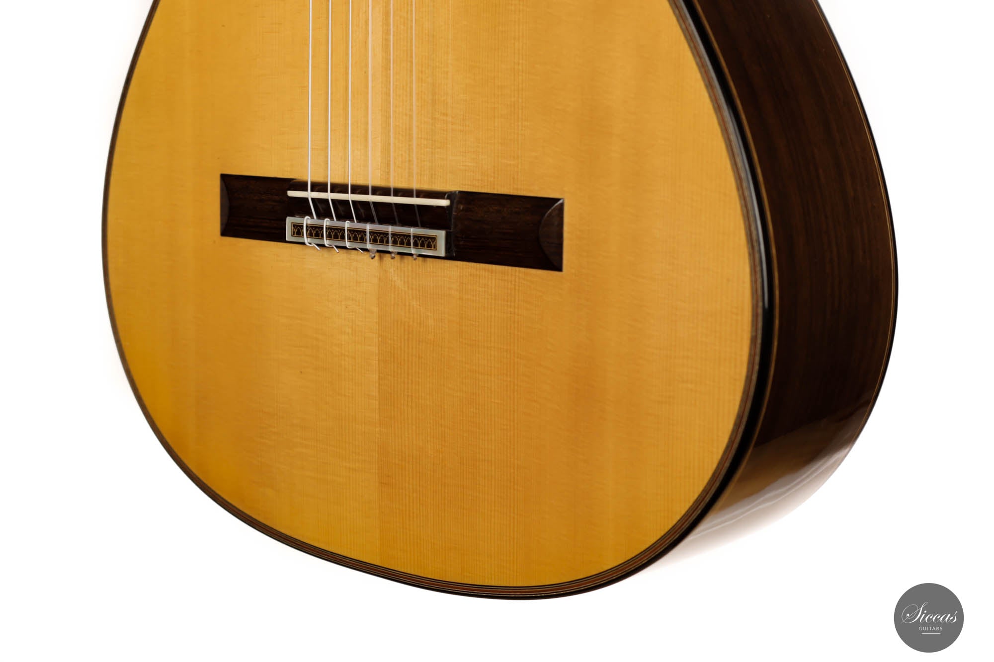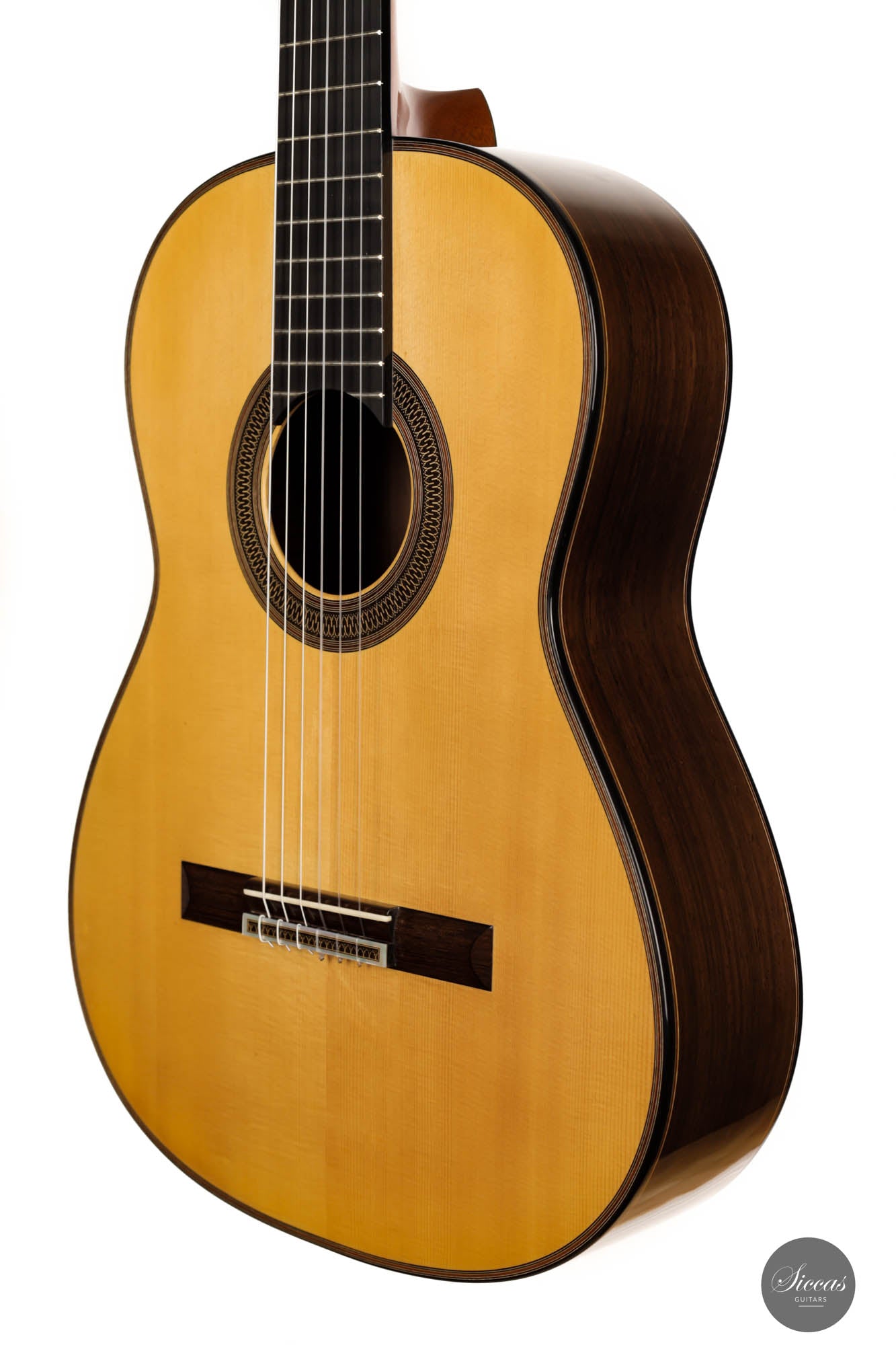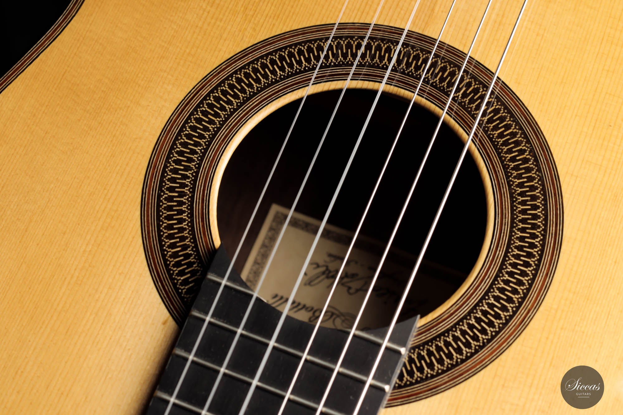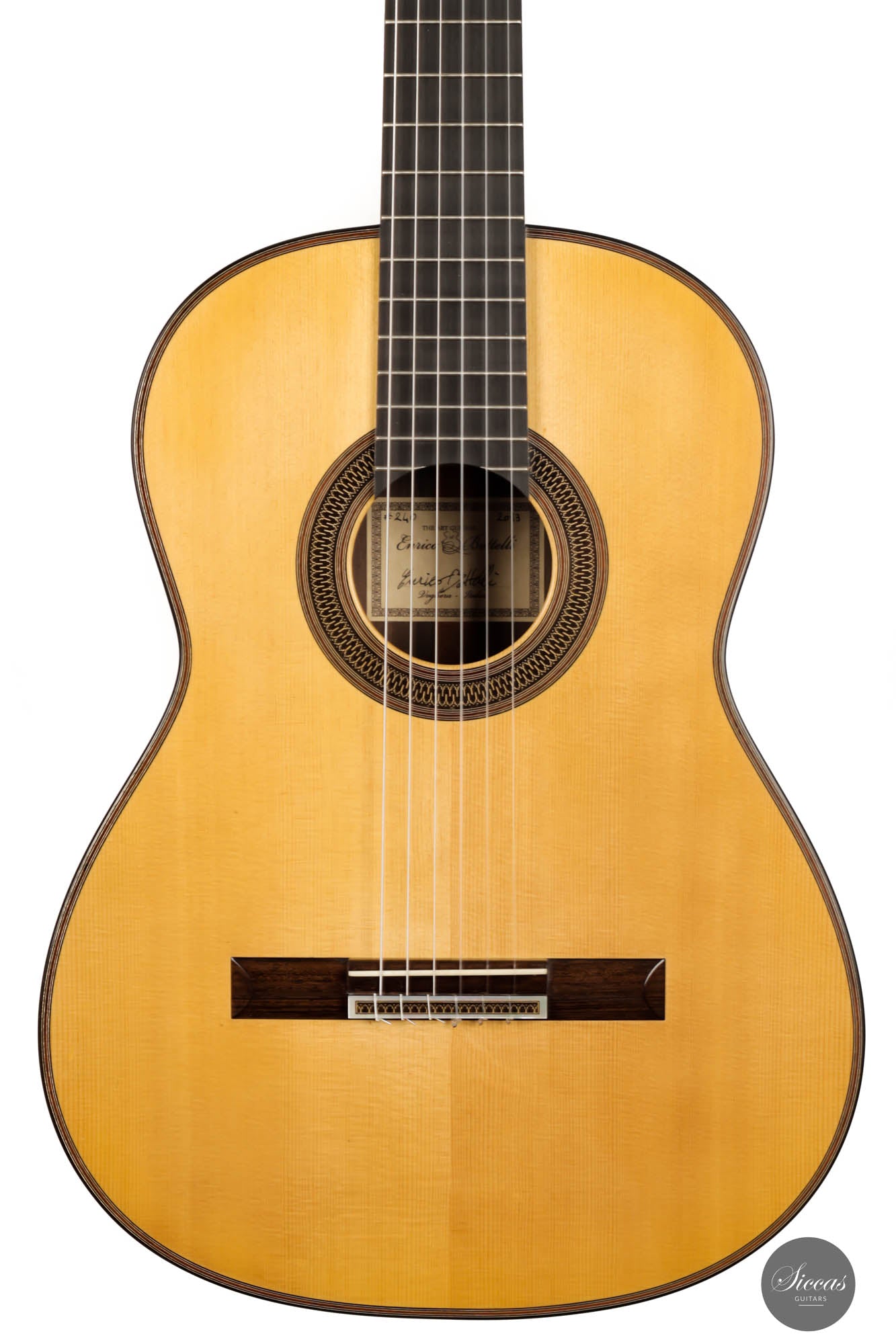 This 2013 Enrico Bottelli guitar is truly a masterpiece, showcasing exquisite craftsmanship and attention to detail, a hallmark of his work. This guitar is heavily inspired by a famous German guitar from 1938, which is evident in its design and construction. The spruce soundboard and meticulous Amazonas rosewood back and sides are breathtakingly beautiful, and their contribution to the guitar's sound is significant. Despite being built in 2013, this guitar is in immaculate condition, a testament to the care and maintenance it has received. This instrument has been lovingly cared for, allowing it to age gracefully and develop a tonal quality that is simply breathtaking. The guitar's crystal-clear trebles and deep, punchy basses are pleasing to the ear and incredibly versatile. In addition to its tonal quality, this Enrico Bottelli guitar offers an endless tonal palette, giving guitarists the freedom to experiment with different playing styles. Whether playing classical or contemporary music, this guitar can adapt to the musician's style and deliver a simply unforgettable sound. Overall, this Enrico Bottelli guitar is a remarkable instrument that combines beauty, craftsmanship, and excellent sound quality. It is a testament to the skill and dedication of Enrico Bottelli and serves as a reminder of the artistry that goes into crafting such exquisite musical instruments. This particular guitar offers a chance to immediately bypass the waiting list and acquire a magnificent instrument. It is a rare opportunity for guitar enthusiasts and collectors to own an important instrument crafted by a master luthier.