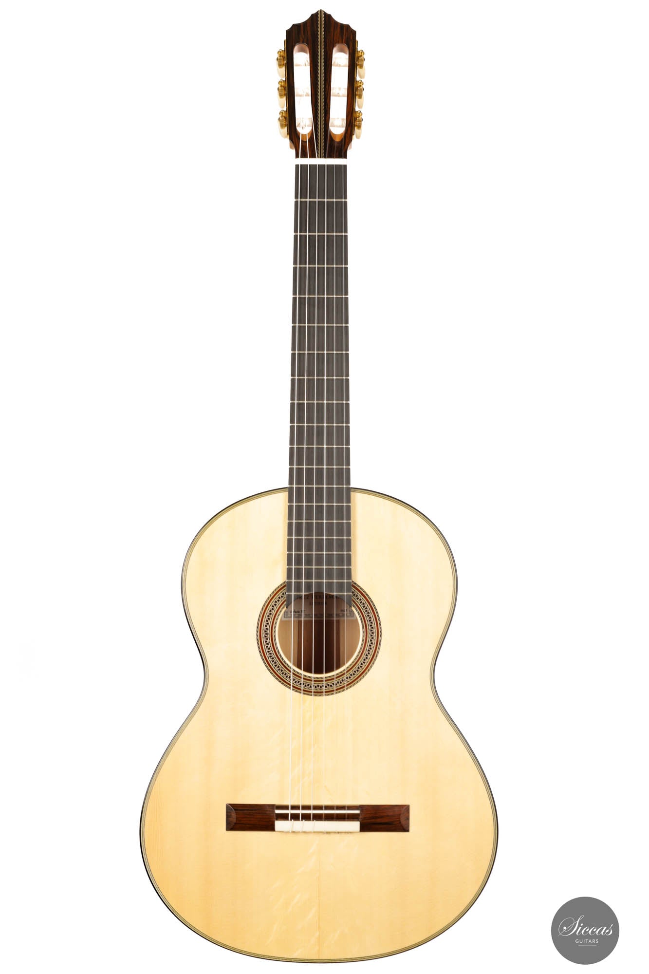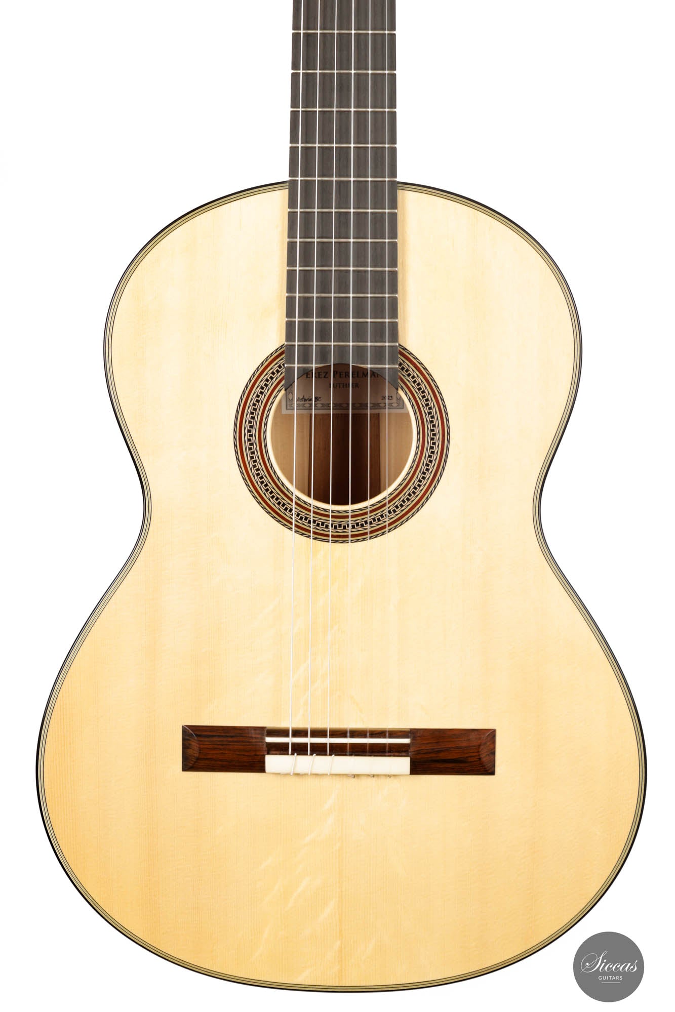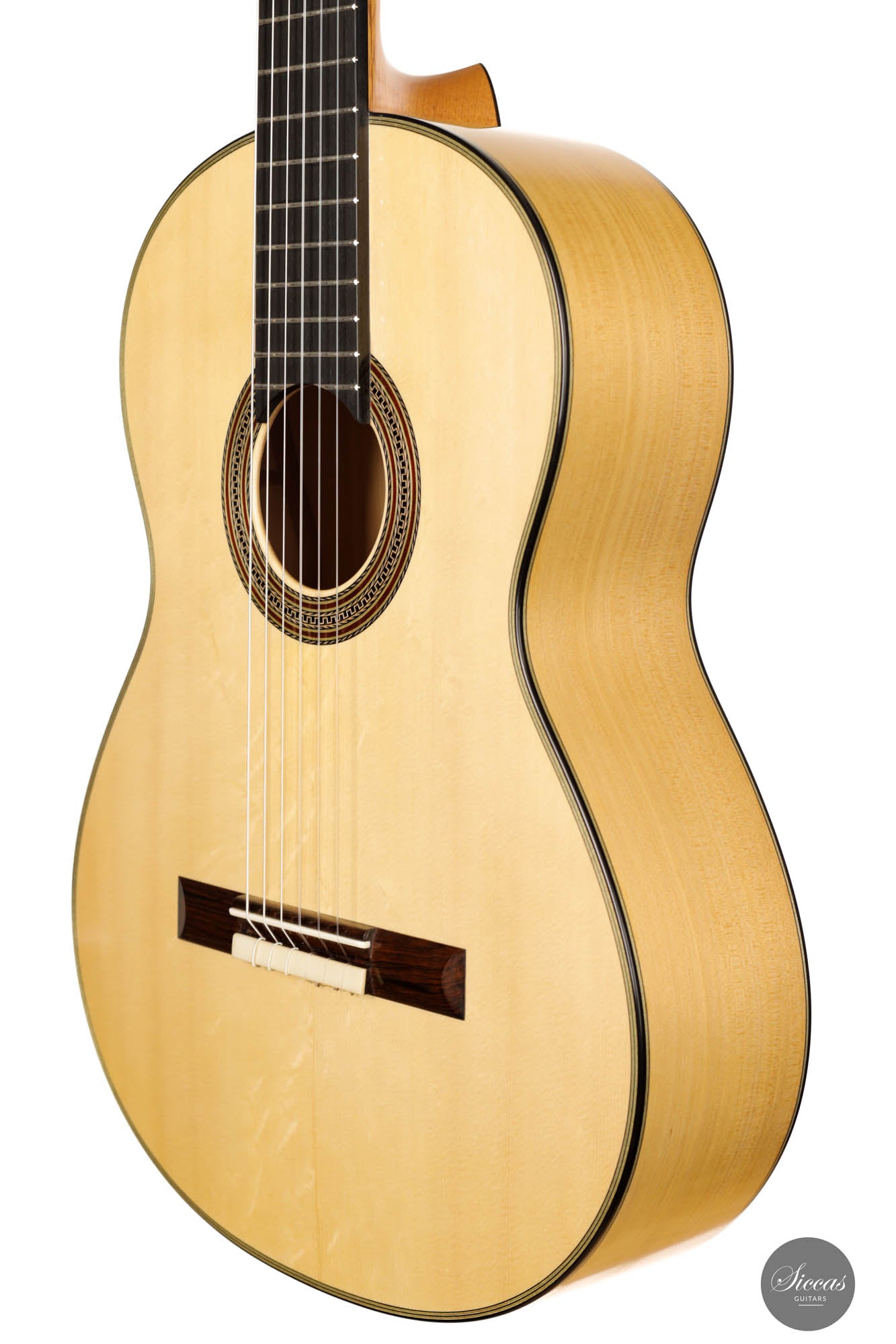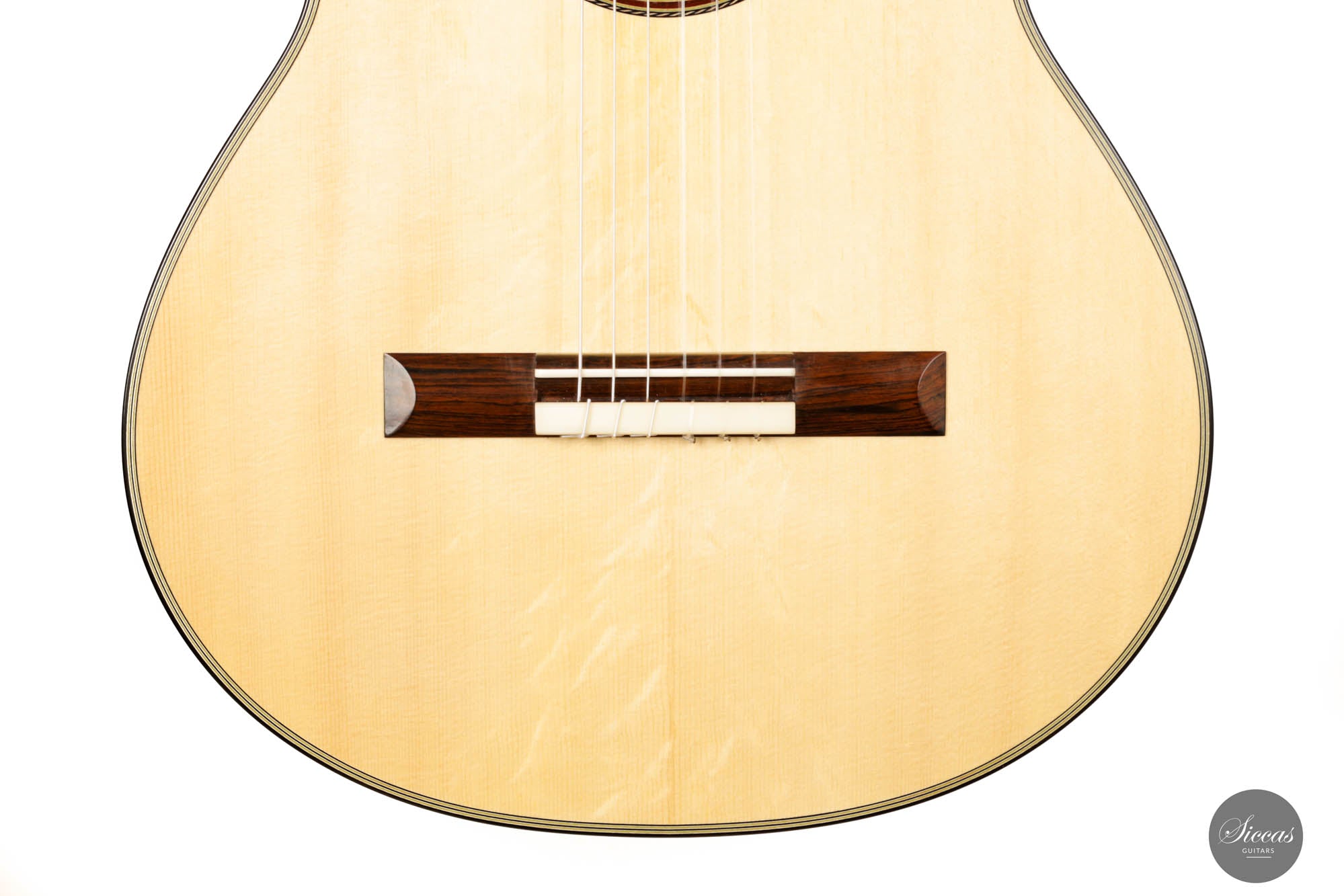 This magnificent concert guitar stands as a testament to Erez Perelman's craftsmanship. He endowed it with an impeccable aesthetic, a distinctive sound, and a captivating aroma by opting for a splendid Israeli cypress for the back and sides. This rare timber resonates with exceptional acoustic properties, bestowing the sound with an extraordinary quality. Tuned deeply, the guitar radiates a pleasantly rounded and warm tone. The bass E string thrums with a dense, intricate complexity and sustain, while its counterpart, the treble E string, serenades with a voice that's both elegant and distinct. Playing this guitar is an absolute delight, offering abundant vibrations to the guitarist's left hand and chest. Furthermore, this instrument appears almost untouched, showing barely any signs of wear. Altogether, it represents a premium traditional guitar crafted by a sought-after luthier with a very limited output.