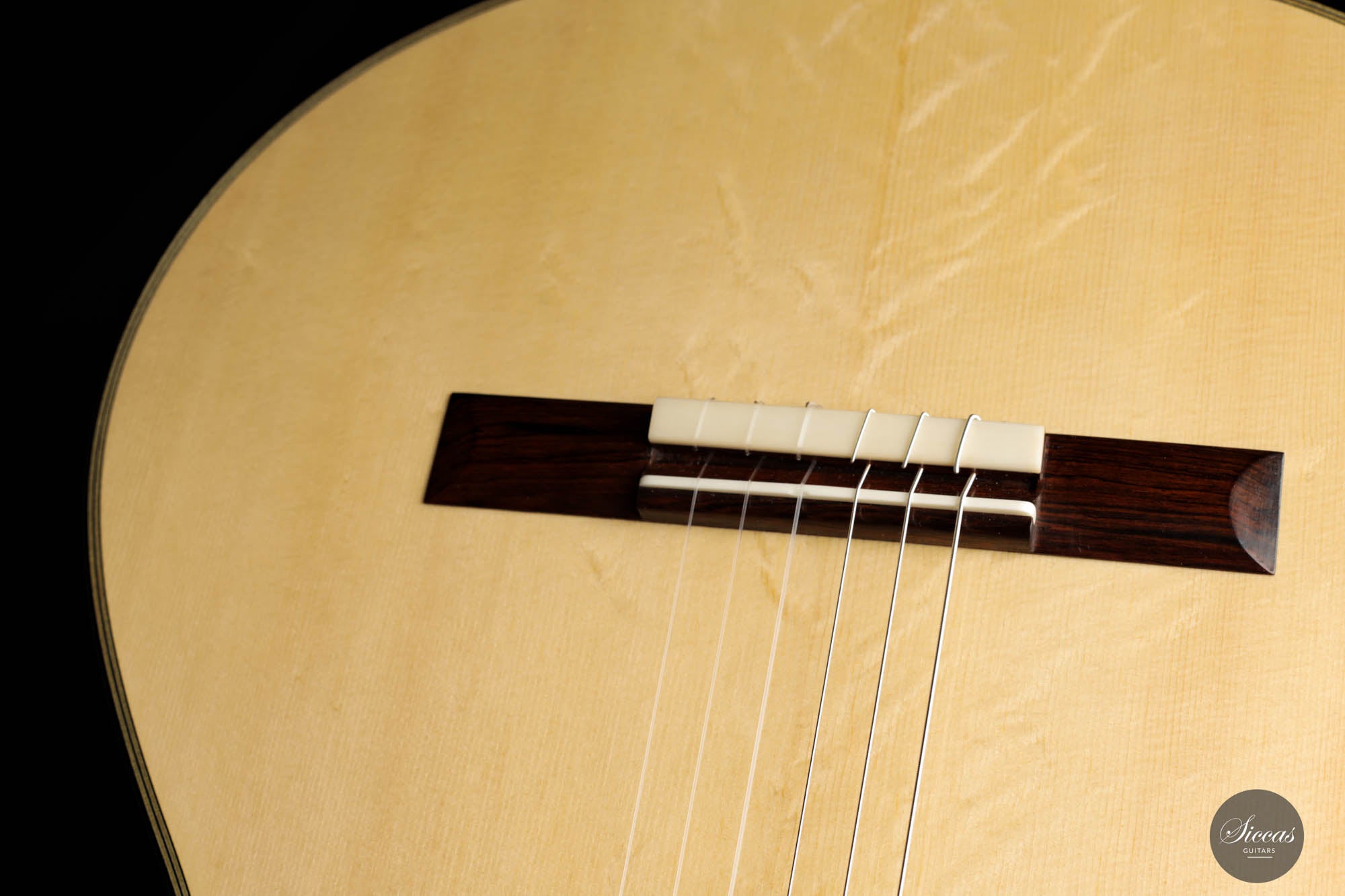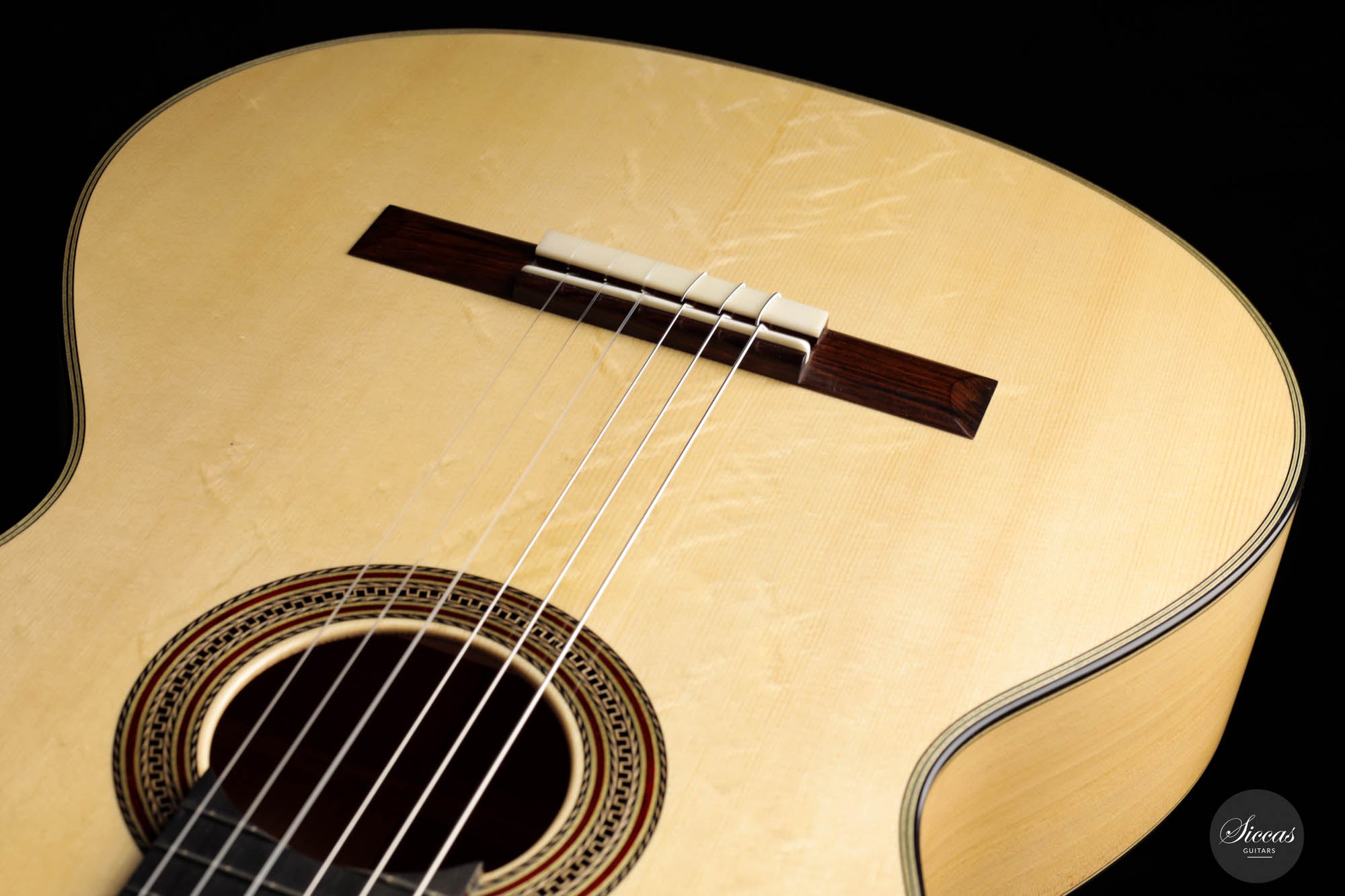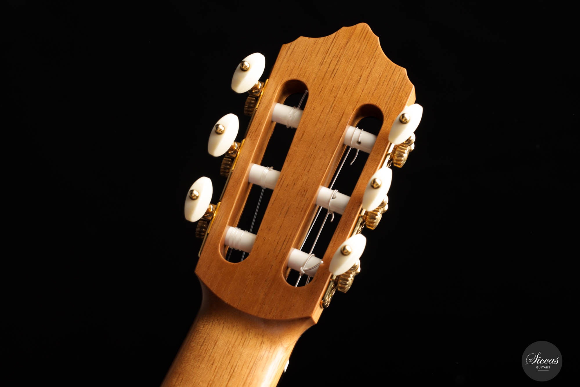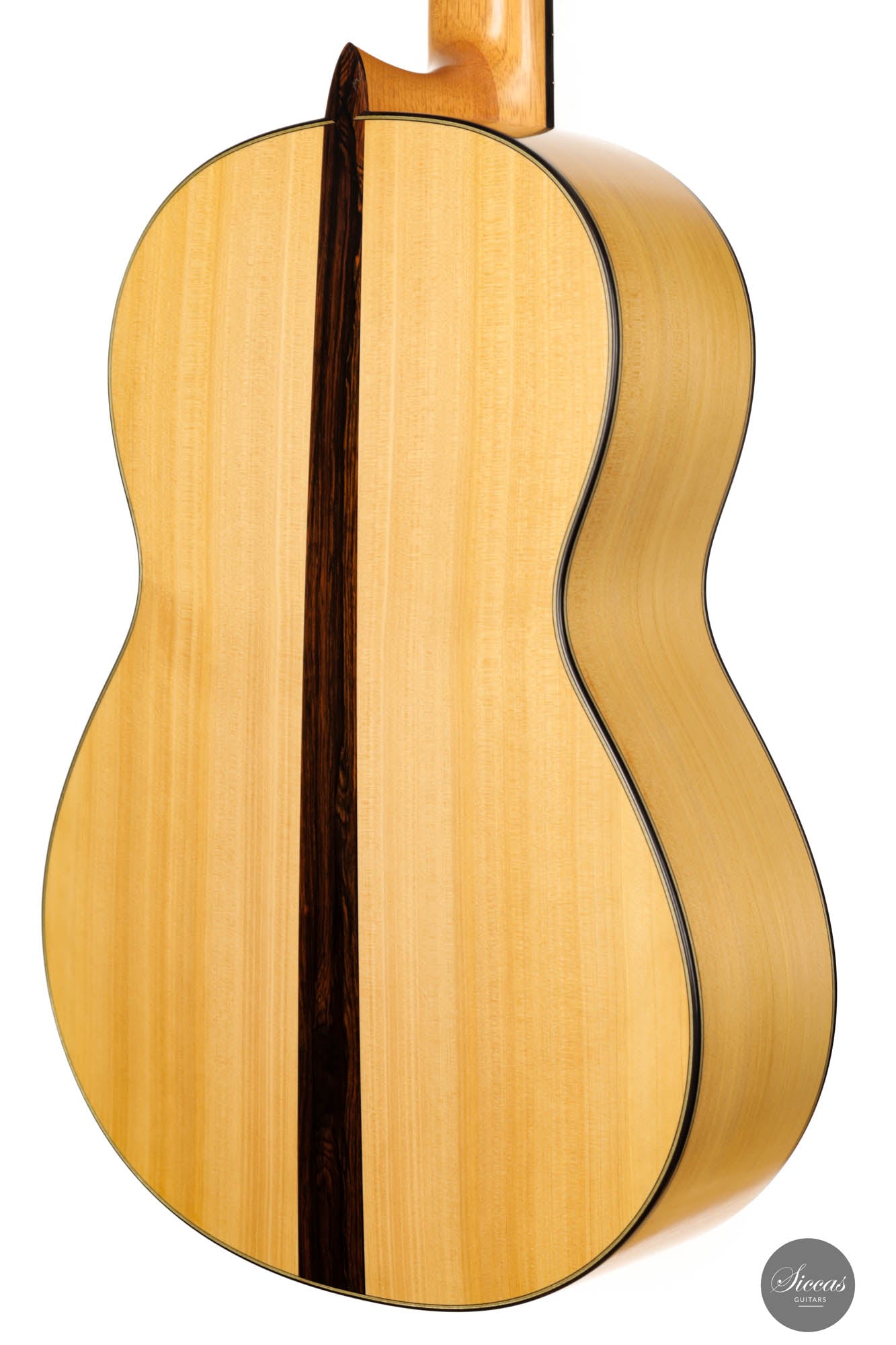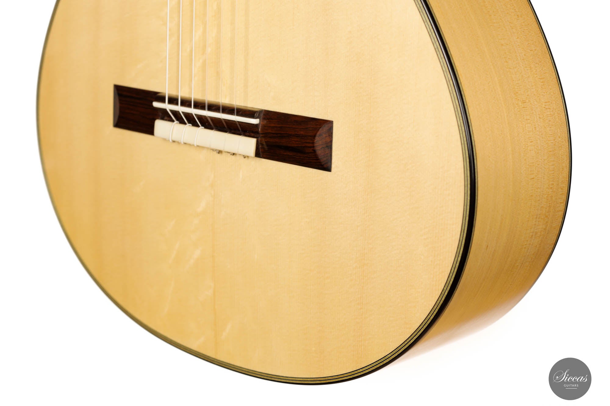 This magnificent concert guitar stands as a testament to Erez Perelman's craftsmanship. He endowed it with an impeccable aesthetic, a distinctive sound, and a captivating aroma by opting for a splendid Israeli cypress for the back and sides. This rare timber resonates with exceptional acoustic properties, bestowing the sound with an extraordinary quality. Tuned deeply, the guitar radiates a pleasantly rounded and warm tone. The bass E string thrums with a dense, intricate complexity and sustain, while its counterpart, the treble E string, serenades with a voice that's both elegant and distinct. Playing this guitar is an absolute delight, offering abundant vibrations to the guitarist's left hand and chest. Furthermore, this instrument appears almost untouched, showing barely any signs of wear. Altogether, it represents a premium traditional guitar crafted by a sought-after luthier with a very limited output.