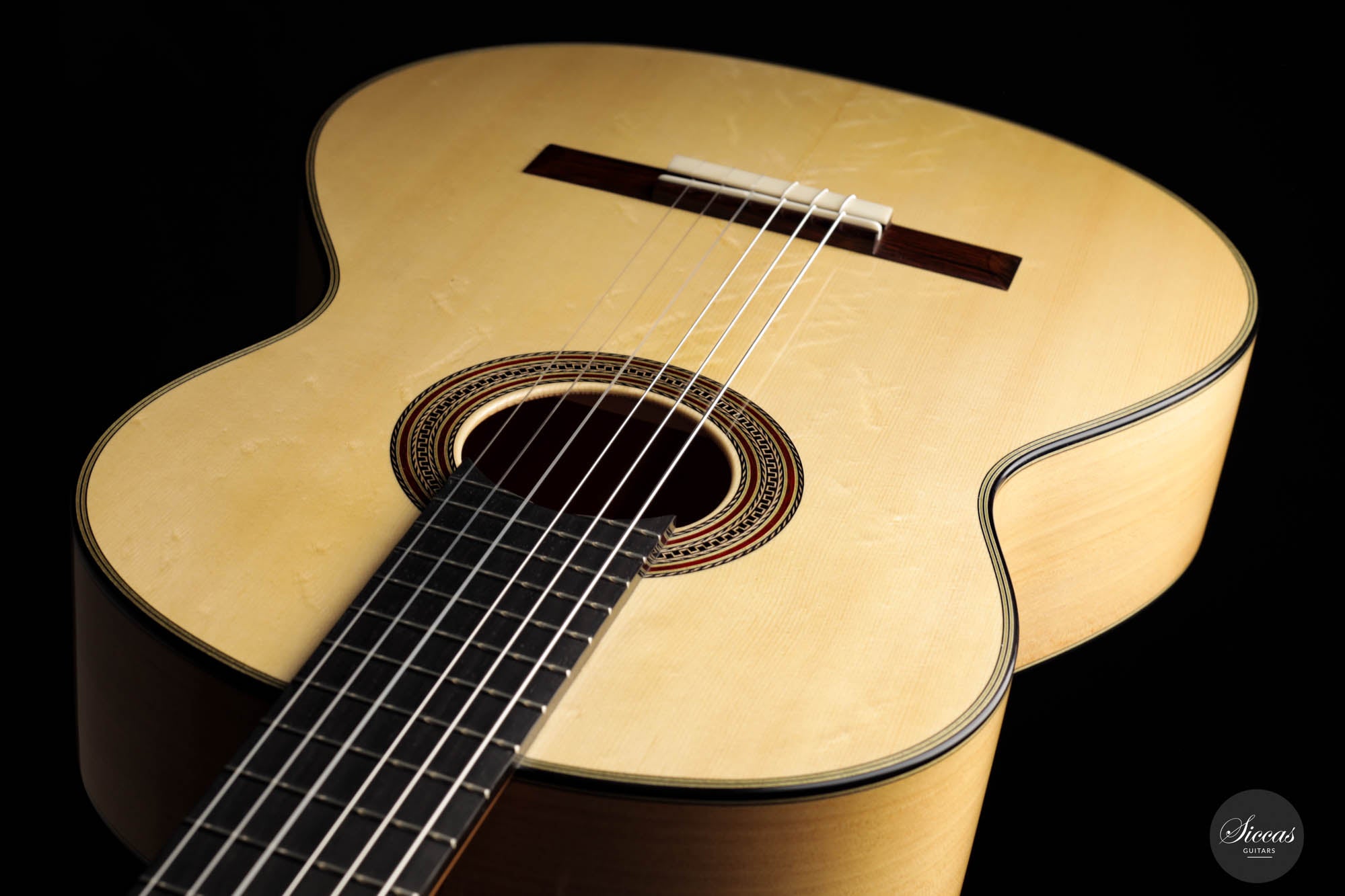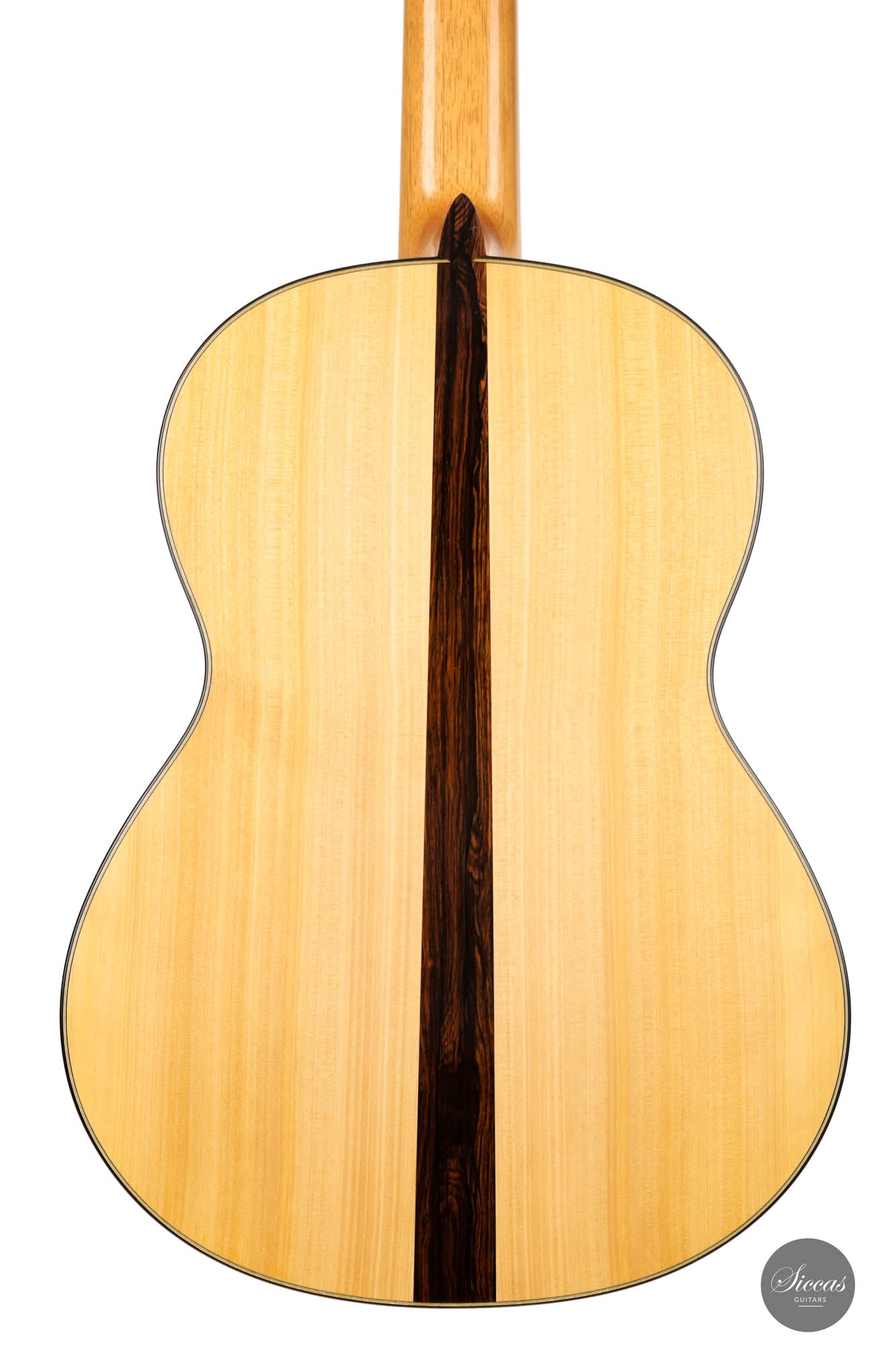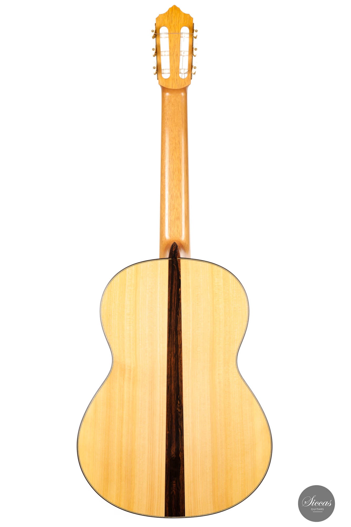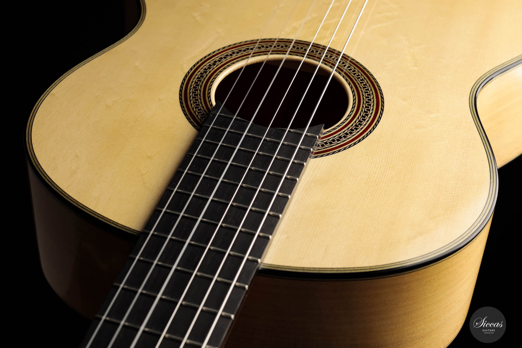 This magnificent concert guitar stands as a testament to Erez Perelman's craftsmanship. He endowed it with an impeccable aesthetic, a distinctive sound, and a captivating aroma by opting for a splendid Israeli cypress for the back and sides. This rare timber resonates with exceptional acoustic properties, bestowing the sound with an extraordinary quality. Tuned deeply, the guitar radiates a pleasantly rounded and warm tone. The bass E string thrums with a dense, intricate complexity and sustain, while its counterpart, the treble E string, serenades with a voice that's both elegant and distinct. Playing this guitar is an absolute delight, offering abundant vibrations to the guitarist's left hand and chest. Furthermore, this instrument appears almost untouched, showing barely any signs of wear. Altogether, it represents a premium traditional guitar crafted by a sought-after luthier with a very limited output.