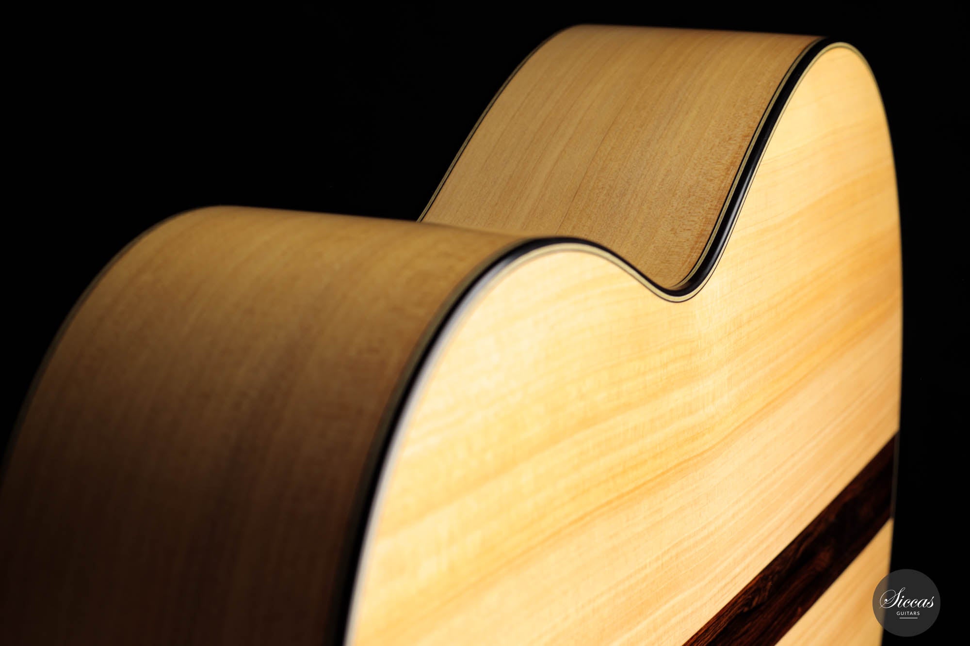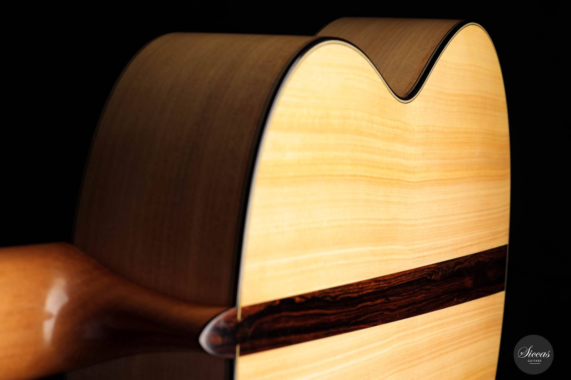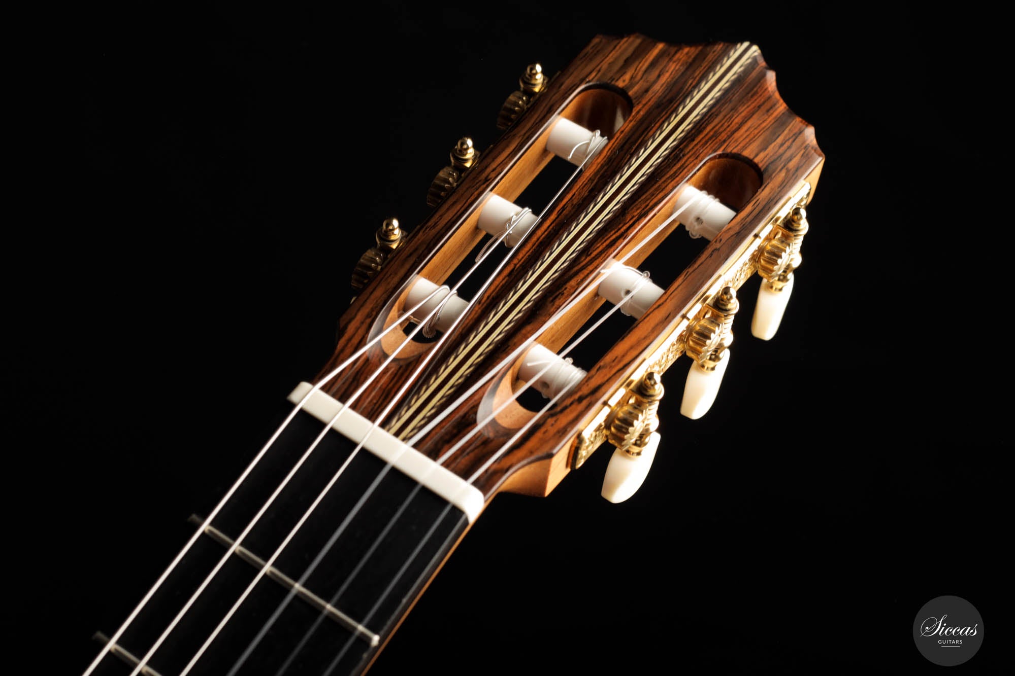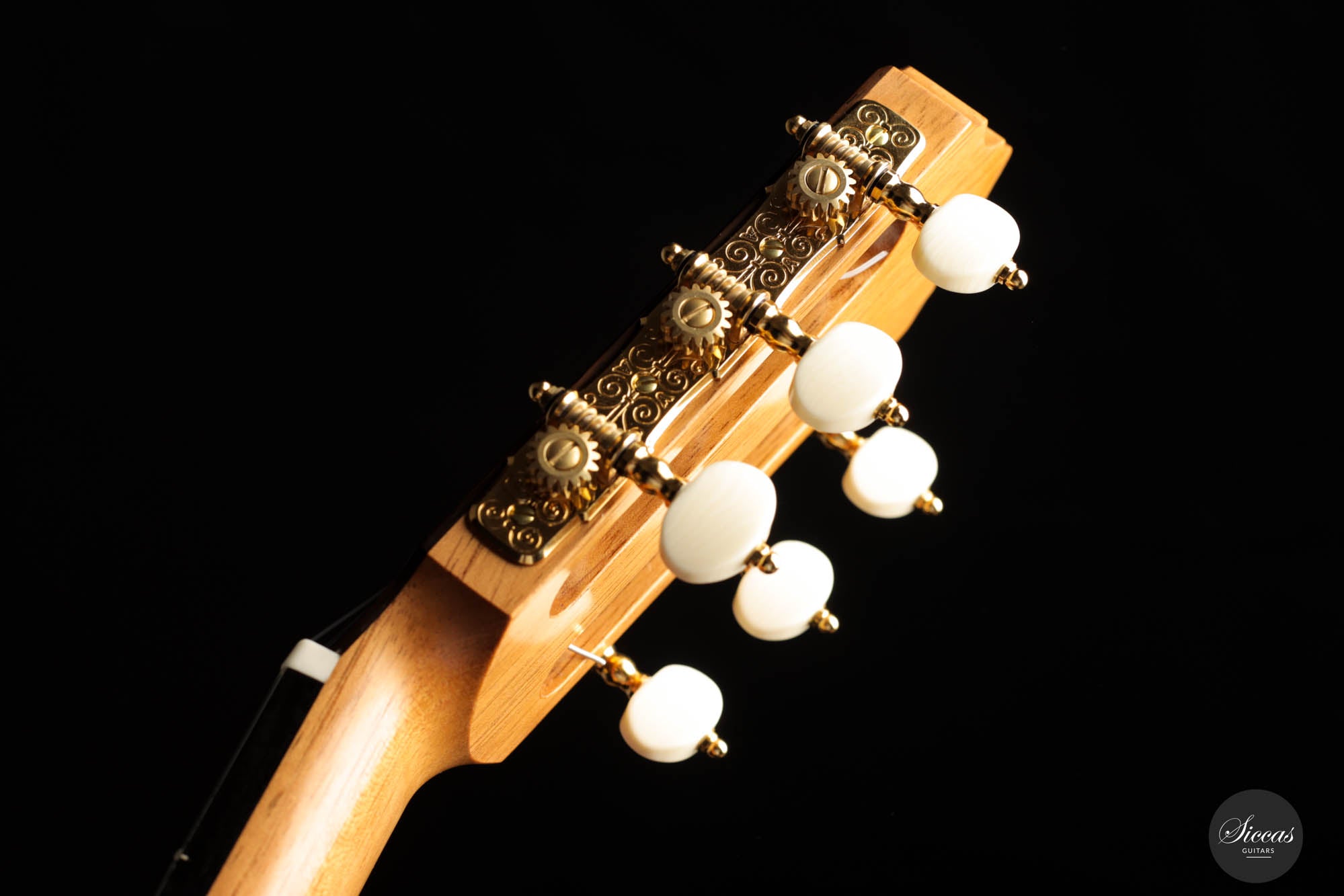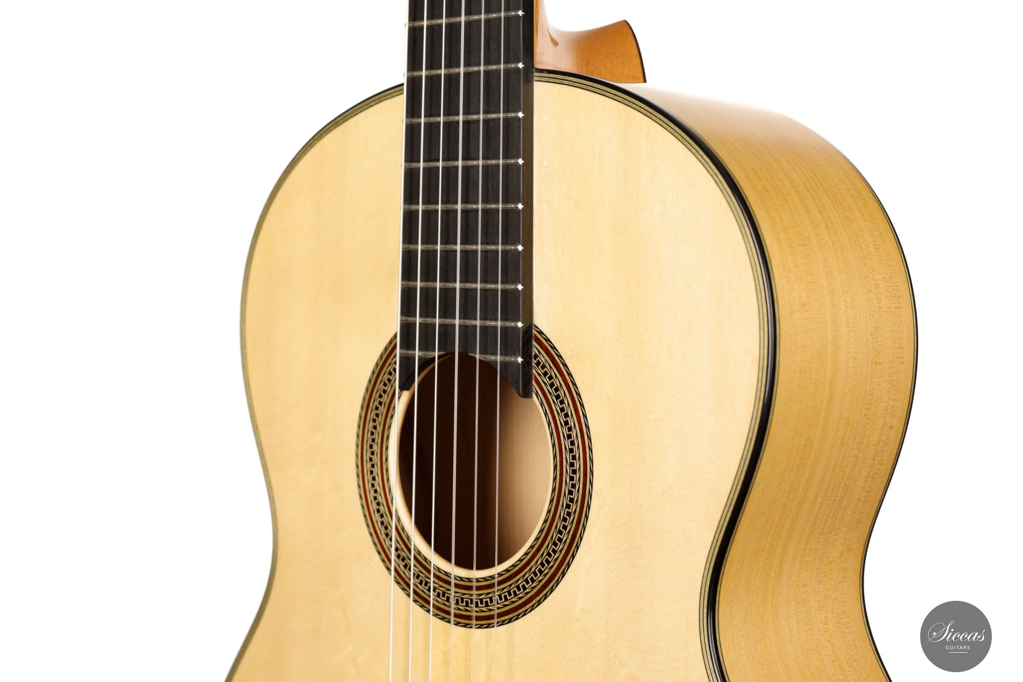 This magnificent concert guitar stands as a testament to Erez Perelman's craftsmanship. He endowed it with an impeccable aesthetic, a distinctive sound, and a captivating aroma by opting for a splendid Israeli cypress for the back and sides. This rare timber resonates with exceptional acoustic properties, bestowing the sound with an extraordinary quality. Tuned deeply, the guitar radiates a pleasantly rounded and warm tone. The bass E string thrums with a dense, intricate complexity and sustain, while its counterpart, the treble E string, serenades with a voice that's both elegant and distinct. Playing this guitar is an absolute delight, offering abundant vibrations to the guitarist's left hand and chest. Furthermore, this instrument appears almost untouched, showing barely any signs of wear. Altogether, it represents a premium traditional guitar crafted by a sought-after luthier with a very limited output.