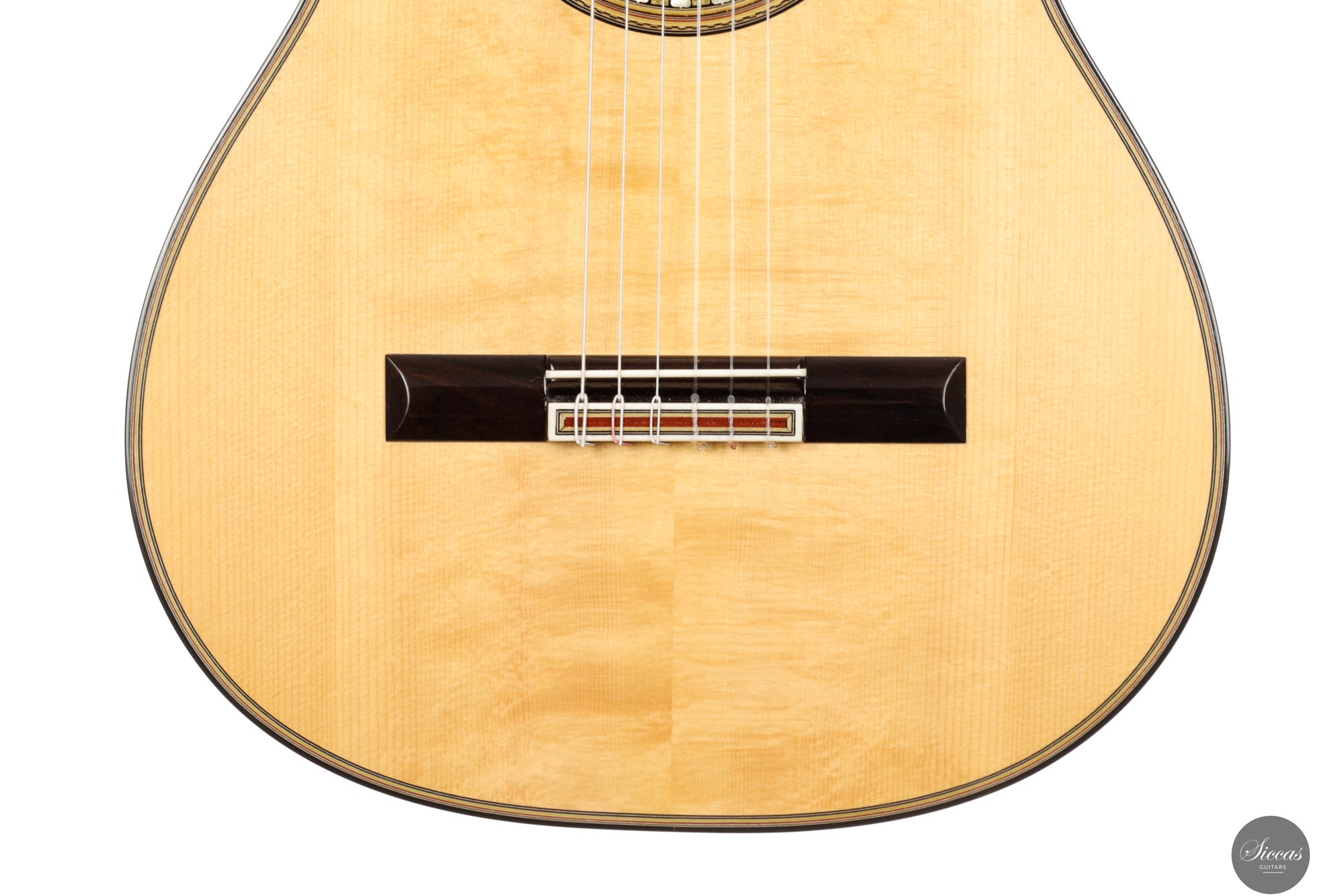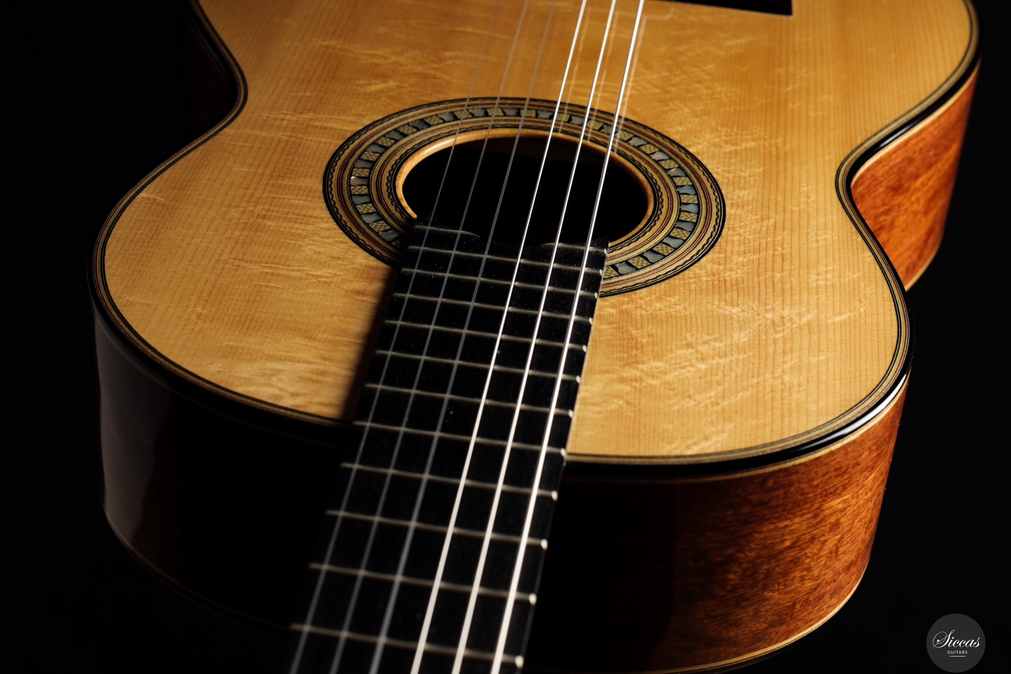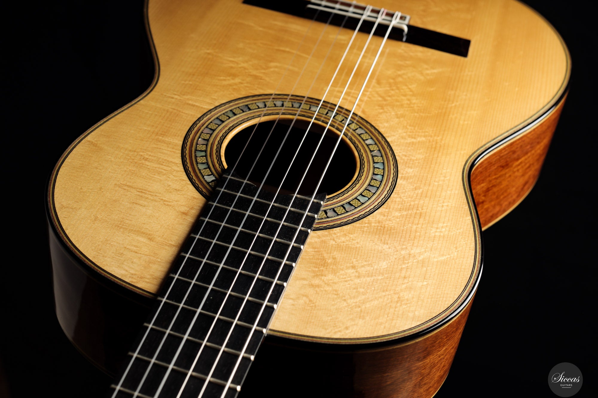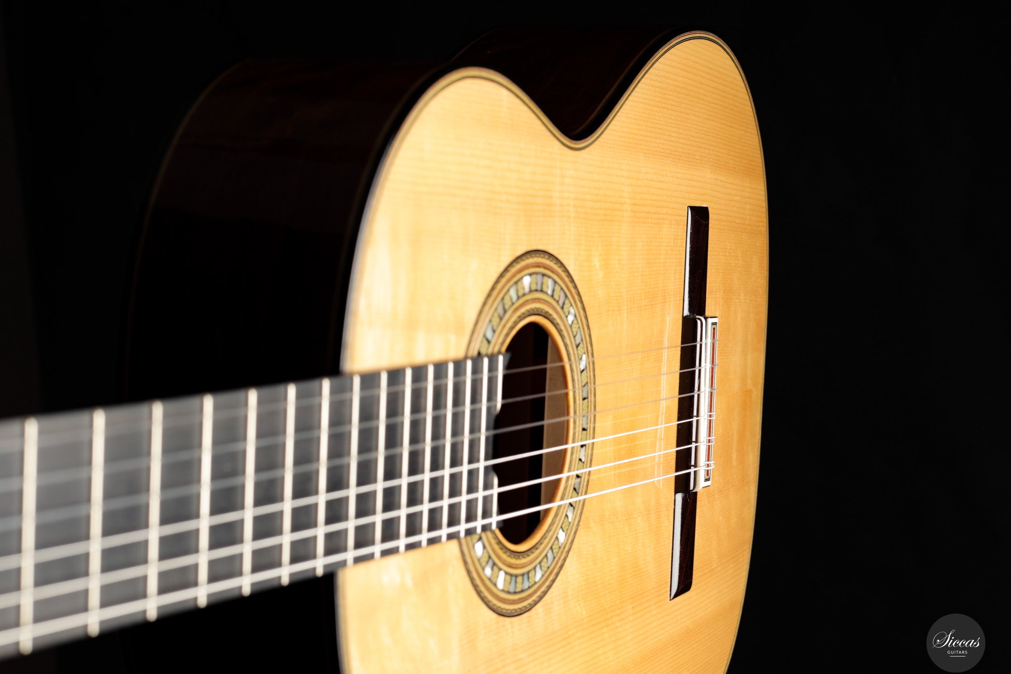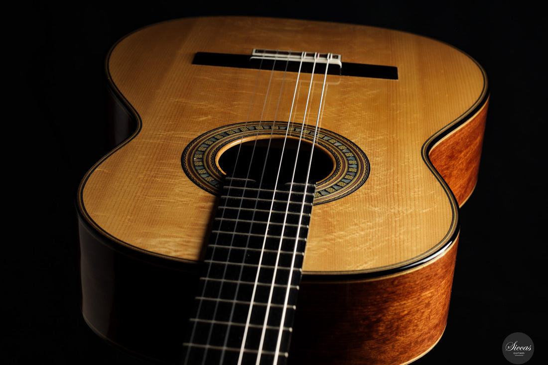 Tonally, the guitar offers a broad range of color and dynamics. The F-tuned air resonance contributes to a warm and open fundamental, while the spruce top provides clarity and projection, and the Caribbean rosewood supports depth and harmonic complexity. The instrument responds with precision to subtle right-hand nuance, offering intimacy, control, and lyrical flexibility. Though firmly rooted in traditional construction, this guitar is highly suited to contemporary concert performance, inviting an expressive and immersive playing experience.