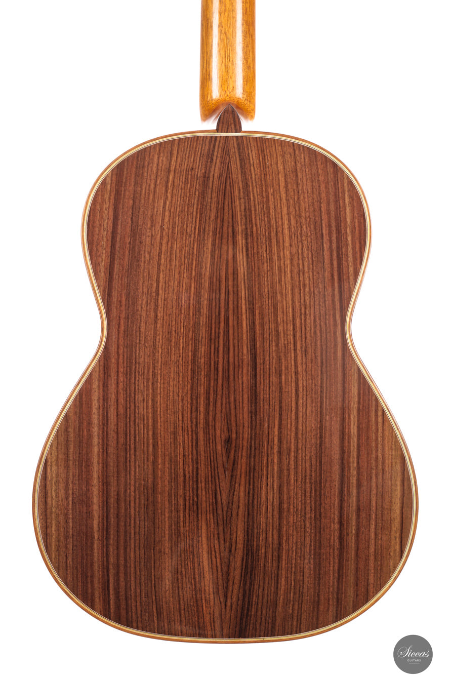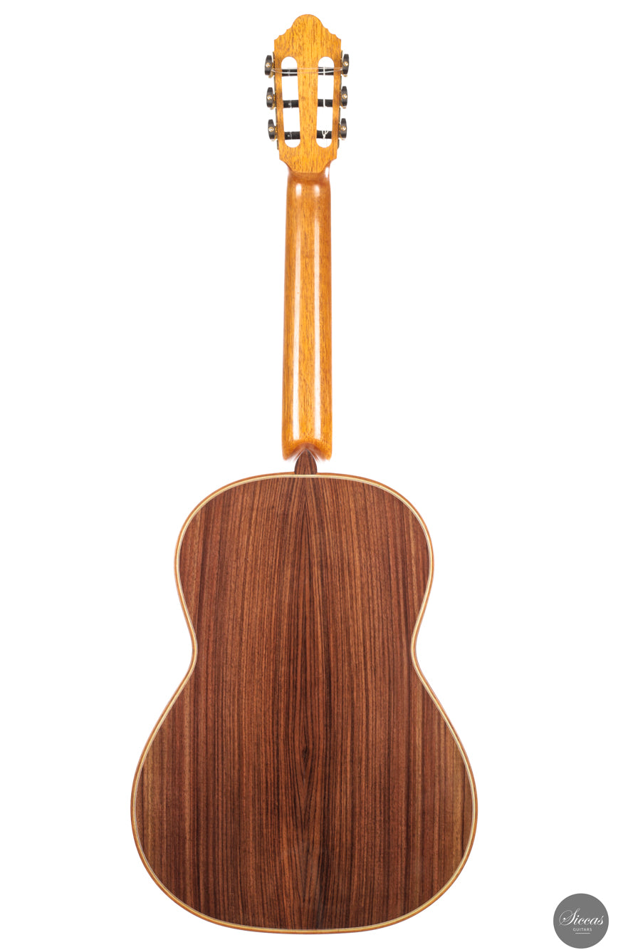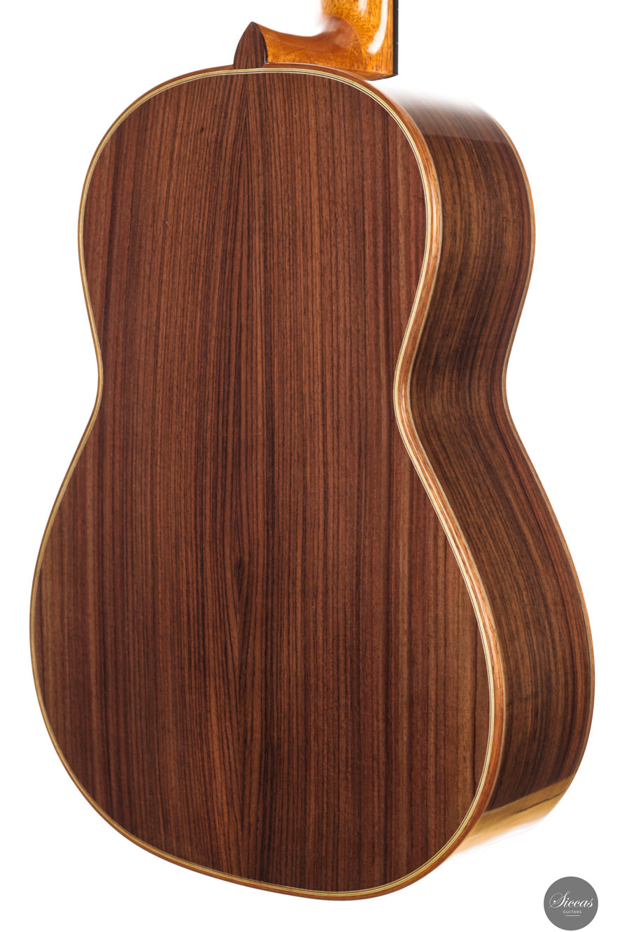 This 2025 double top guitar shows the qualities that place Felix Müller among the leading modern makers. The cedar soundboard is paired with a carefully tuned internal structure that reacts with unusual tenderness under the fingers. The Indian rosewood body is finished with French polish which allows the instrument to remain light and responsive. The instrument feels designed for comfort and the ergonomic balance between both hands is immediately noticeable.