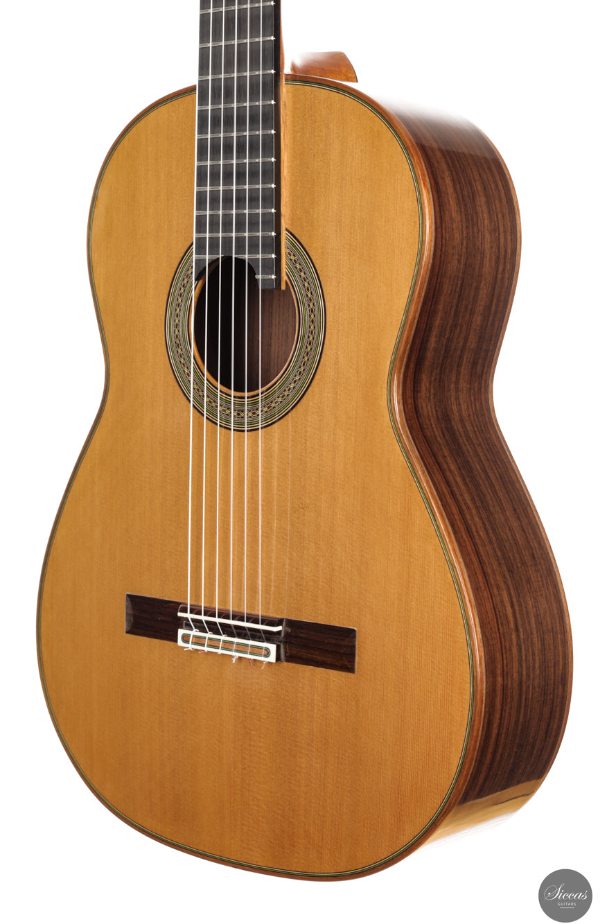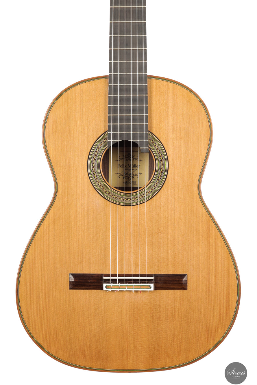 A 2025 double top guitar by Felix Müller with a cedar top and Indian rosewood body that offers warm dark colours long sustaining resonance and exceptional balance. It responds with great ease under both hands and projects a spacious expressive tone suited for demanding concert repertoire.