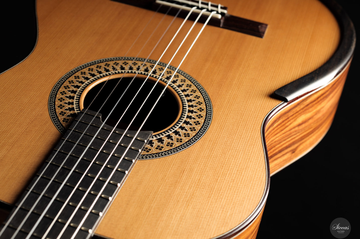 This 2025 concert guitar by Fernando Mazza exemplifies his refined approach to modern lutherie. Built with a 640 mm scale, it is ideal for players seeking enhanced playability without compromising tonal depth. The red cedar soundboard is braced with balsa wood reinforced with carbon fiber, a system developed through extensive experimentation. The bracing varies in thickness between 2.3 mm and 1 mm, optimizing strength and flexibility while preserving the warmth and harmonic richness characteristic of cedar.