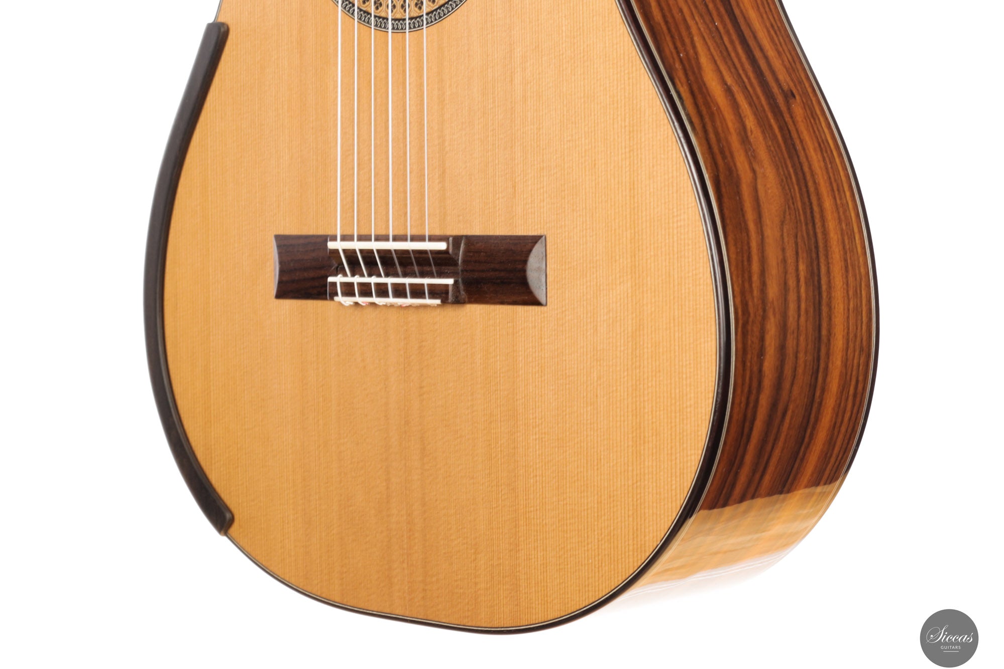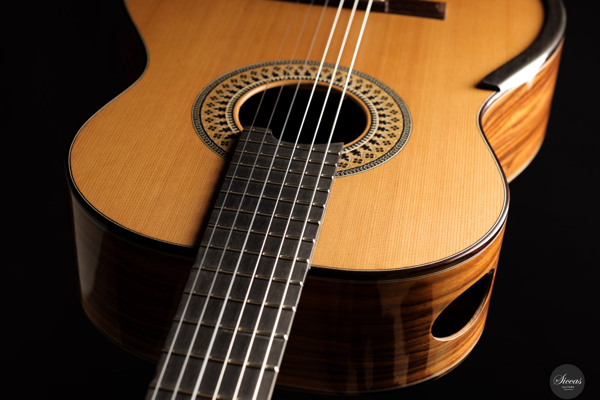The back and sides are crafted from Santos rosewood, combined with maple on the sides and Nomex inside the back, creating a lightweight yet rigid structure that maximizes resonance and projection. This architectural layering contributes to the instrument’s notably responsive character and long sustain. It is also equipped with an armrest and a sound port, enhancing comfort and tonal feedback during performance.