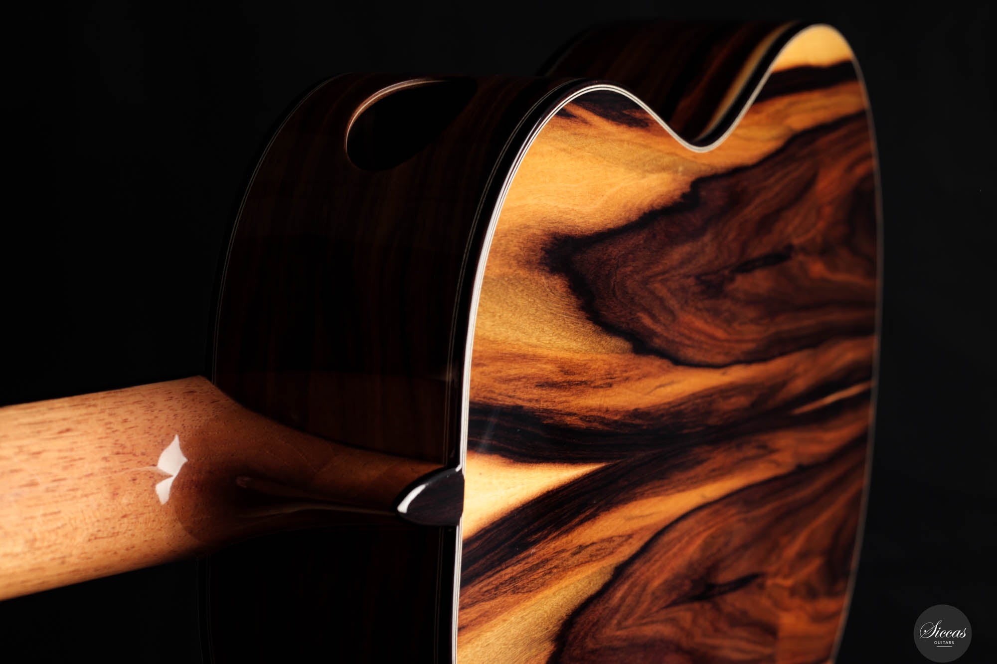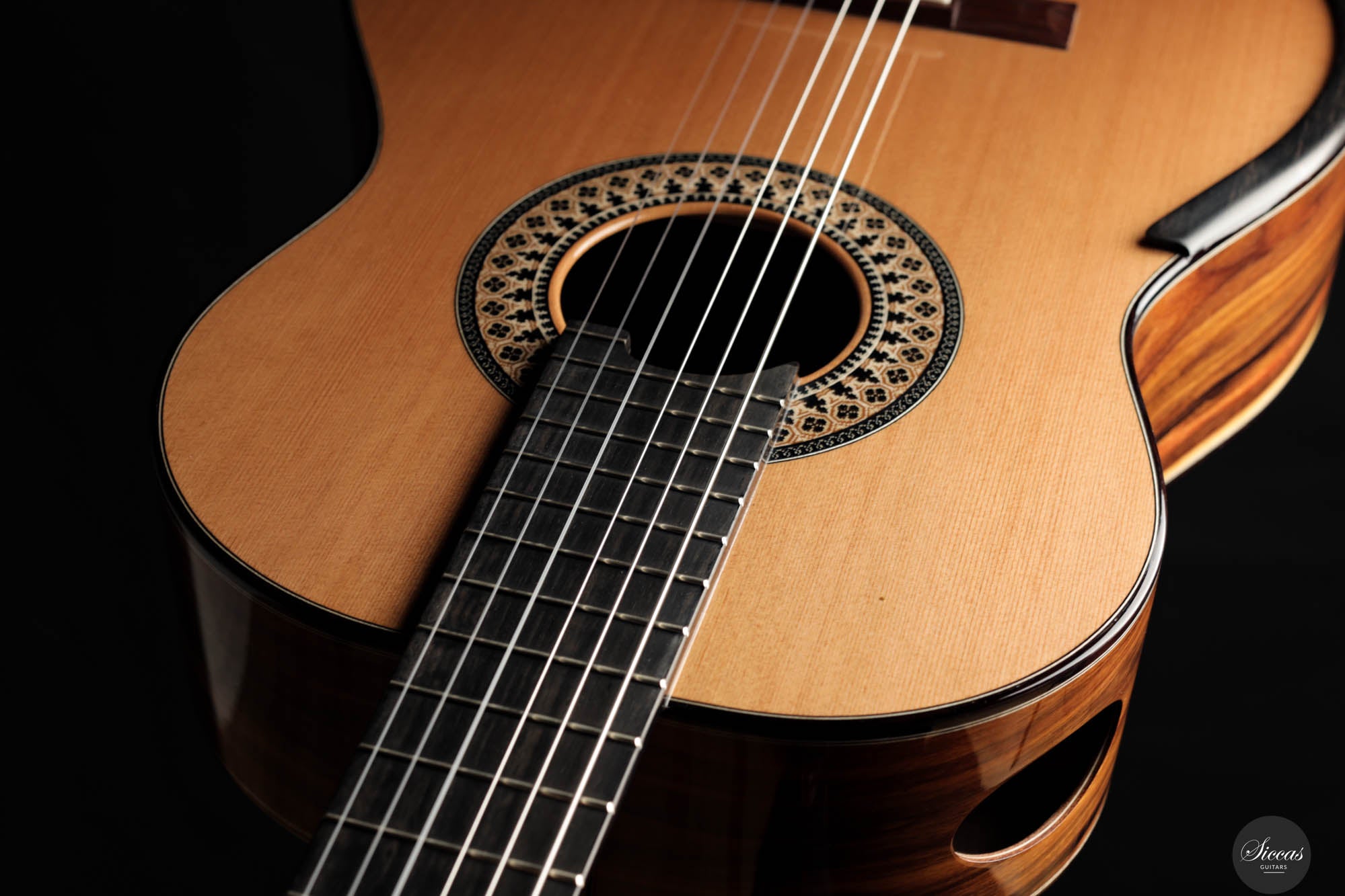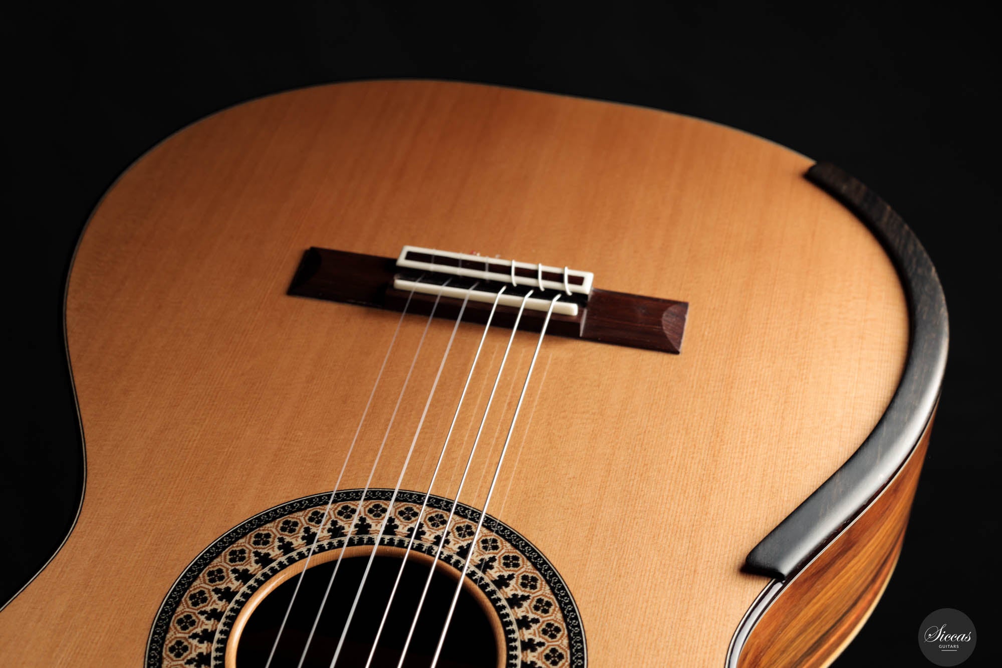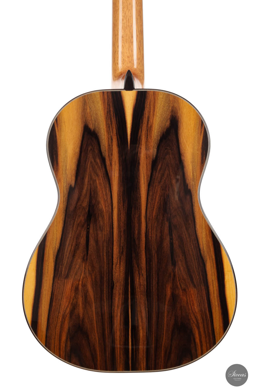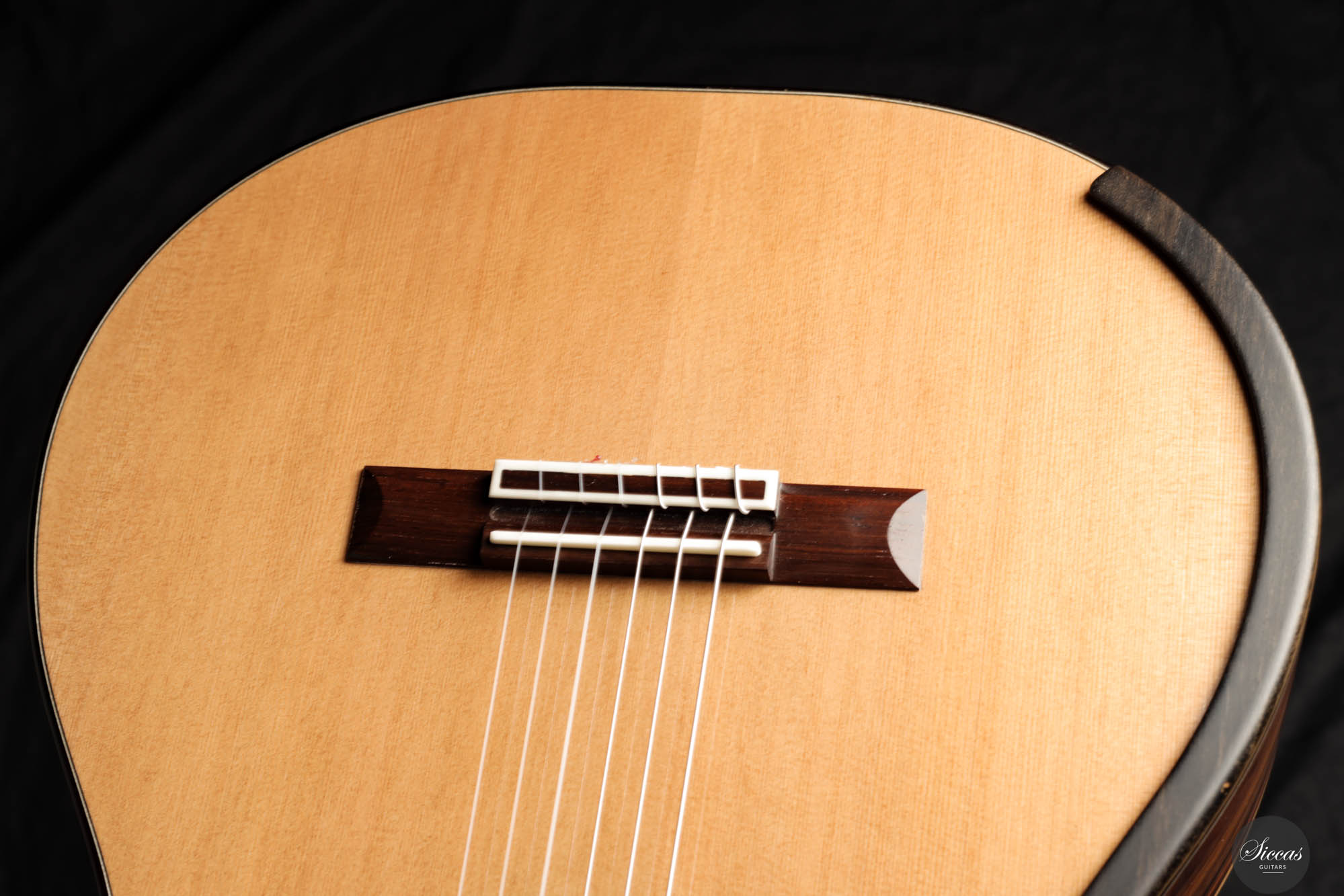 The back of the guitar is made from Santos rosewood veneer paired with Nomex, a choice that results in a back that is rigid, yet light and highly flexible. This strategic combination of rigidity and flexibility in the guitar's harmonic box optimizes the use of the vibrational energy from the strings, ensuring a full and resonant sound. The Santos rosewood, sourced from Brazil, is carefully selected for its unique and irreplaceable wood grains, adding to the distinctiveness of each guitar. Through these meticulous design choices, Fernando Mazza's Limited Edition guitar embodies a fusion of traditional craftsmanship and cutting-edge technology, making it capable of handling the broadest range of musical expressions with ease.