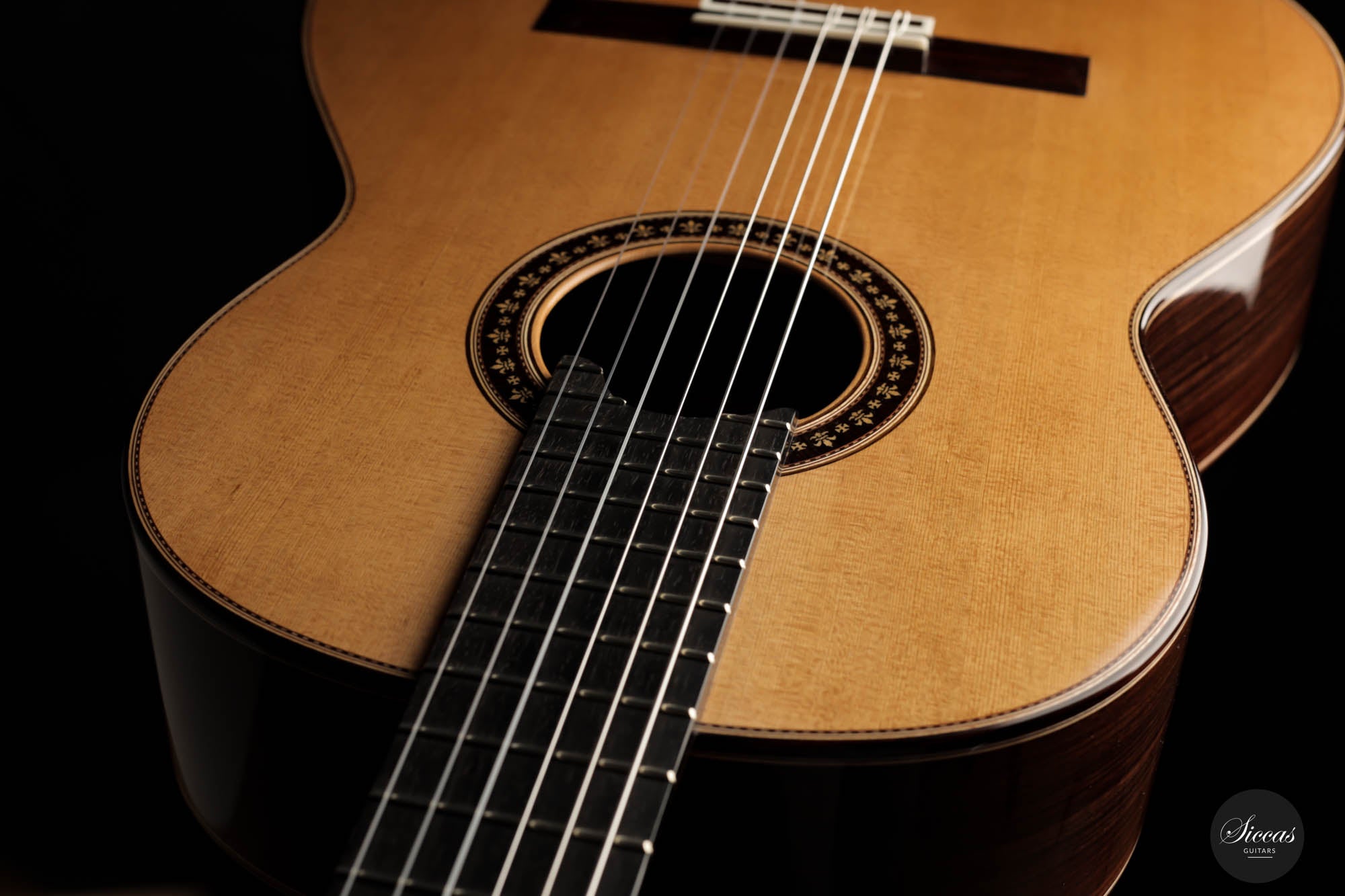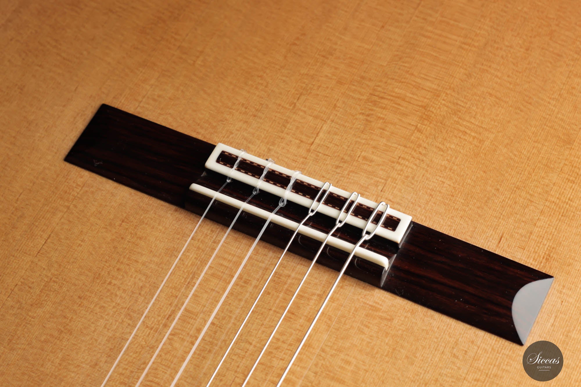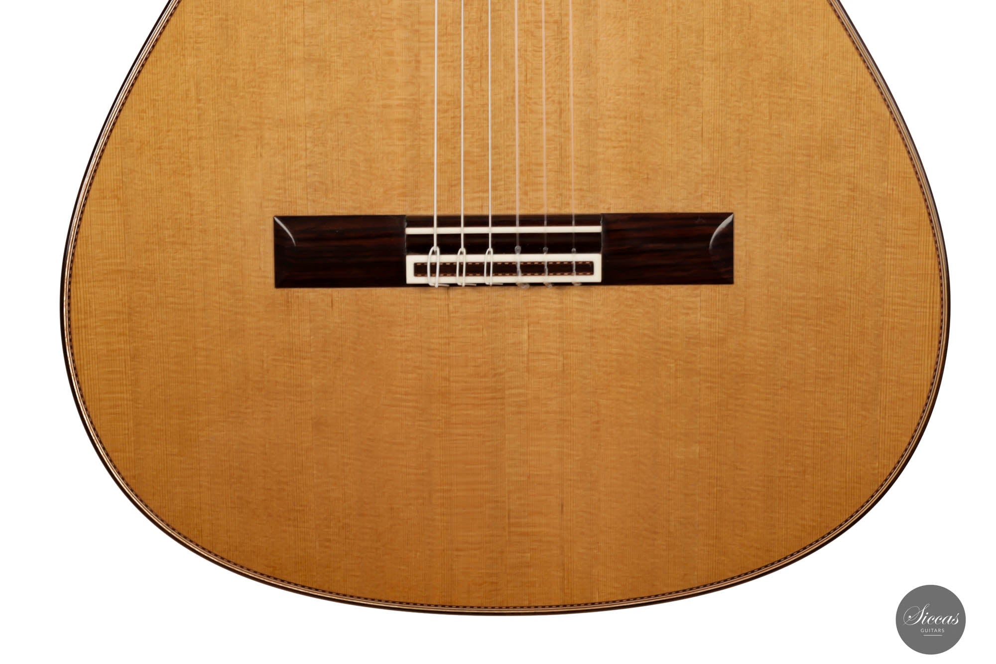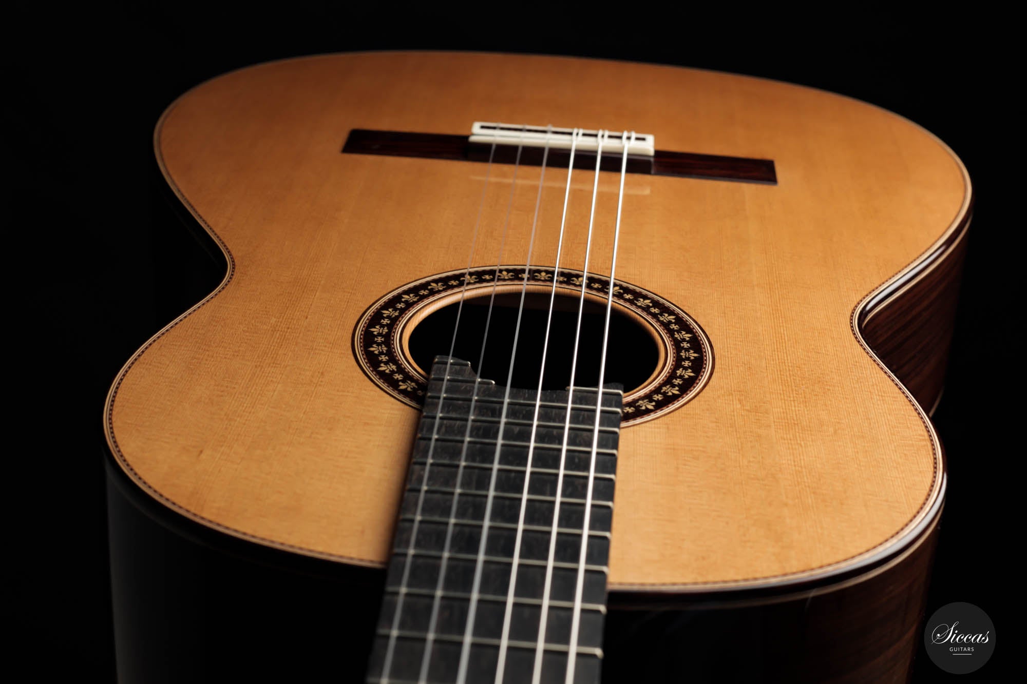The 2023 Francisco Munoz Alba "Especial Homenaje" guitar is a remarkable manifestation of the deserved reputation of its creator, revealing a stunning combination of artisanal dedication and high-level craftsmanship. This instrument exemplifies the elevated standards of Munoz's work and stands as a beautiful testament to the tradition and evolution of Spanish guitar-making. The Especial Homenaje model features a vibrant cedar soundboard, renowned for its dynamic range and rich tonal characteristics. Complementing this are the back and sides, crafted from strikingly straight-grain Indian rosewood. This selection of tonewoods ensures a balanced tonality that respects the heritage of the classical guitar while offering a unique voice. Acoustically, this guitar is a marvel. The treble strings deliver a swift attack with a unique bite, a characteristic often sought in the Spanish guitar style. These vivacious trebles are harmoniously balanced with the warmth and responsiveness of the basses, creating an engaging sonic landscape that is a joy to explore.