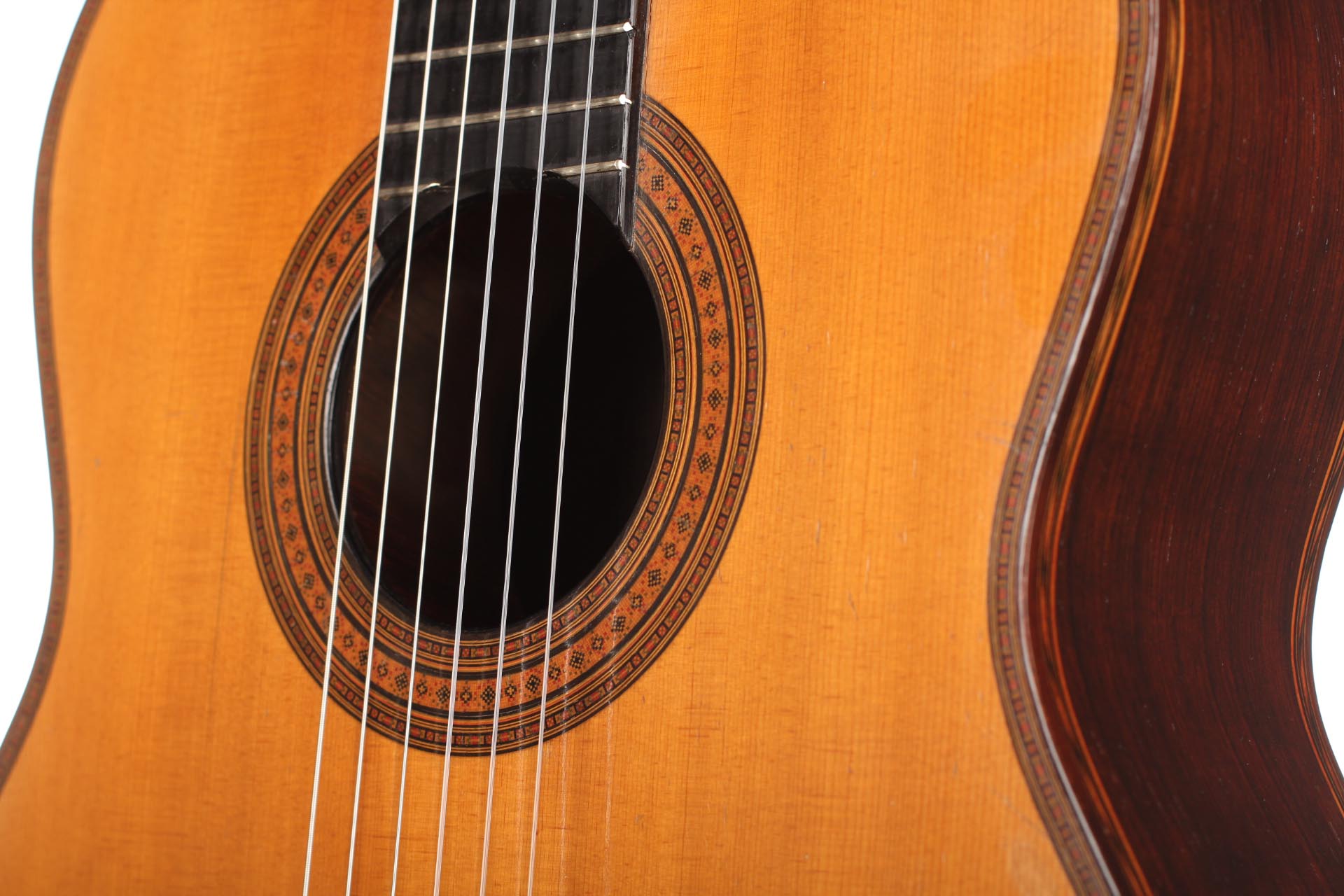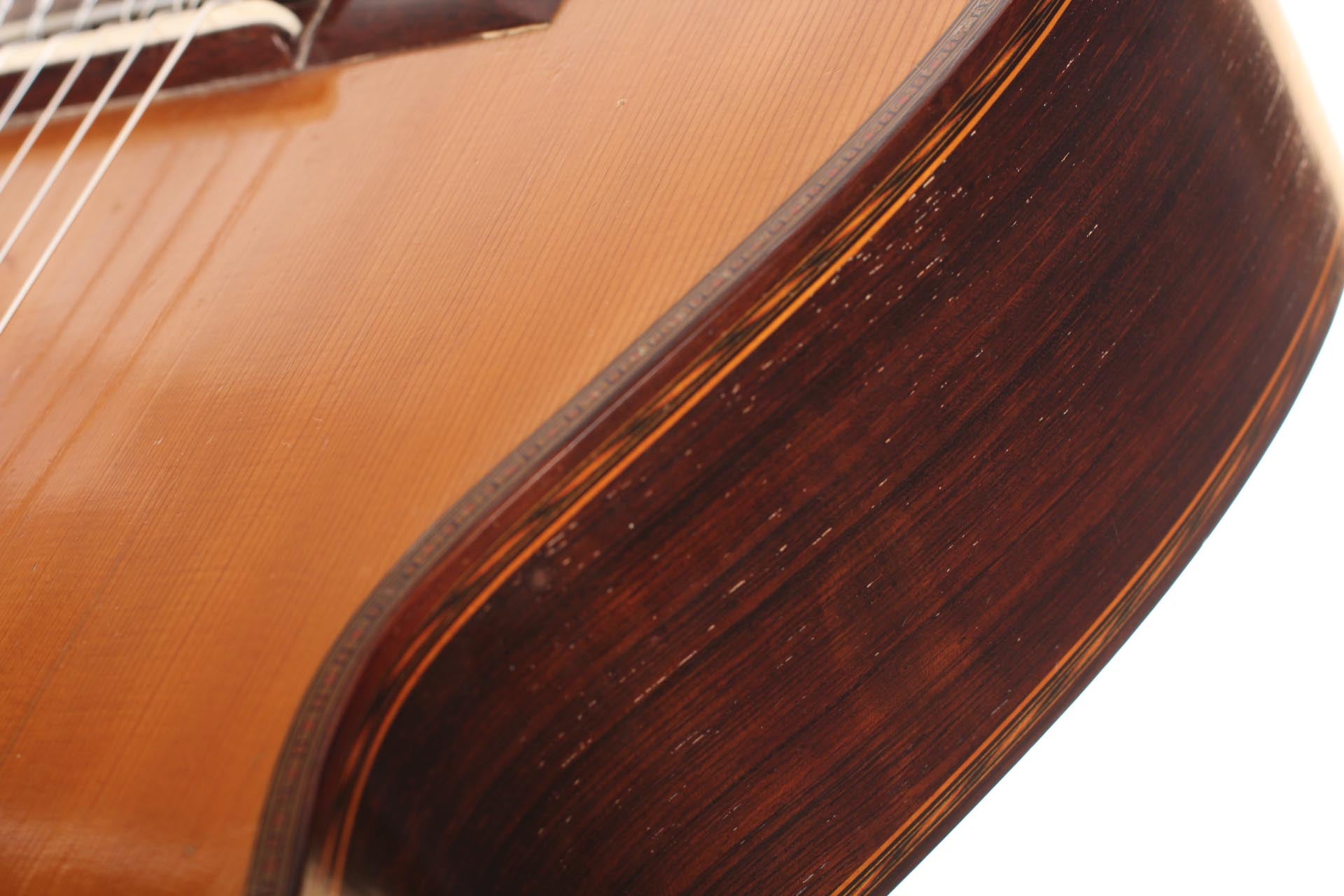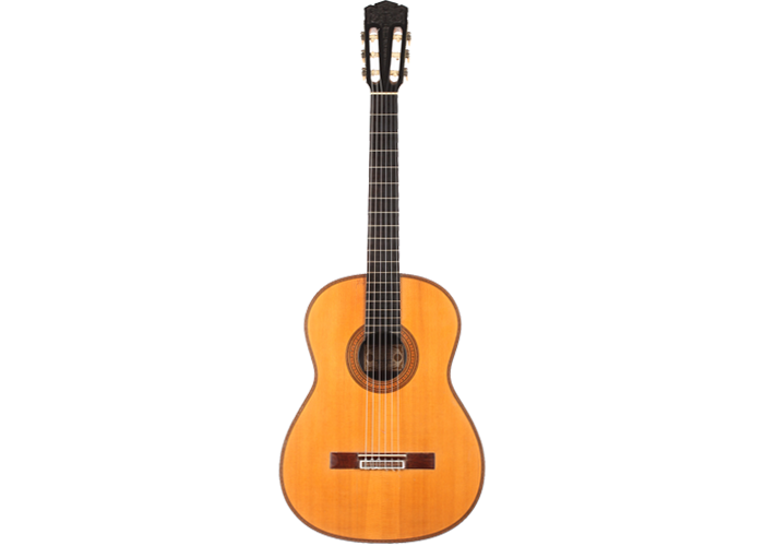This Guitar was built in 1927 and wears the number 162. It has a beautiful spruce top and Cites pre-convention Brazilian rosewood back and sides. The top and the back have a few repaired cracks. The ebony head-plate is carved and the head wears old Fustero tuners. A very special feature of this guitar is the rosewood tornavoz that goes down to the half of the depth of the sound box. It gives the guitar extraordinary deep and warm basses, projecting easily and giving a smooth stroke-feeling. This guitar is a unique collection instrument and has the very sound one is looking for, when playing some Tarrega, Granados, Albeniz, etc.The original case is included.