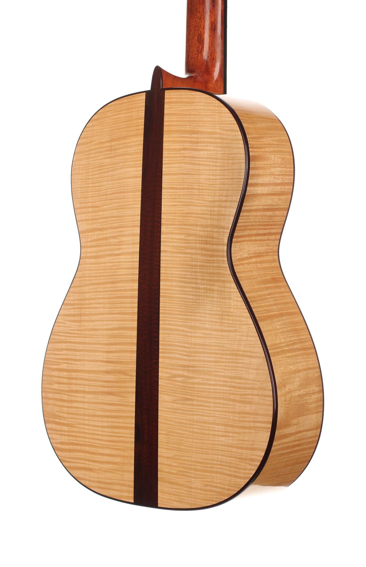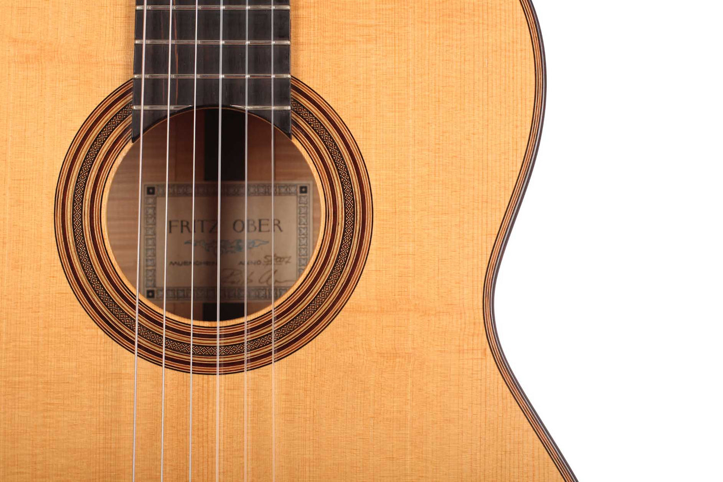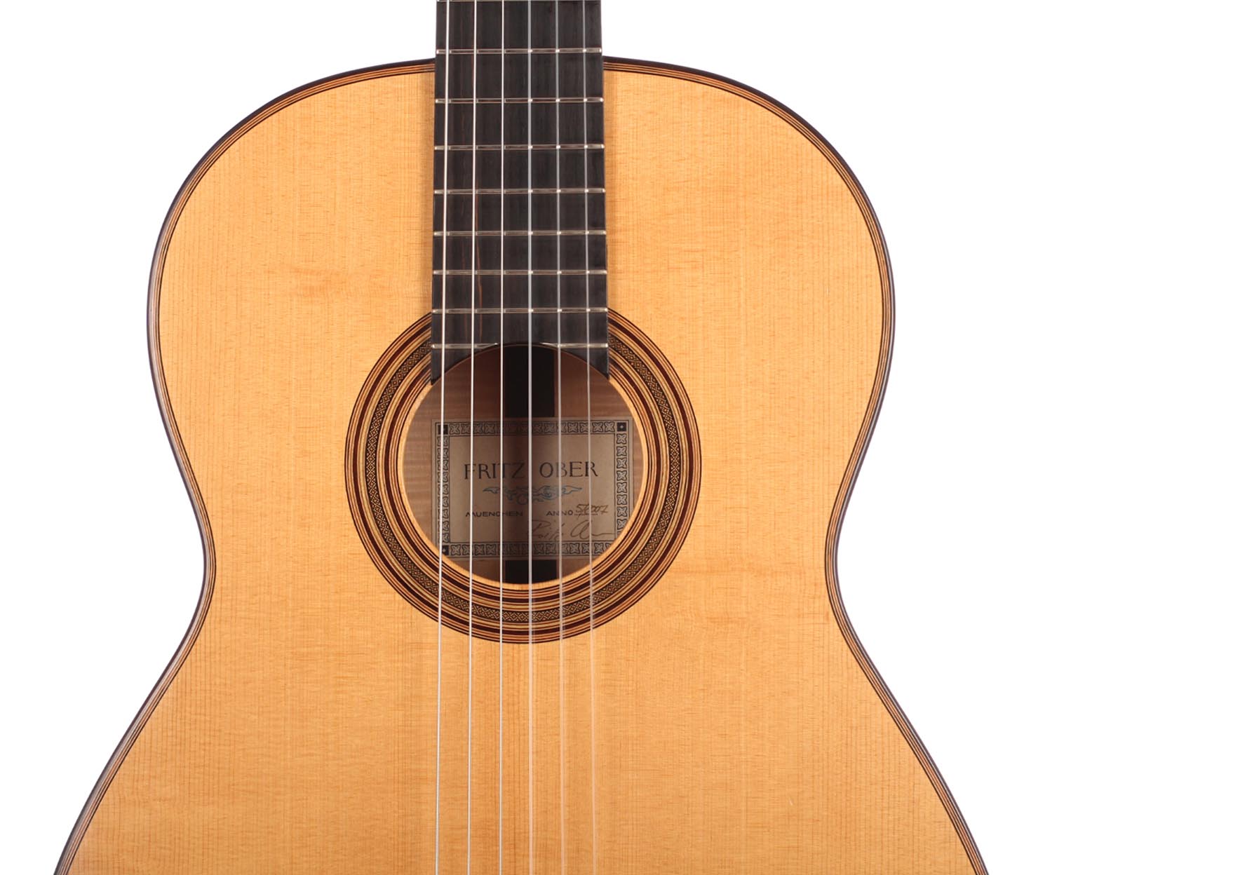 This Fritz Ober guitar was made in 2007. The design reminds very much of Antonio de Torres. The soundboard is made of bearclaw European spruce and for back and sides was used a beautiful and strong flamed maple wood. The back is decordated with a wide centre strip of snakewood - made of snakewood are also the headplate and the binding.