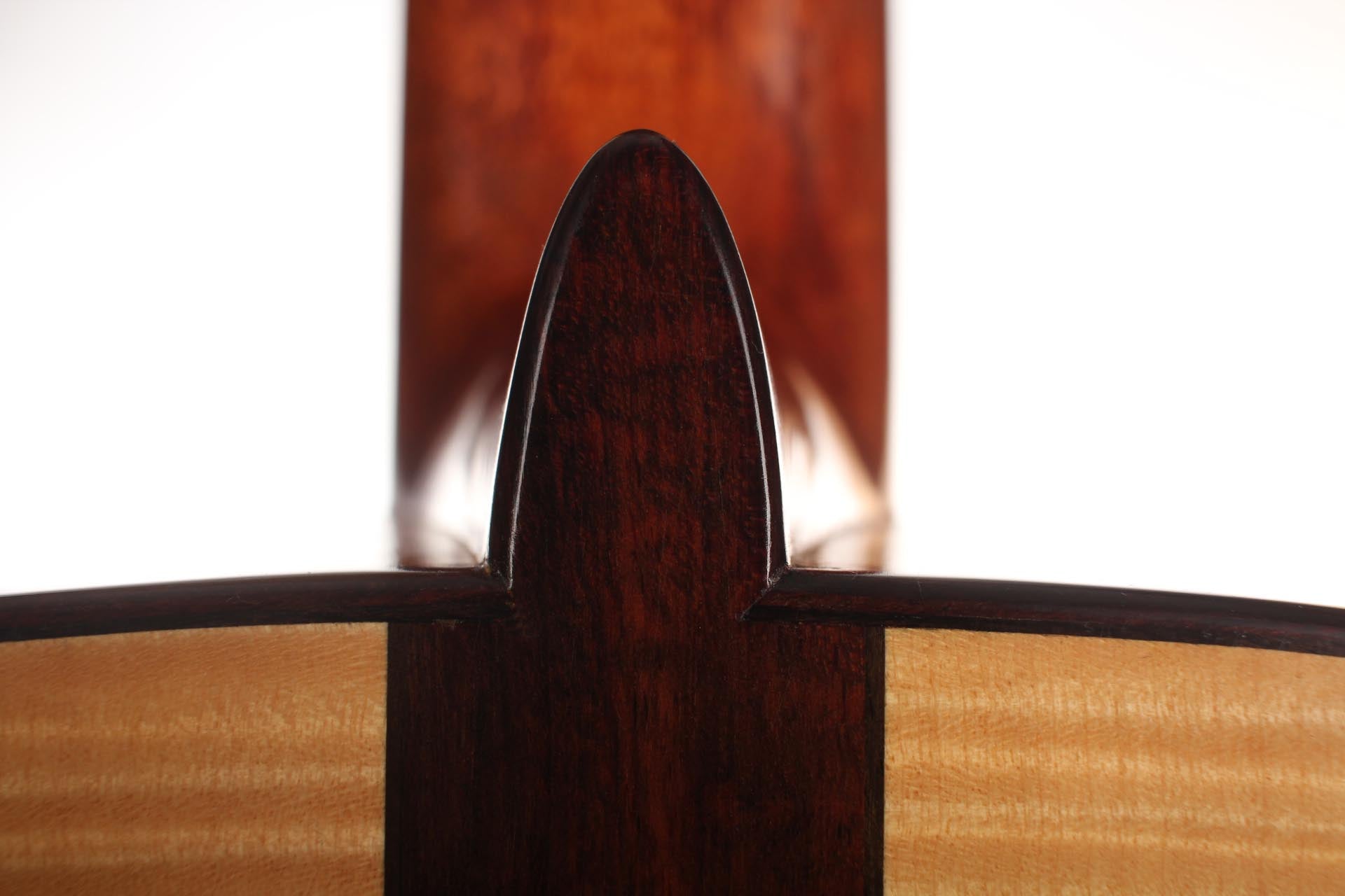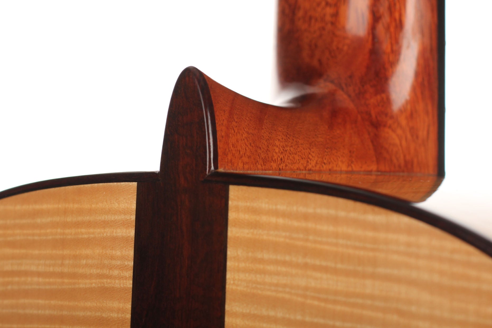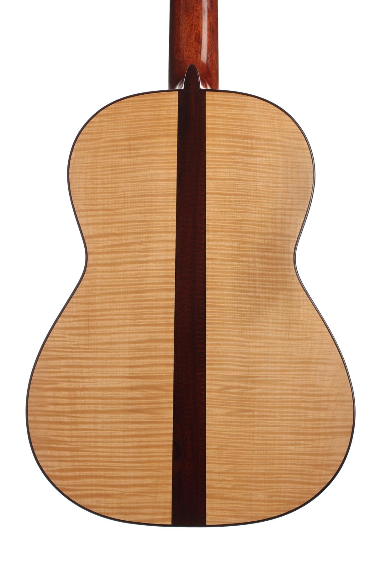This Fritz Ober guitar was made in 2007. The design reminds very much of Antonio de Torres. The soundboard is made of bearclaw European spruce and for back and sides was used a beautiful and strong flamed maple wood. The back is decordated with a wide centre strip of snakewood - made of snakewood are also the headplate and the binding.