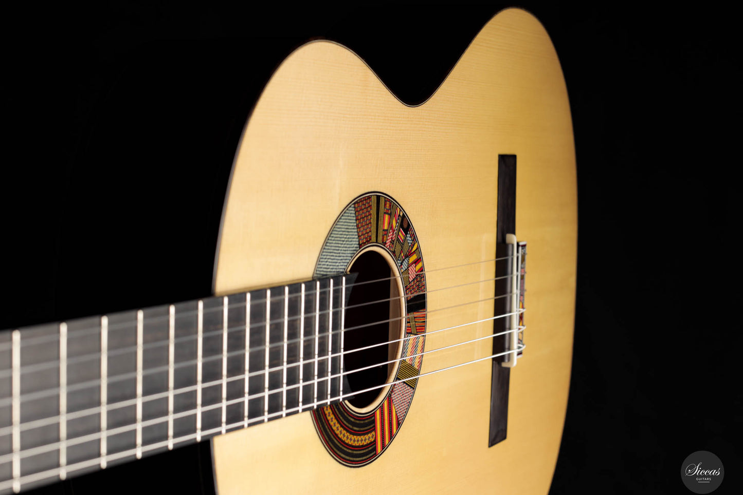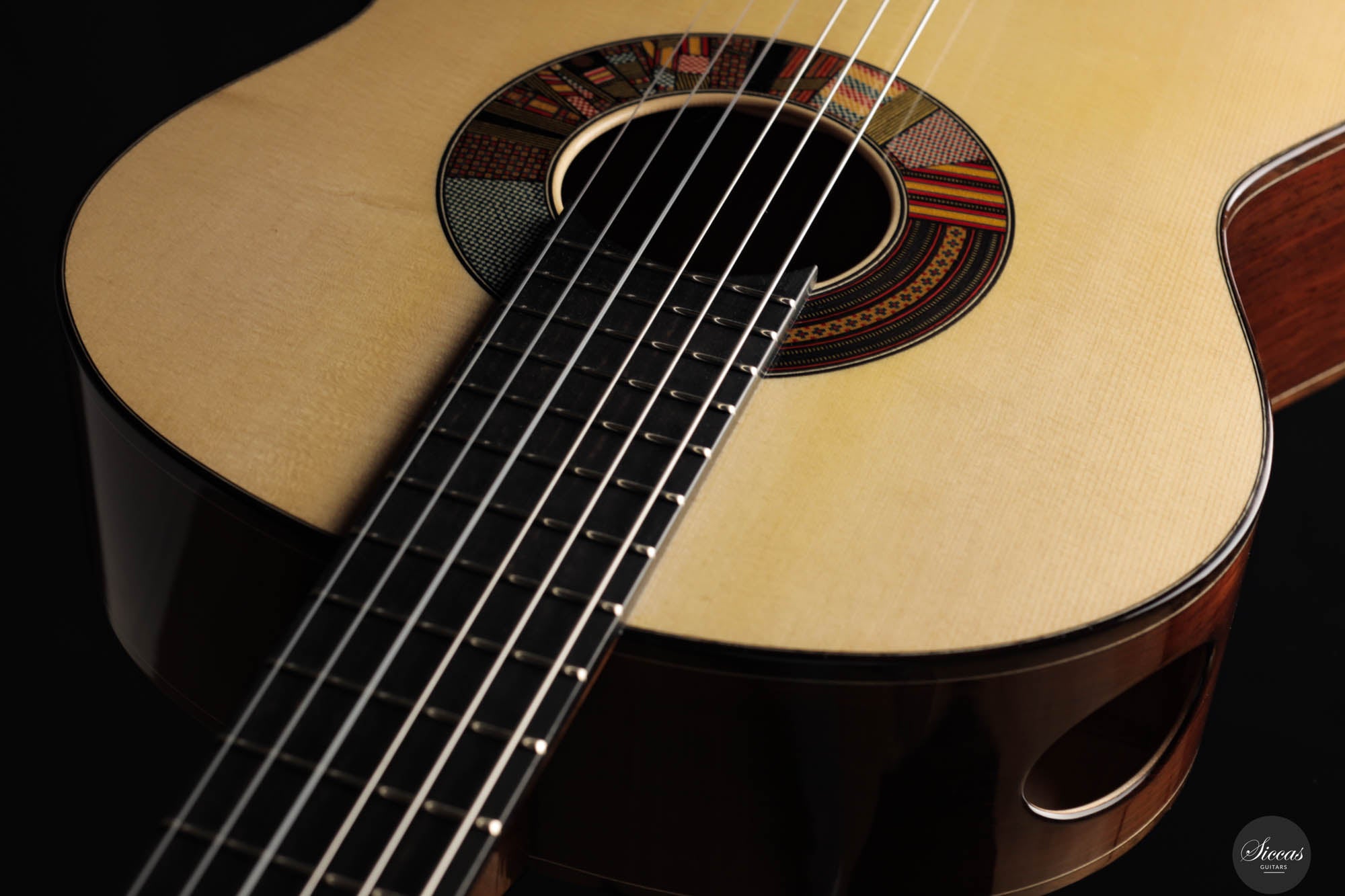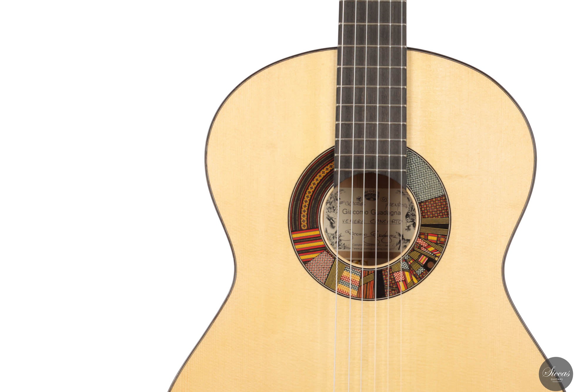 The "La Venere Concerto" guitar features a traditional 7-ray construction and is a fully original design by Giacomo Guadagna. He developed this model aiming for a perfect balance in sound, where neither the basses nor the highs dominate. Recently, Giacomo has adorned his "La Venere" with colorful, joyful details inspired by Sicilian artifacts and majolica, creating an instrument with a distinct personality that reflects his own. The "La Venere Concerto Limited Edition" includes special features: it has significant projection and volume due to its unique bracing arrangement and shape. It also has a soundport, enhancing the musician's ability to hear themselves during performances, and an adjustable saddle that allows for easy changes in string height, accommodating different musical preferences or preparing the guitar for a new owner without needing a luthier.
