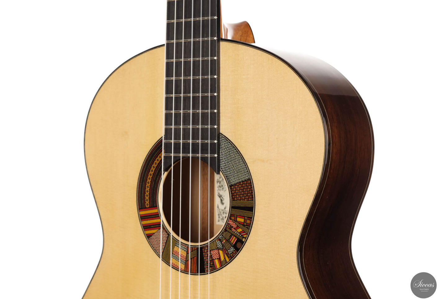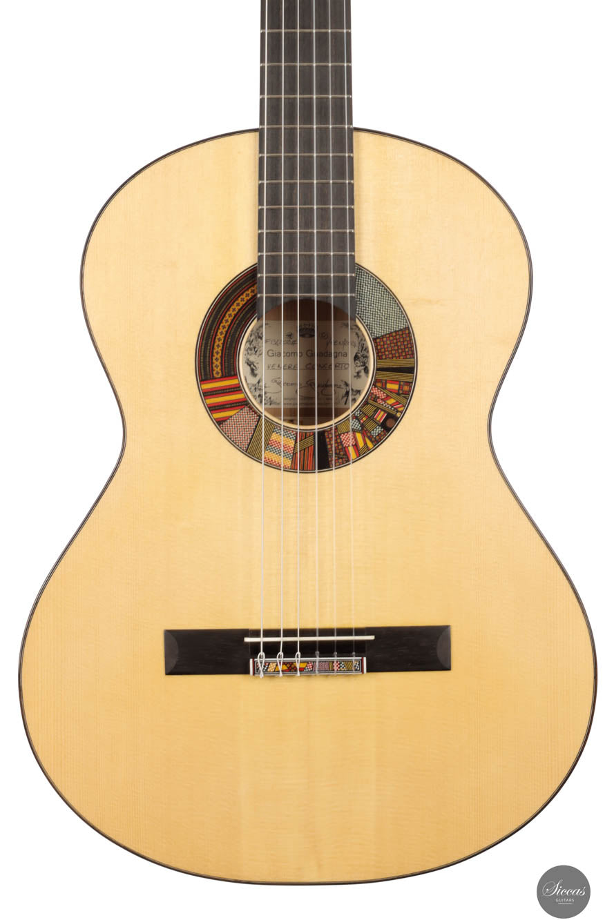 The REG 2024 Limited Edition guitar crafted by Giacomo merges impeccable artistry with superior acoustic qualities, making it a standout instrument capable of handling any concert setting. It boasts remarkable volume and projection, allowing musicians to fully explore its dynamic range while maintaining the organic, resonant quality characteristic of a traditional guitar. An innovative soundport enhances the player's auditory experience, providing immediate feedback on the sound produced, which enriches performance. Additionally, the aesthetic of this guitar is particularly striking, featuring a unique rosette composed of various designs Giacomo has utilized throughout his career. This detail not only adds visual appeal but also tells a story of the luthier's evolving artistic journey, making each performance with this guitar a visually and sonically captivating experience.