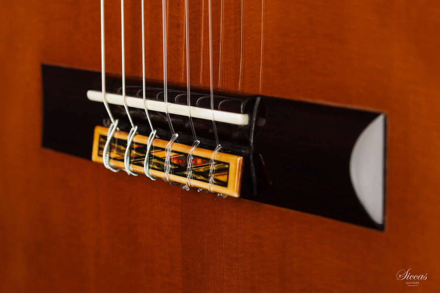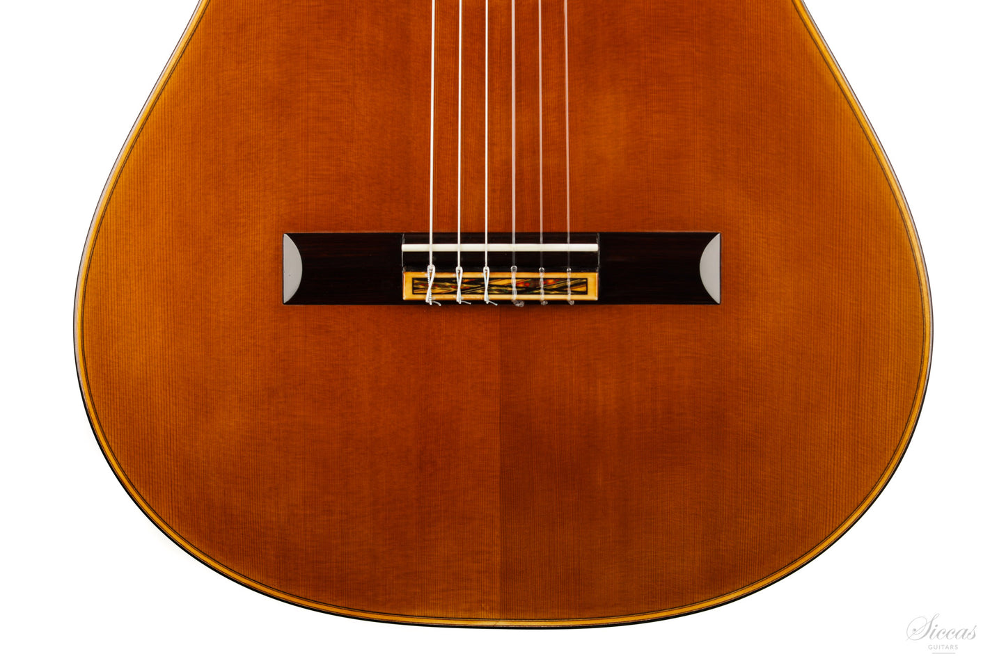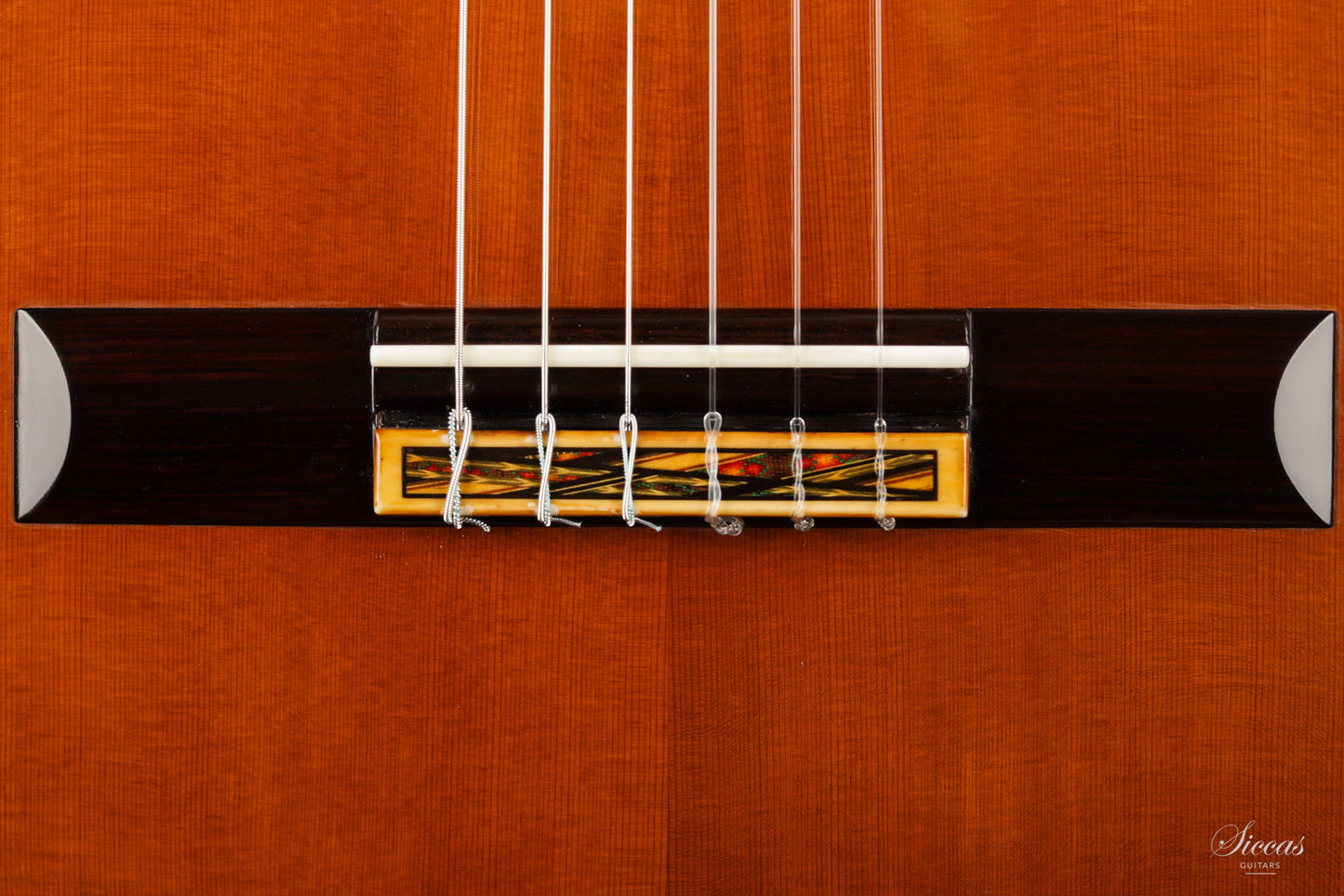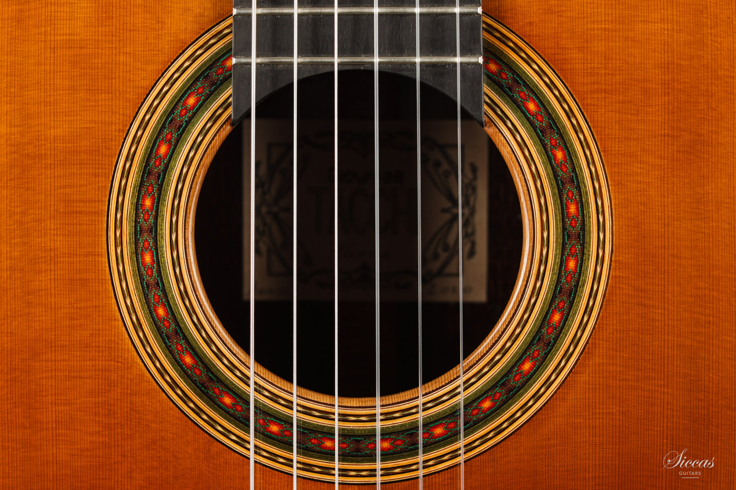 This Friedrich copy is a fantastic hommage to the French guitar building tradition. Big, firm and bold basses paired with that typical glassy singing trebles that Friederich guitars are famous for. The voices separates gracefully and every note ring like a cathedral. Giovanni Tacchi showed his guitars to master luthier Dominique Field who said that Giovannis instruments sounded "like a Friederich, but younger". What an absolutely amazing compliment from the maestro! When inspecting the guitar the build quality is absolutely fantastic, from the refined carvings of the headstock to the exquisite details of the rosette. Furthermore is the guitar also coloured in the same way that Daniel Friederich sometimes used to do, making the guitar look a bit more vintage. The rosette is also picked up in the inlay work on the bridge, just a lovely detail with a flawless design. A tricky part of the building process is of course the execution of the head plate arrow and the elevations around the tuning holes, Giovanni surely hit the mark with this task. This instrument is a true concert guitar full of vibrant sonority in all the voices.