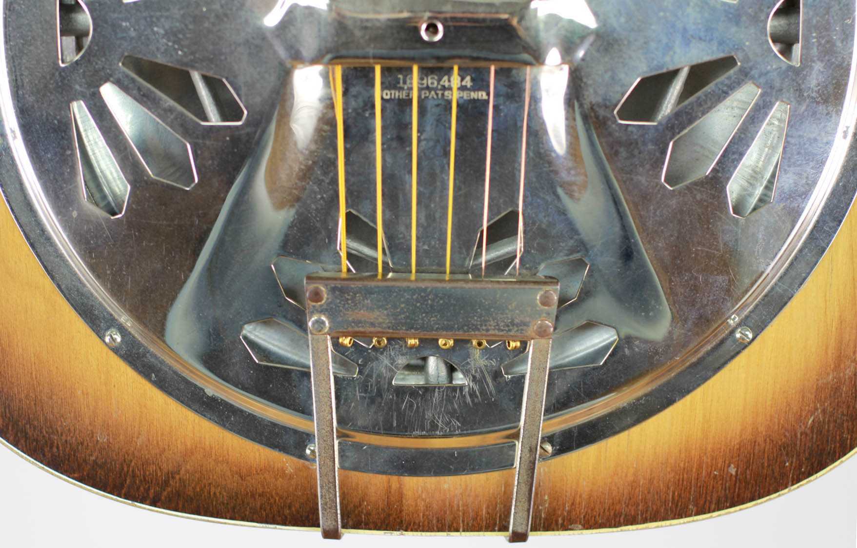 This is a Gretsch from the 1930's. Like most of the pre war Dobro-Style Guitars it does not have a serial number or label. It was very likely made by Regal who often made and sold resonators for other companies in the 30's. It is in good conditions considering the age. The action is not too high, which makes it playable for both fingerstyle and open tuning slide. The spider cone is original Dobro and the coverplate is a Pat Pend type with a modified hole pattern which is typical for the Gretsch-branded resonators from the era.