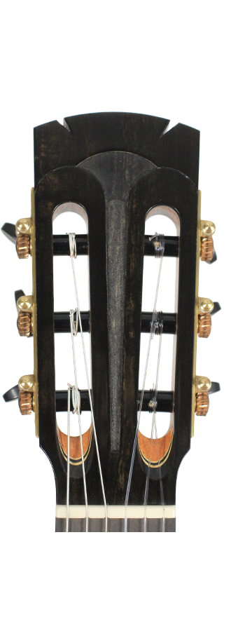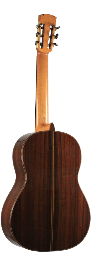 Adrian Heinzelmann and Benaja Leutzsch belong to the most aspiring luthiers in Germany. In this guitar many own ideas were included, i.e. the bridge consisting of a three-piece bone inlay. The top is made of fine-grained spruce with an embedded and magnificently decorated rosette. Back and sides are made of Madagascar rosewood. The fingerboard is raised above the top. Neck and head are made of cedro. The guitar is refined with shellac polish. The machine heads are by Alessi.