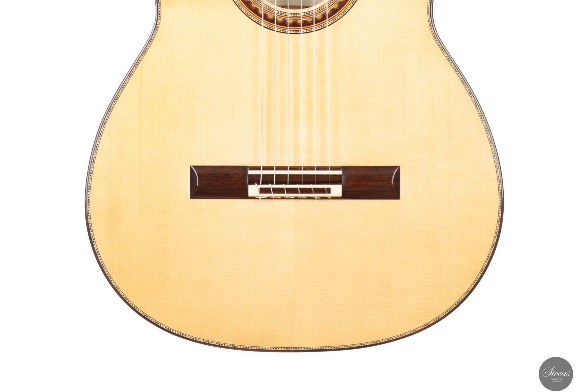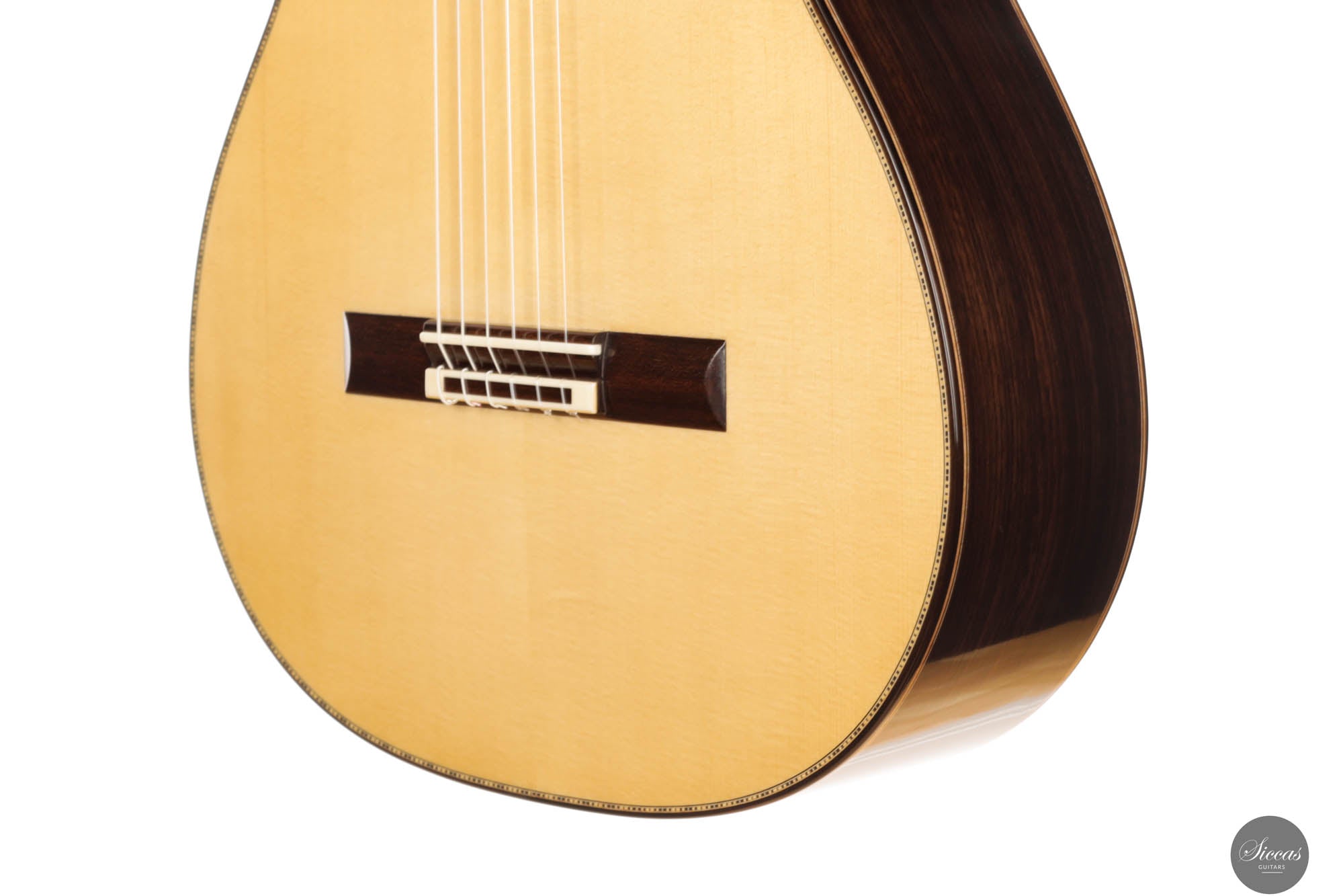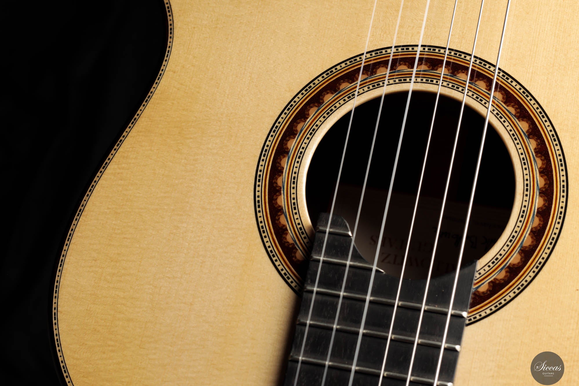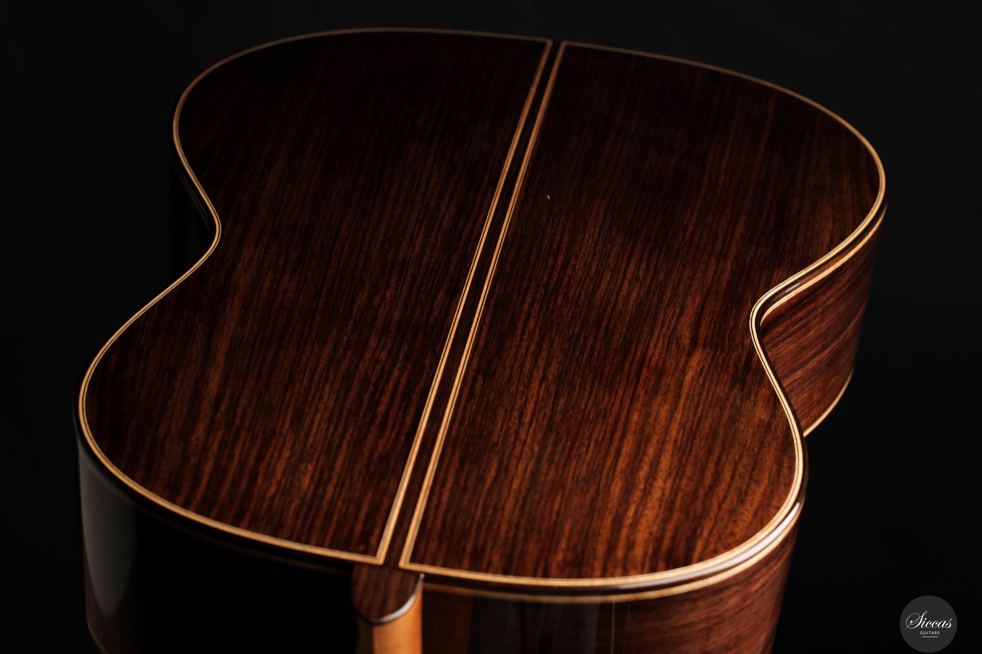 This guitar, number 11, showcases a truly promising future for Henrik. The flawless, mirror-like finish and meticulously selected, premium woods speak to an exceptional level of craftsmanship. Its lightweight design features a spruce top with beautifully tight grain and traditional fan bracing, paired with Indian rosewood back and sides that exude a striking, light red hue. The tone it produces is not just warmly resonant but deeply rich, enveloping the listener with a sense of warmth and fullness. Despite its light build, the guitar delivers a powerful volume, all while preserving an exquisite tonal depth and complexity.