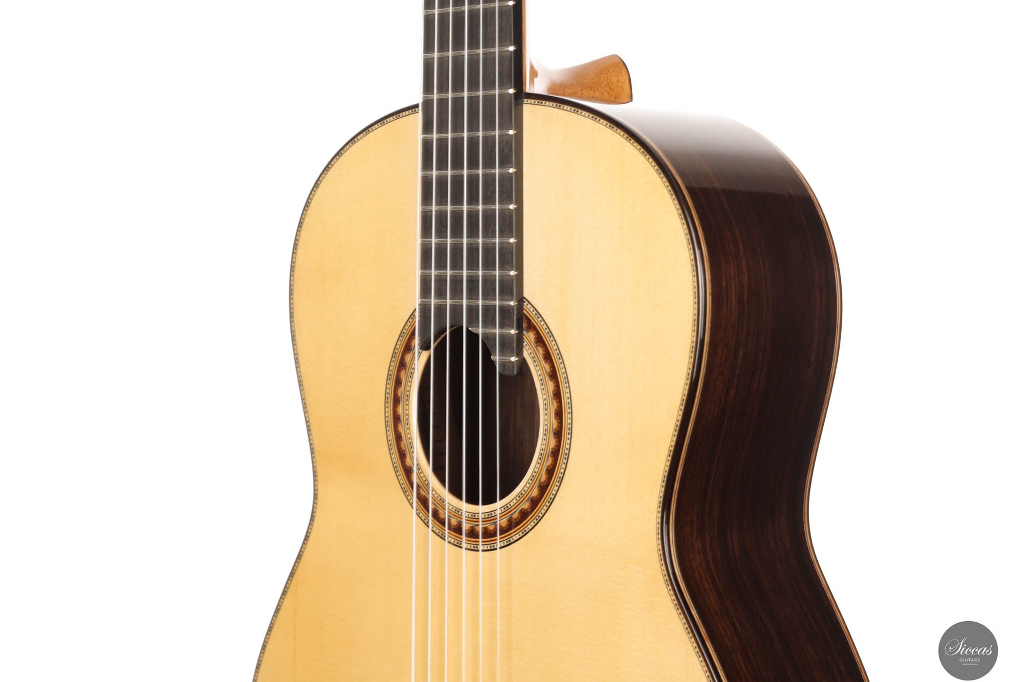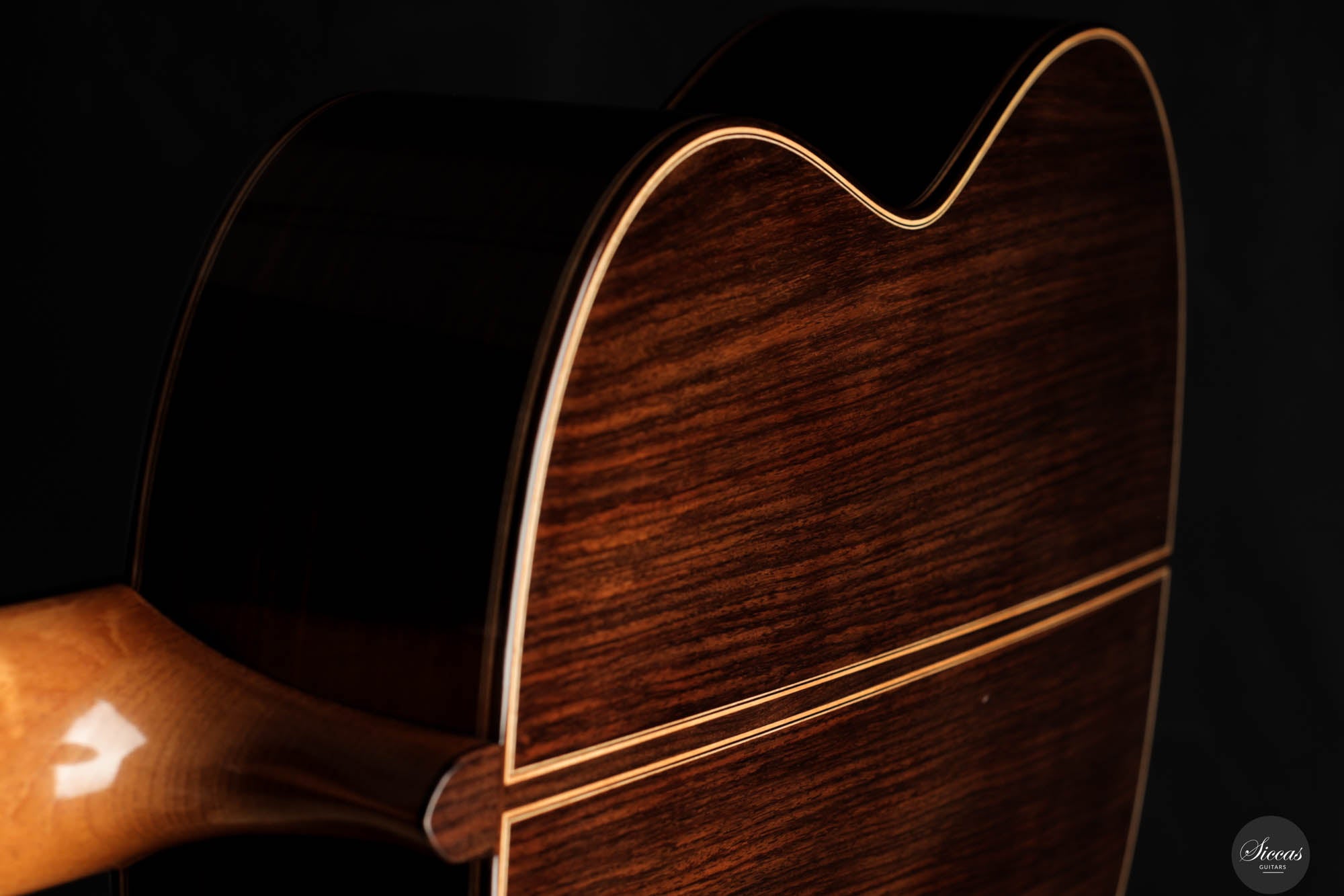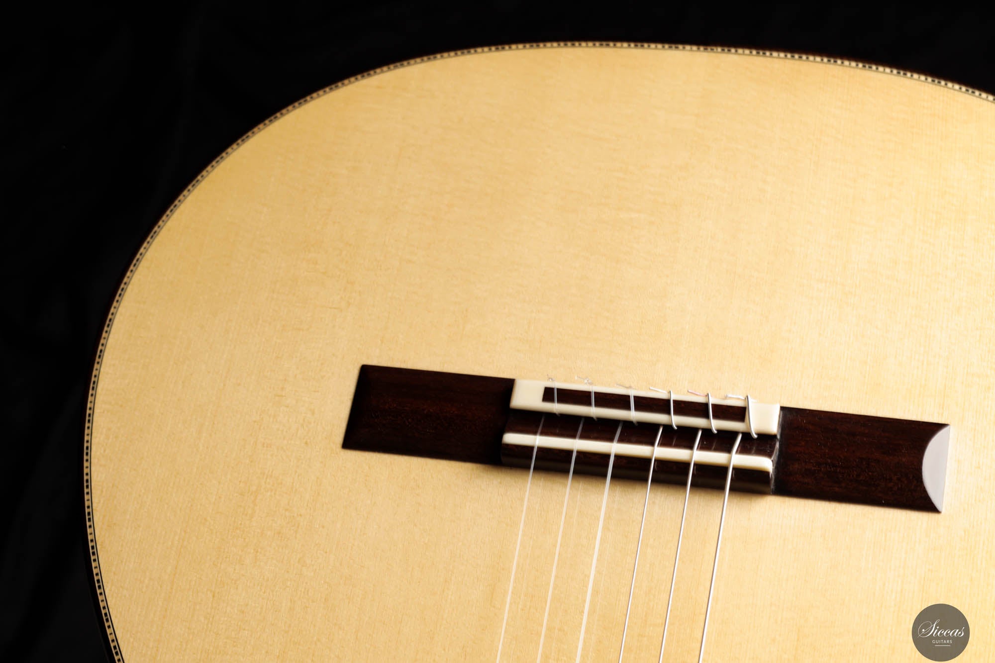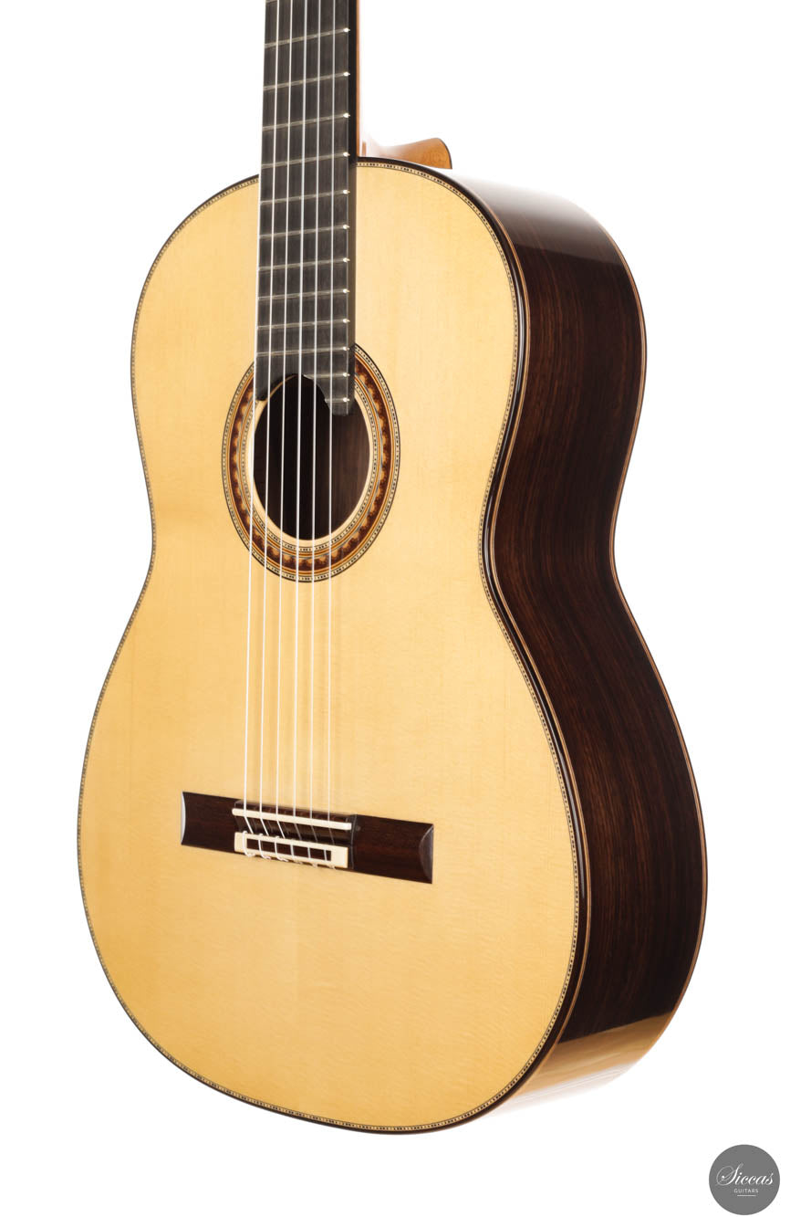 This guitar, number 11, showcases a truly promising future for Henrik. The flawless, mirror-like finish and meticulously selected, premium woods speak to an exceptional level of craftsmanship. Its lightweight design features a spruce top with beautifully tight grain and traditional fan bracing, paired with Indian rosewood back and sides that exude a striking, light red hue. The tone it produces is not just warmly resonant but deeply rich, enveloping the listener with a sense of warmth and fullness. Despite its light build, the guitar delivers a powerful volume, all while preserving an exquisite tonal depth and complexity.