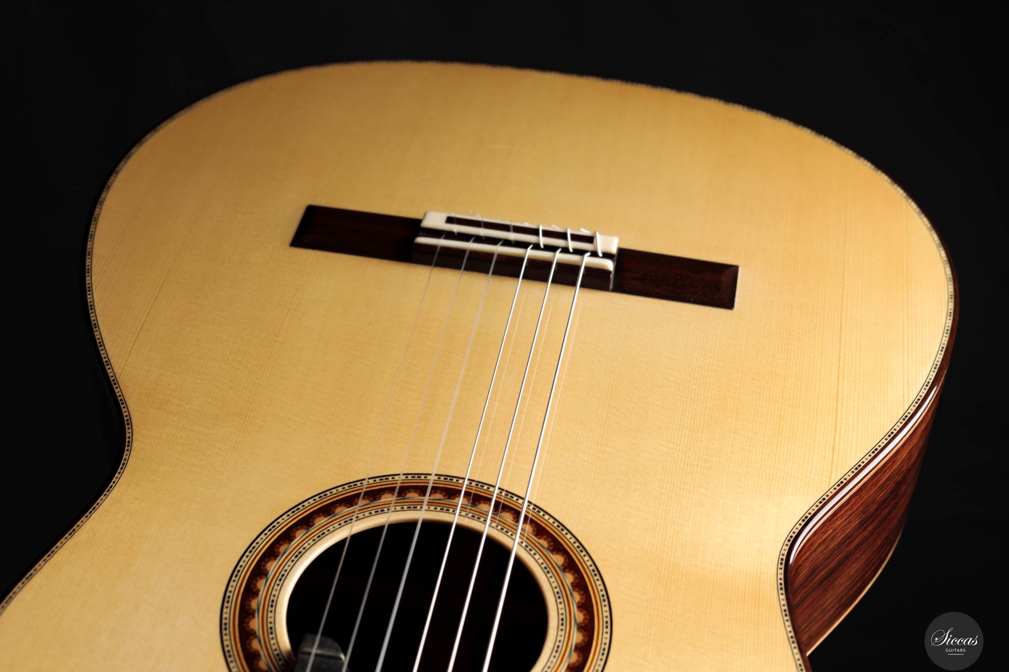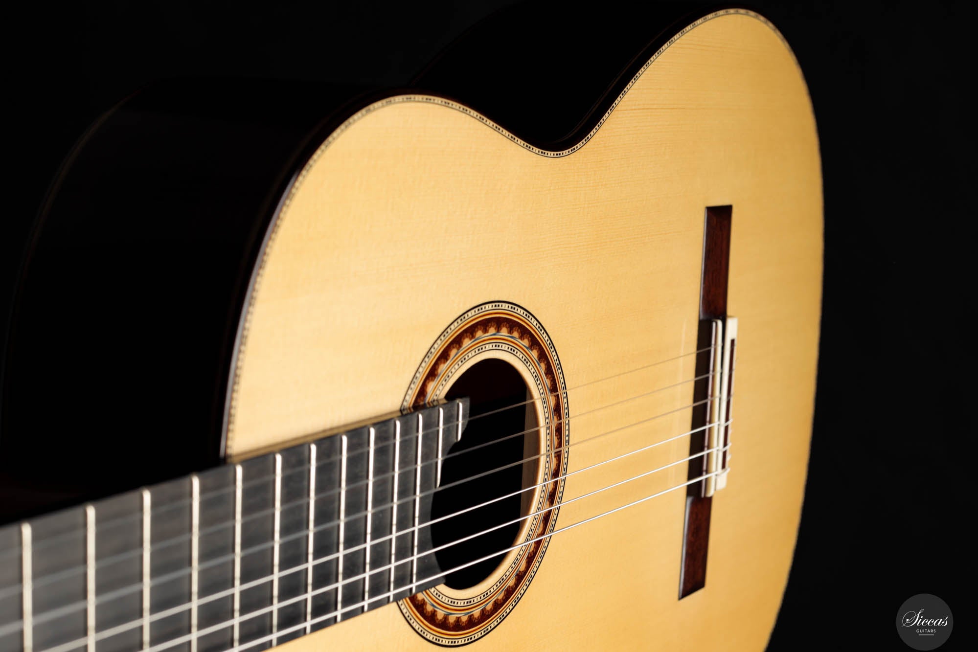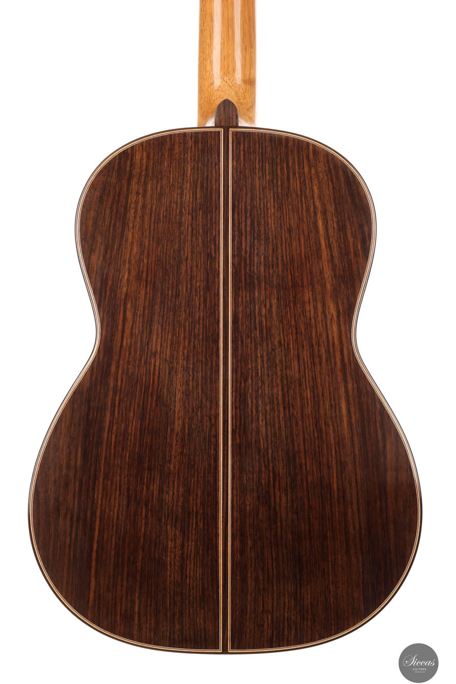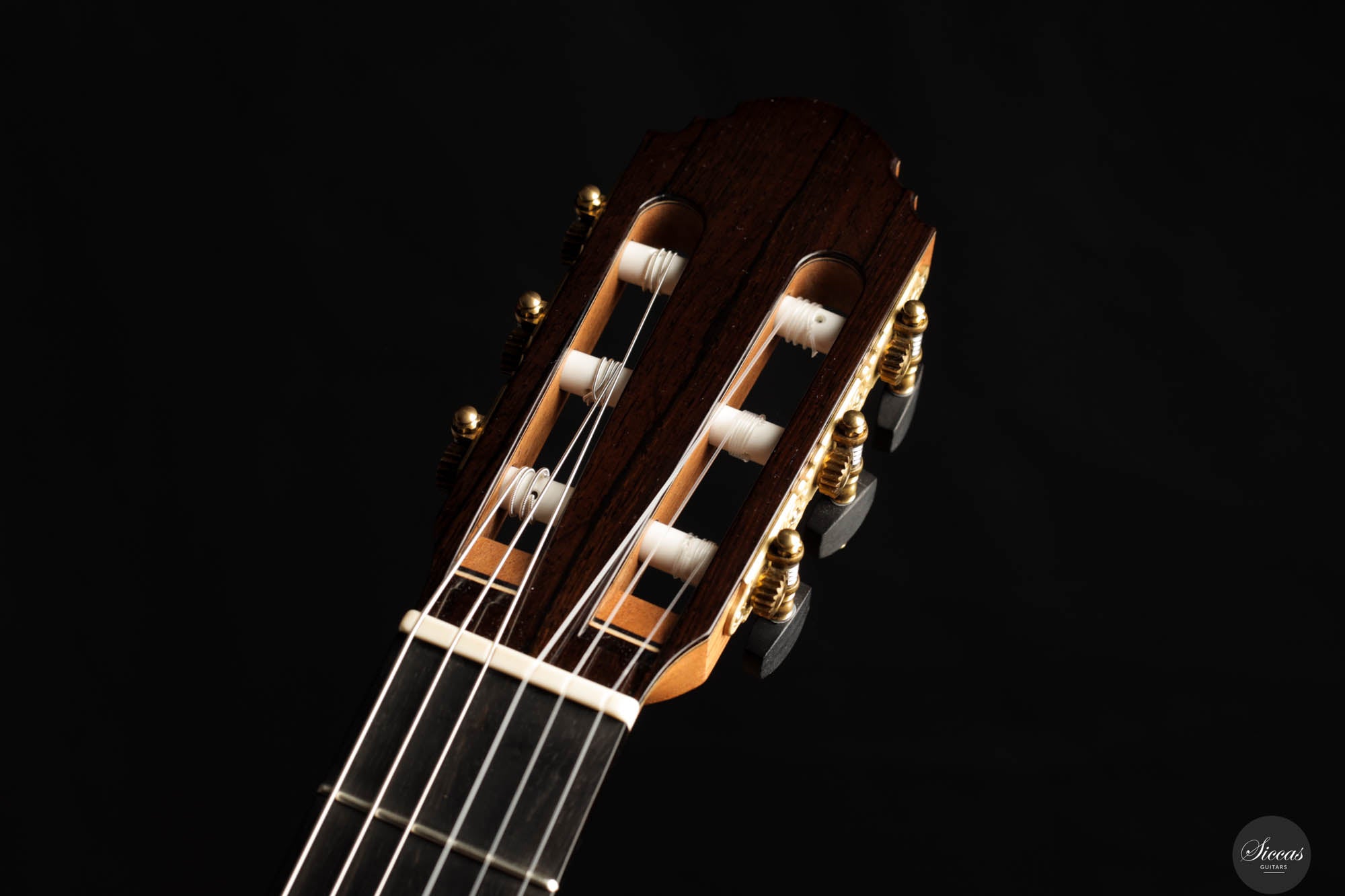 This guitar, number 11, showcases a truly promising future for Henrik. The flawless, mirror-like finish and meticulously selected, premium woods speak to an exceptional level of craftsmanship. Its lightweight design features a spruce top with beautifully tight grain and traditional fan bracing, paired with Indian rosewood back and sides that exude a striking, light red hue. The tone it produces is not just warmly resonant but deeply rich, enveloping the listener with a sense of warmth and fullness. Despite its light build, the guitar delivers a powerful volume, all while preserving an exquisite tonal depth and complexity.