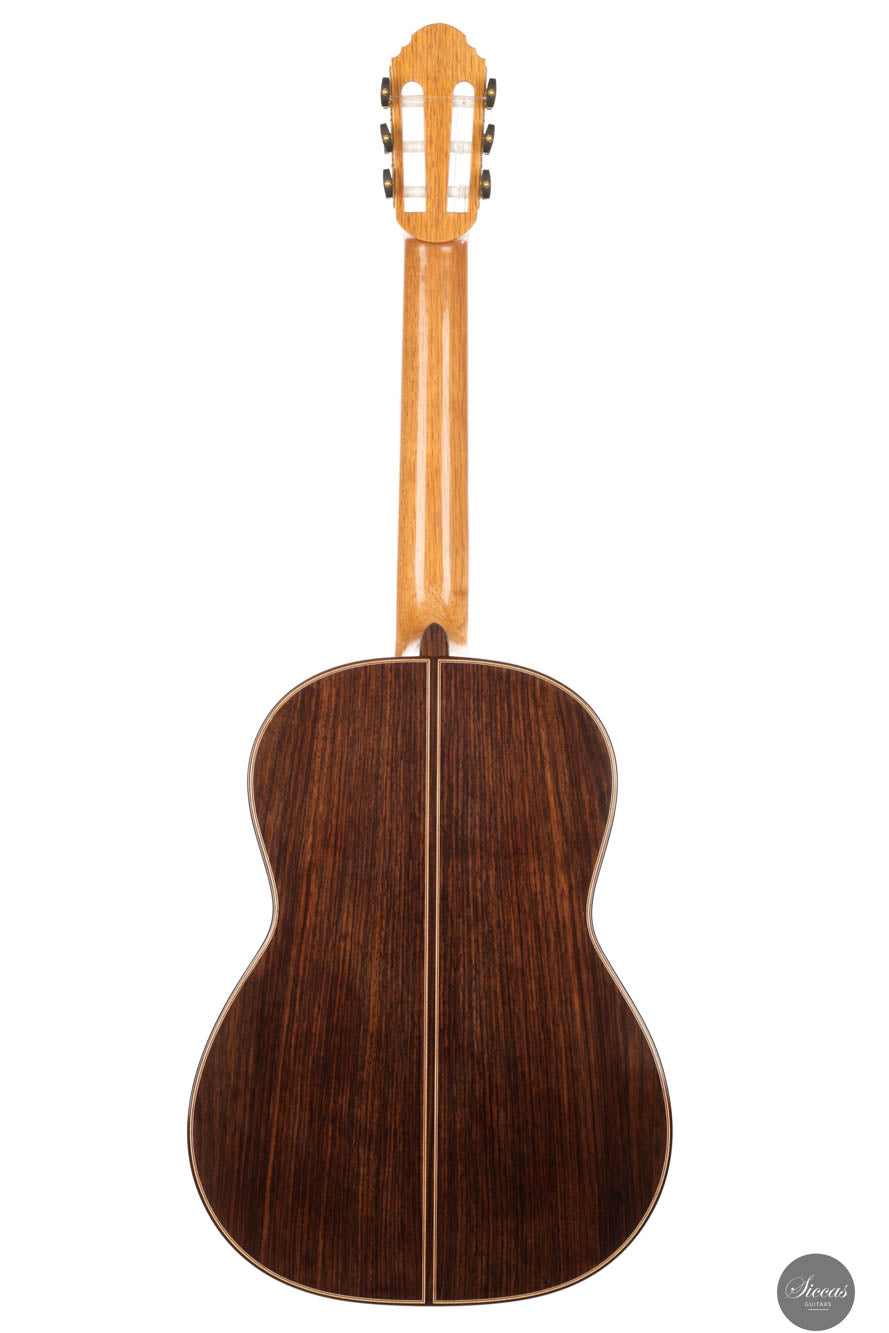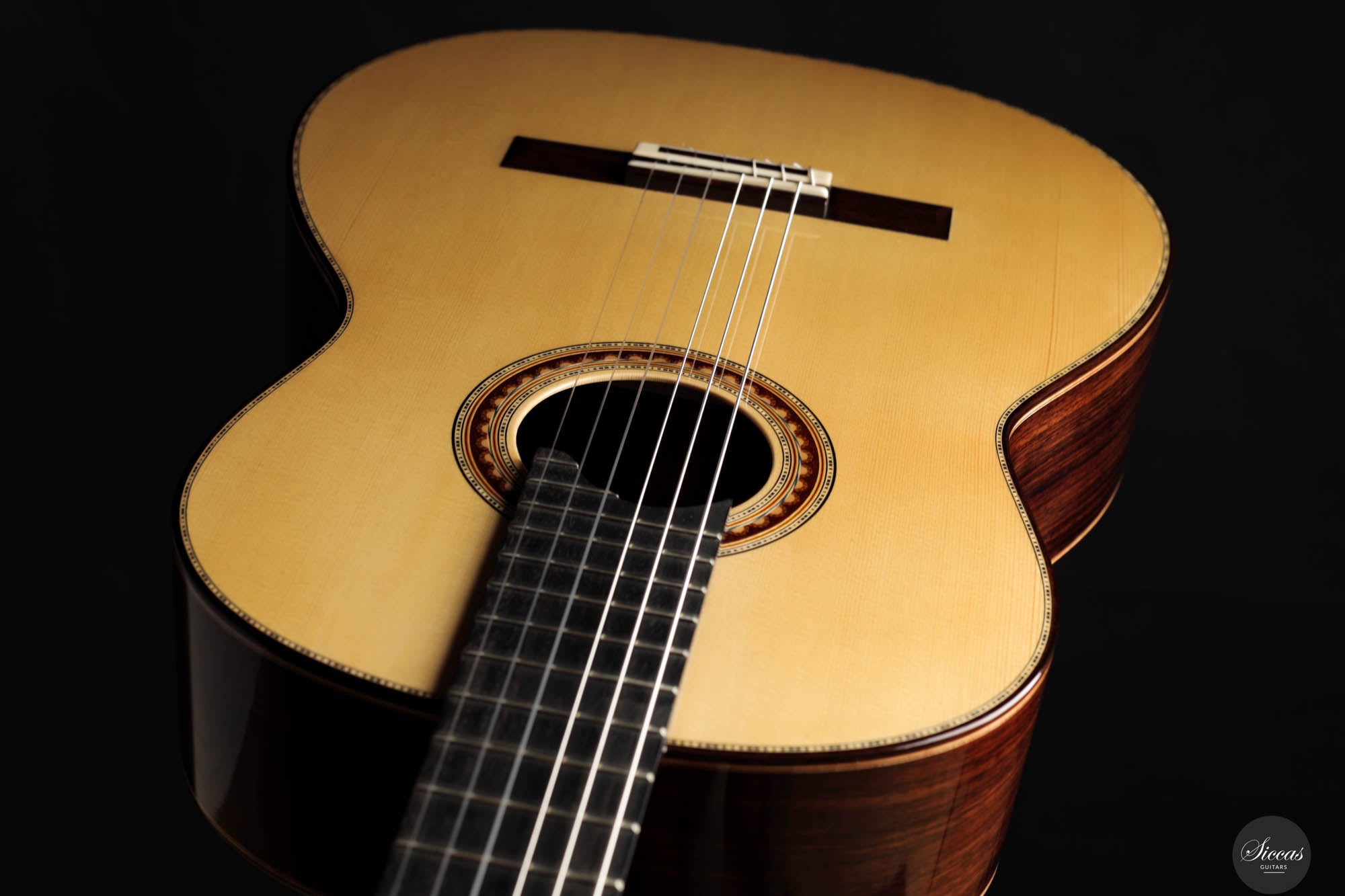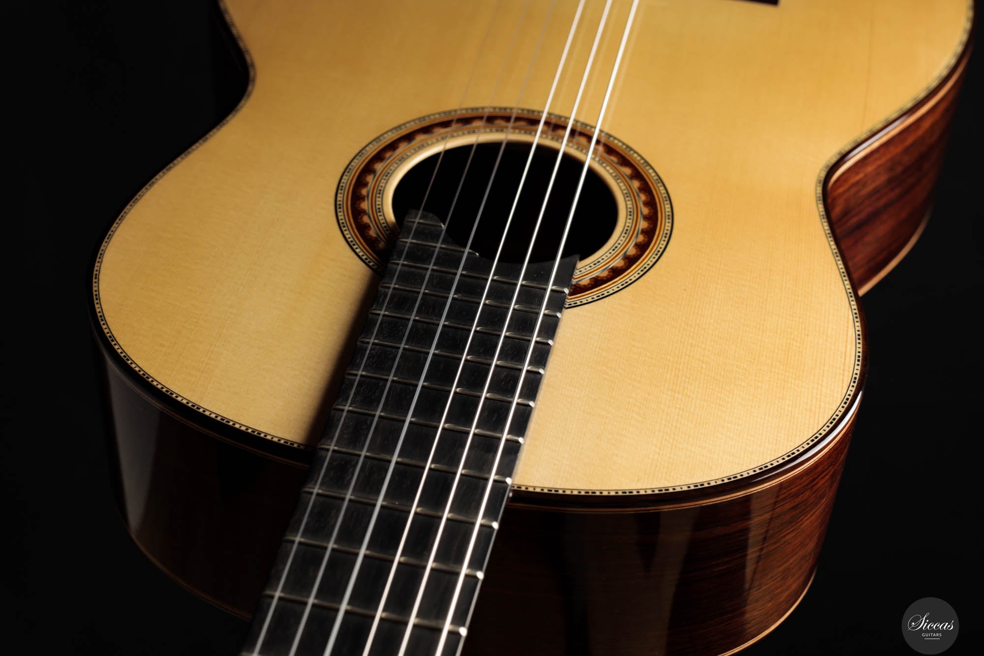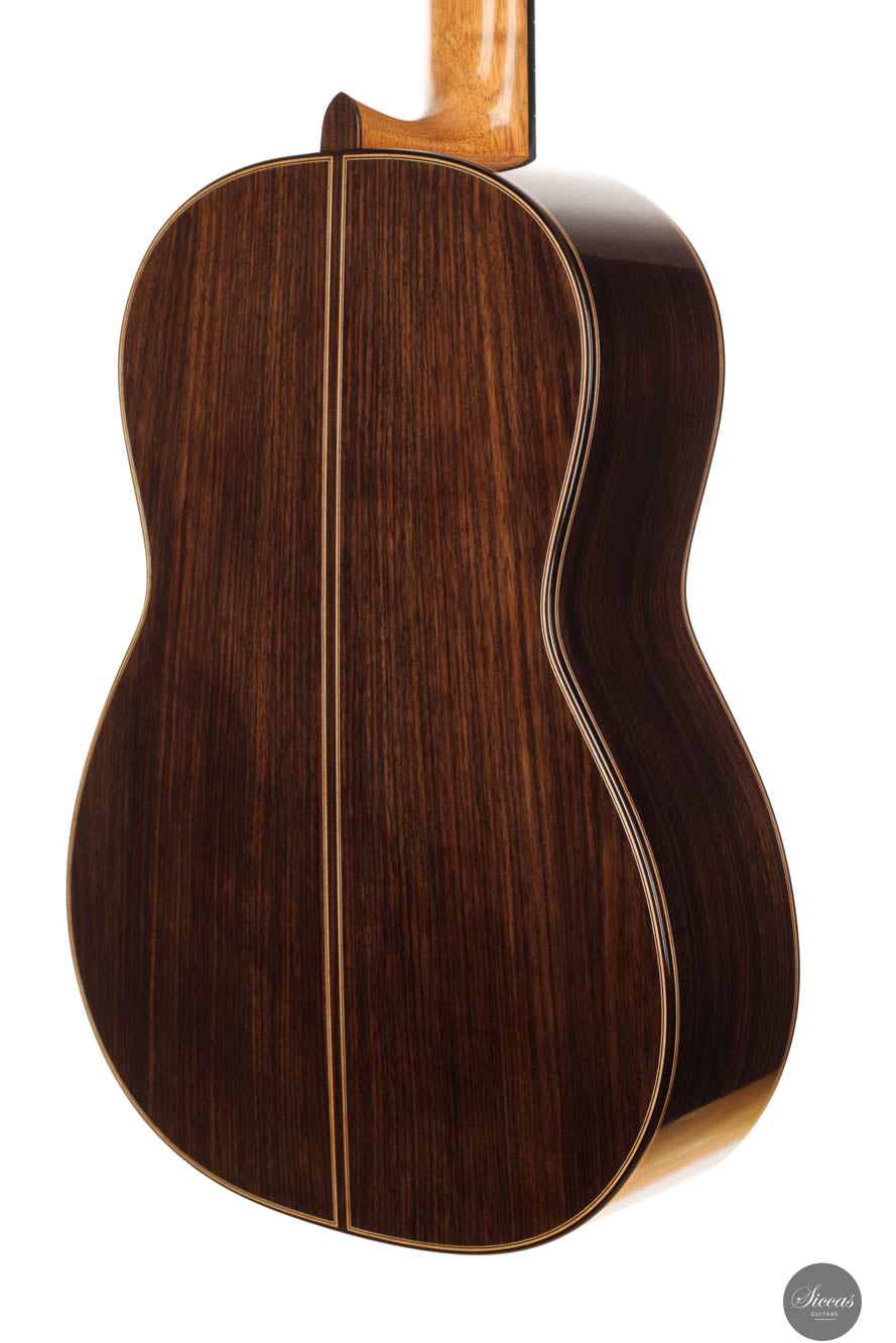 This guitar, number 11, showcases a truly promising future for Henrik. The flawless, mirror-like finish and meticulously selected, premium woods speak to an exceptional level of craftsmanship. Its lightweight design features a spruce top with beautifully tight grain and traditional fan bracing, paired with Indian rosewood back and sides that exude a striking, light red hue. The tone it produces is not just warmly resonant but deeply rich, enveloping the listener with a sense of warmth and fullness. Despite its light build, the guitar delivers a powerful volume, all while preserving an exquisite tonal depth and complexity.