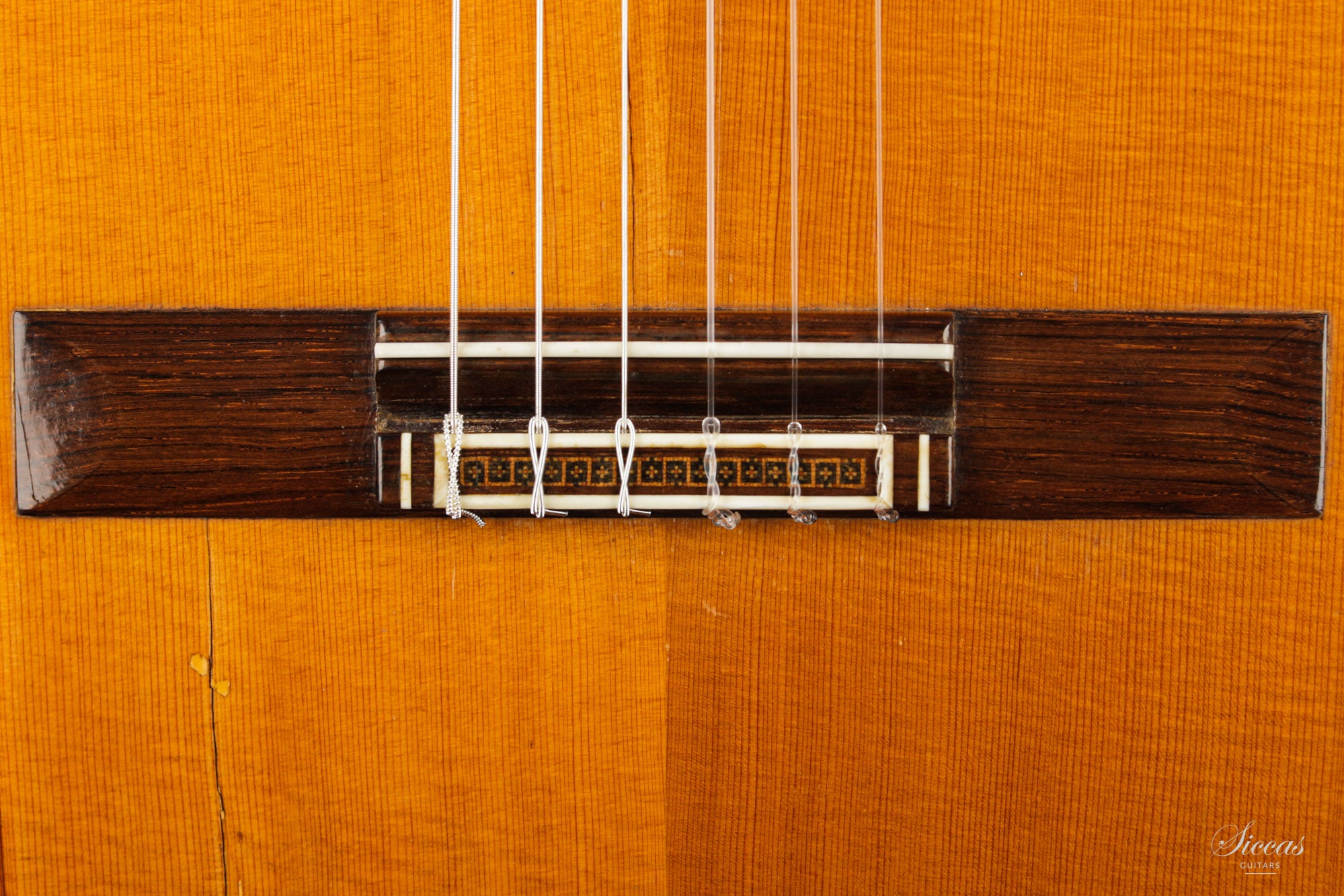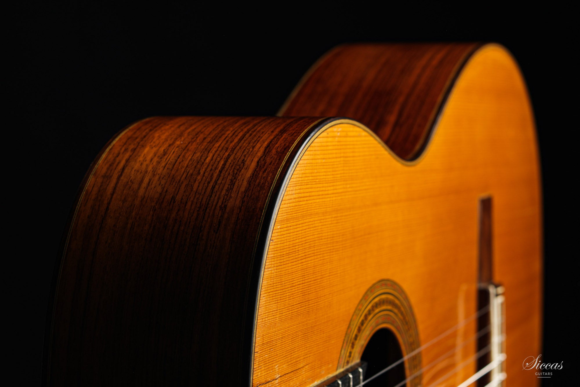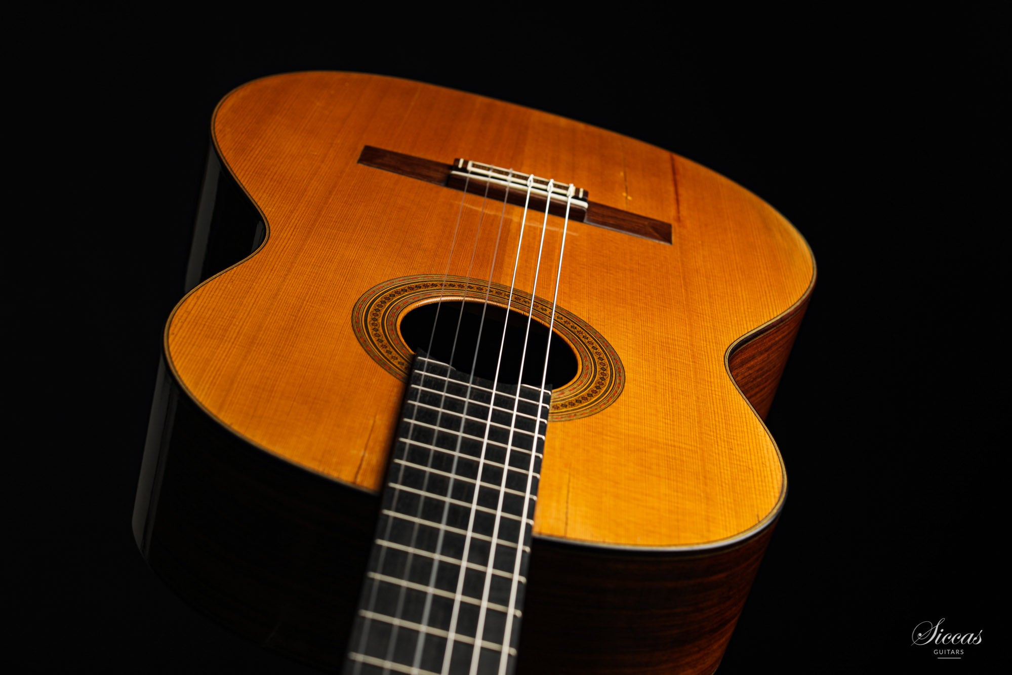 This superb Fléta built in 1958 is an absolutely charming instrument, dating from one of the most interesting periods of Ignacio Fleta's career. This guitar, numbered 131 has a spruce top and the back and sides are made of Indian rosewood. It comes to us from its second owner, having himself bought it from his teacher. The latter had ordered the guitar from Ignacio Fleta and owned several of them. After a few years he returned the guitar to Ignacio Fleta to repair some cracks due to the change in humidity. He took the opportunity to ask the luthier to modify the bracing, which at that time consisted of 9 braces. Ignacio therefore reinforced the upper part of the bracing with five very thin braces. This guitar is therefore absolutely unique, with a marvellous sustain and a tone of immense clarity. Of the cracks on the top, most of them were repaired in the Fleta workshop. Now all the cracks on this guitar have been perfectly repaired and have been stable since the 1990s.