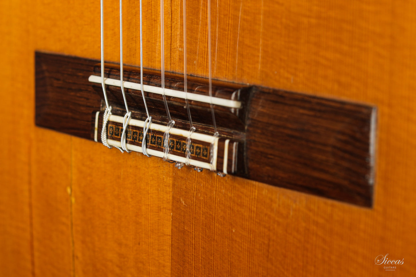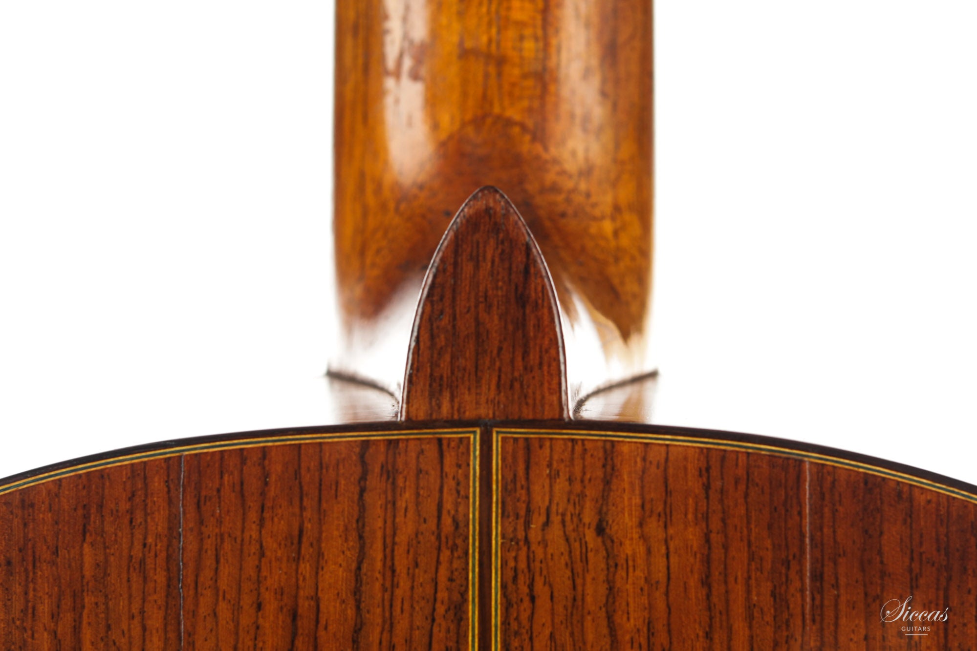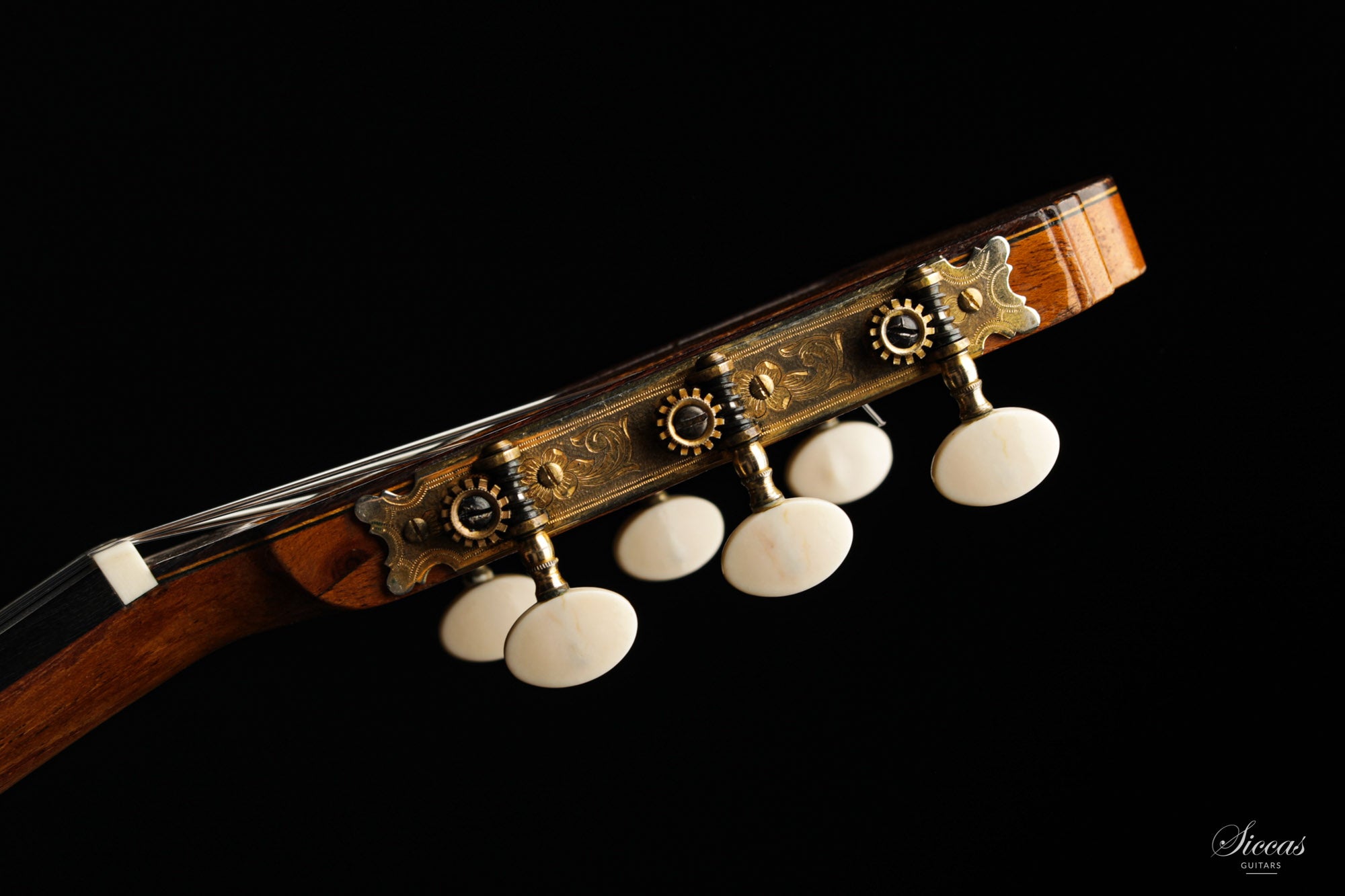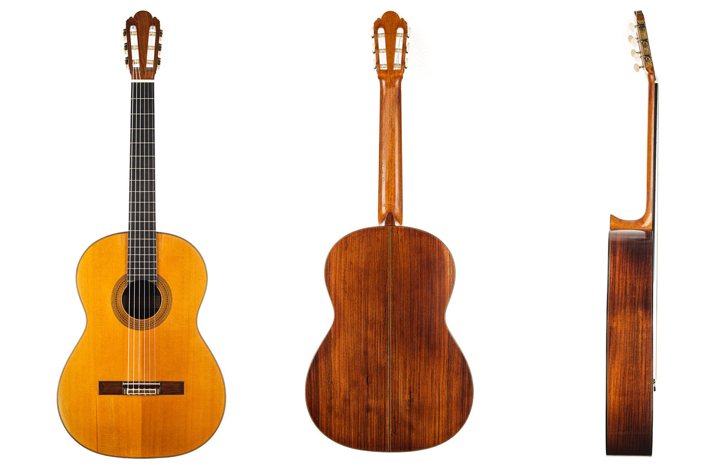 This superb Fléta built in 1958 is an absolutely charming instrument, dating from one of the most interesting periods of Ignacio Fleta's career. This guitar, numbered 131 has a spruce top and the back and sides are made of Indian rosewood. It comes to us from its second owner, having himself bought it from his teacher. The latter had ordered the guitar from Ignacio Fleta and owned several of them. After a few years he returned the guitar to Ignacio Fleta to repair some cracks due to the change in humidity. He took the opportunity to ask the luthier to modify the bracing, which at that time consisted of 9 braces. Ignacio therefore reinforced the upper part of the bracing with five very thin braces. This guitar is therefore absolutely unique, with a marvellous sustain and a tone of immense clarity. Of the cracks on the top, most of them were repaired in the Fleta workshop. Now all the cracks on this guitar have been perfectly repaired and have been stable since the 1990s.