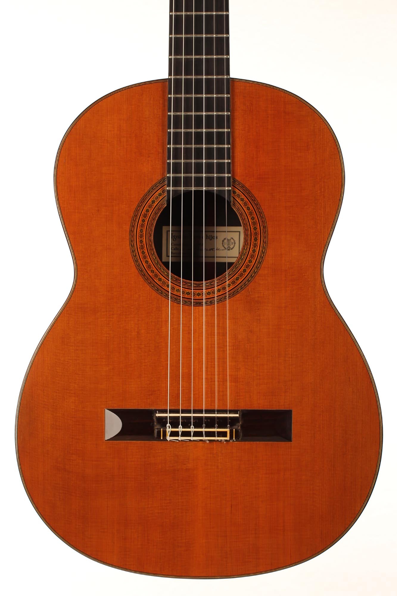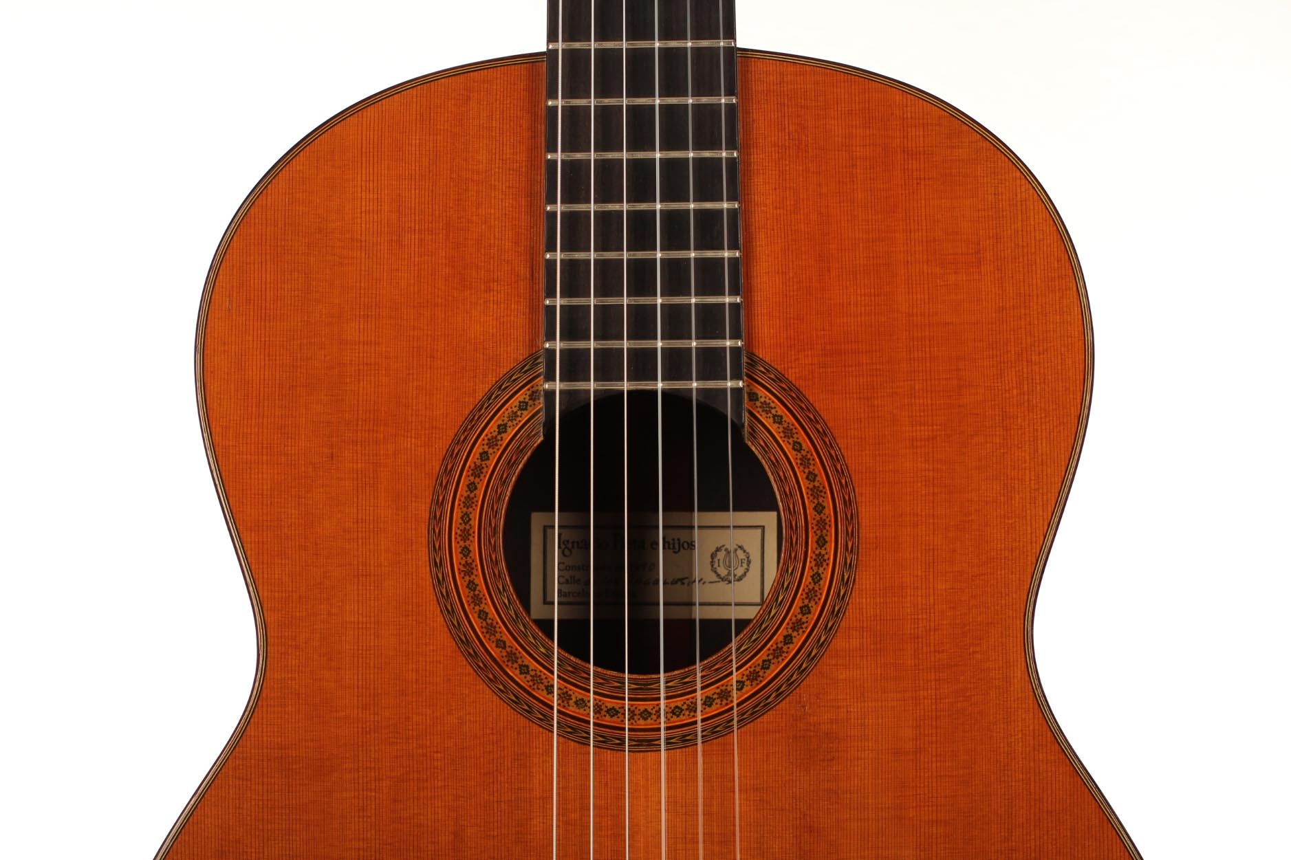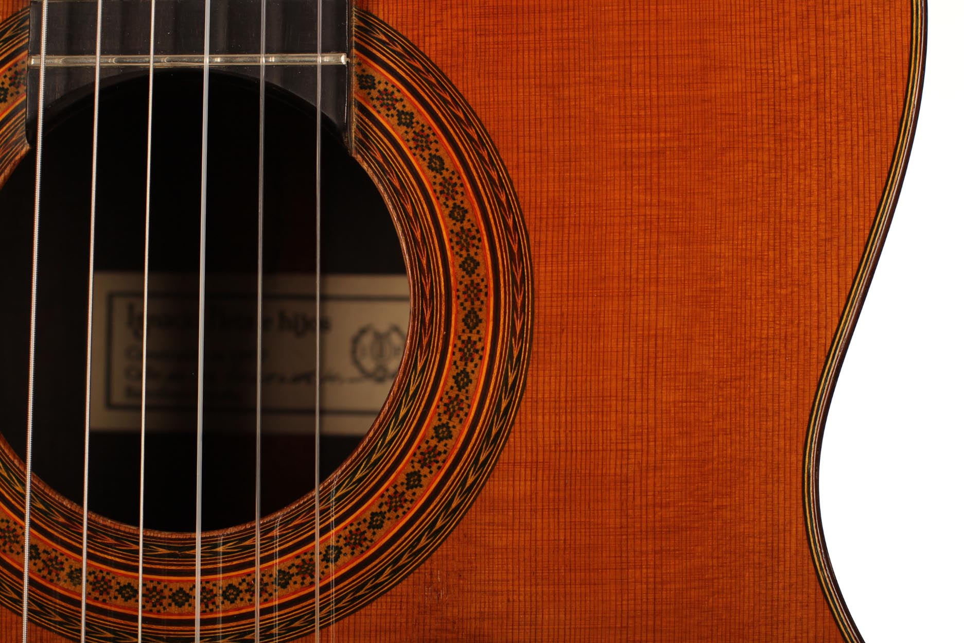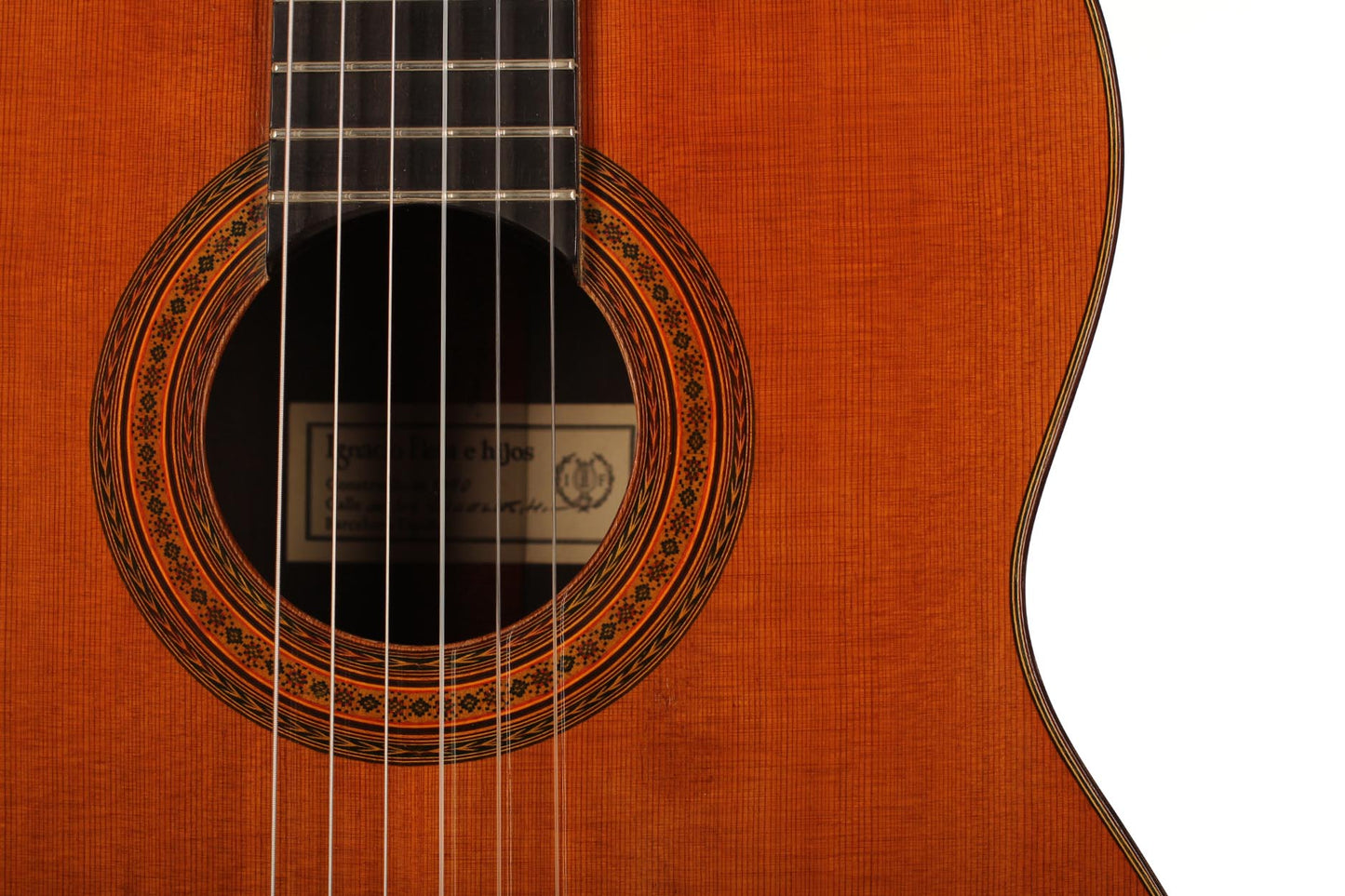 Ignacio Fleta (1897-1977) is one of the most famous luthiers of the twentieth century. In addition of being a successful guitarmaker, he was a recognised bowed and ancient instruments luthier (violins, violas, cellos, vihuelas, and violas de gamba). After his death, his work was continued by his two sons Gabriel and Francisco Fleta and later by his grandson Gabriel Fleta Jr. The current waiting time for a new guitar is about 20 years. This guitar’s rosette is very specific of Fleta’s work and inspired by the famous late ninteenth century guitar makers. The innermost and outermost part of the guitar’s rosette consists of a herringbone pattern ring. In the middle of those two rings, the central mosaic is in the shape of blossoms. This instrument has a cedar top and Indian rosewood back and sides. It is equipped with Fustero machine heads. This guitar is a true rarity for guitar collectors and players. A hard-shell case is included.