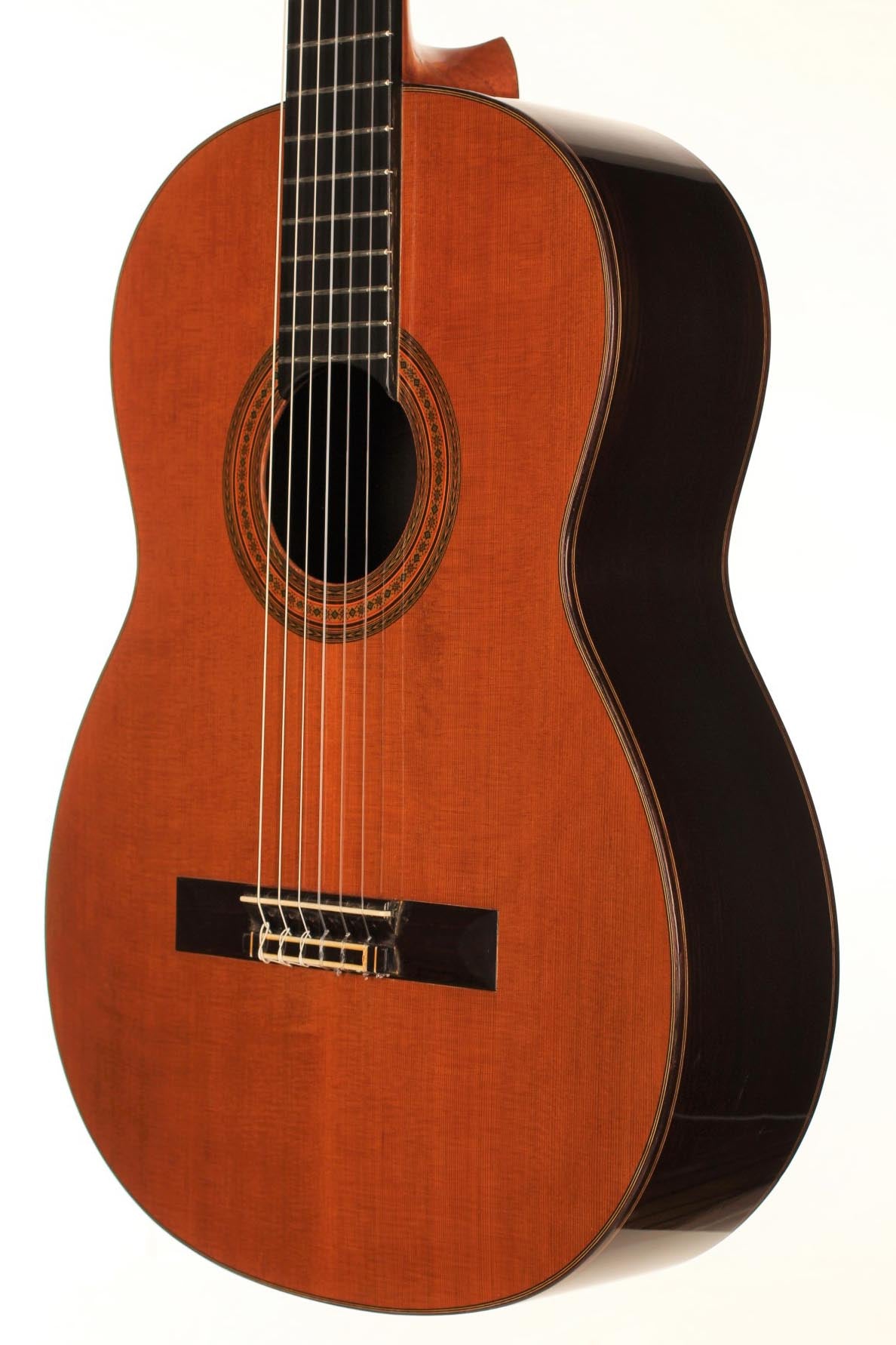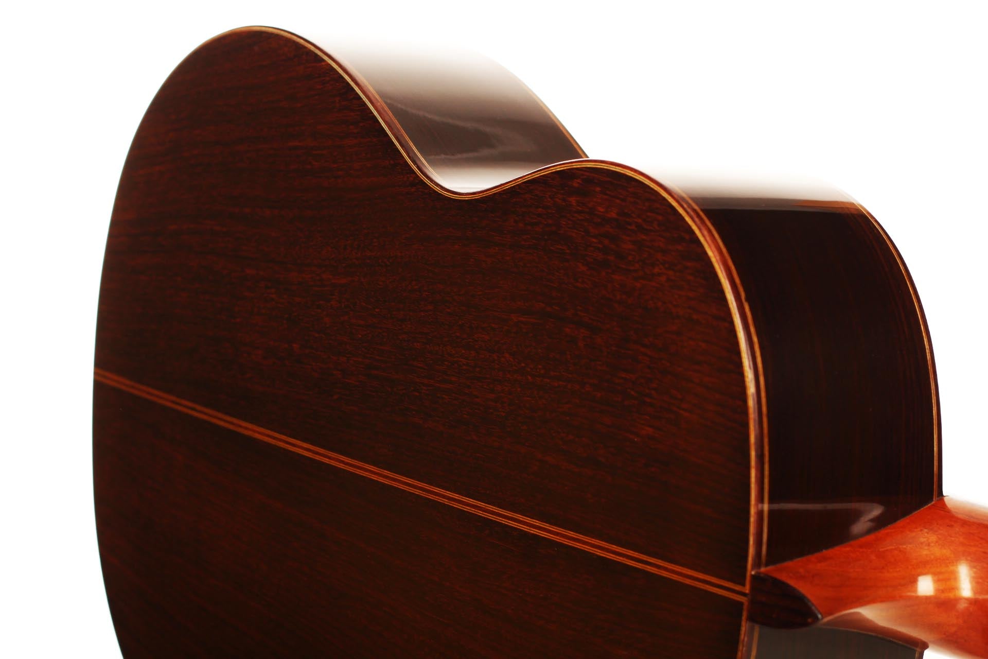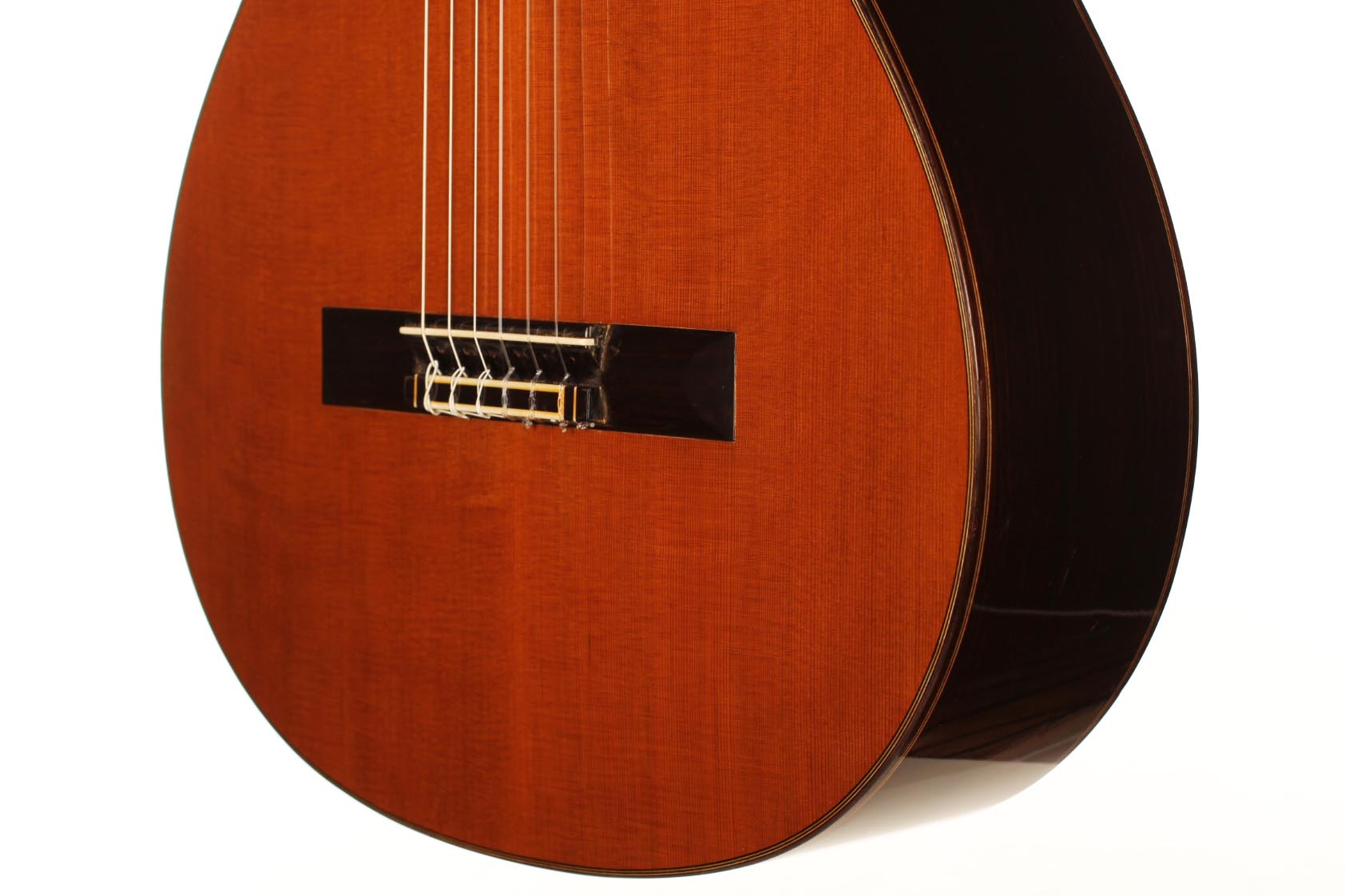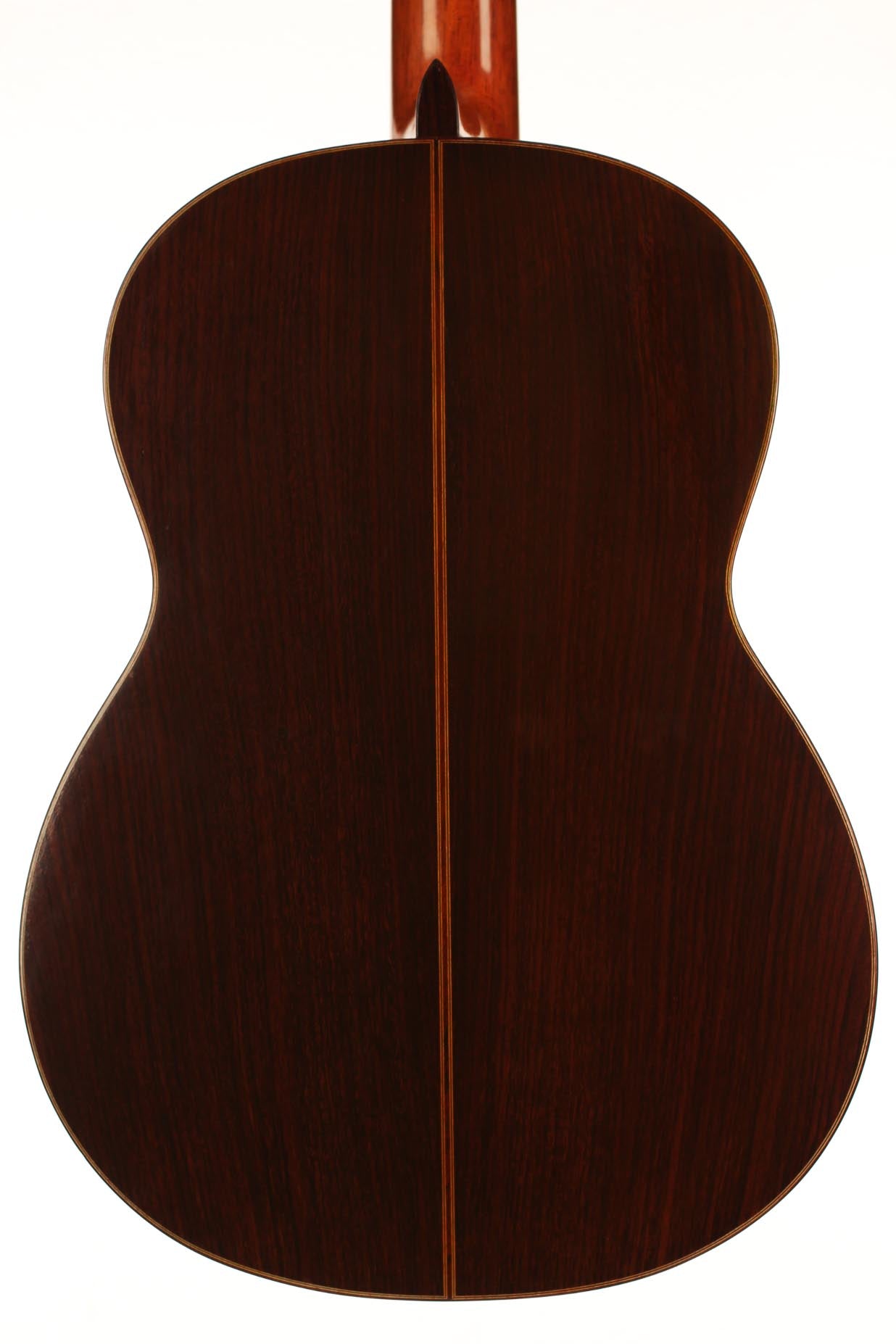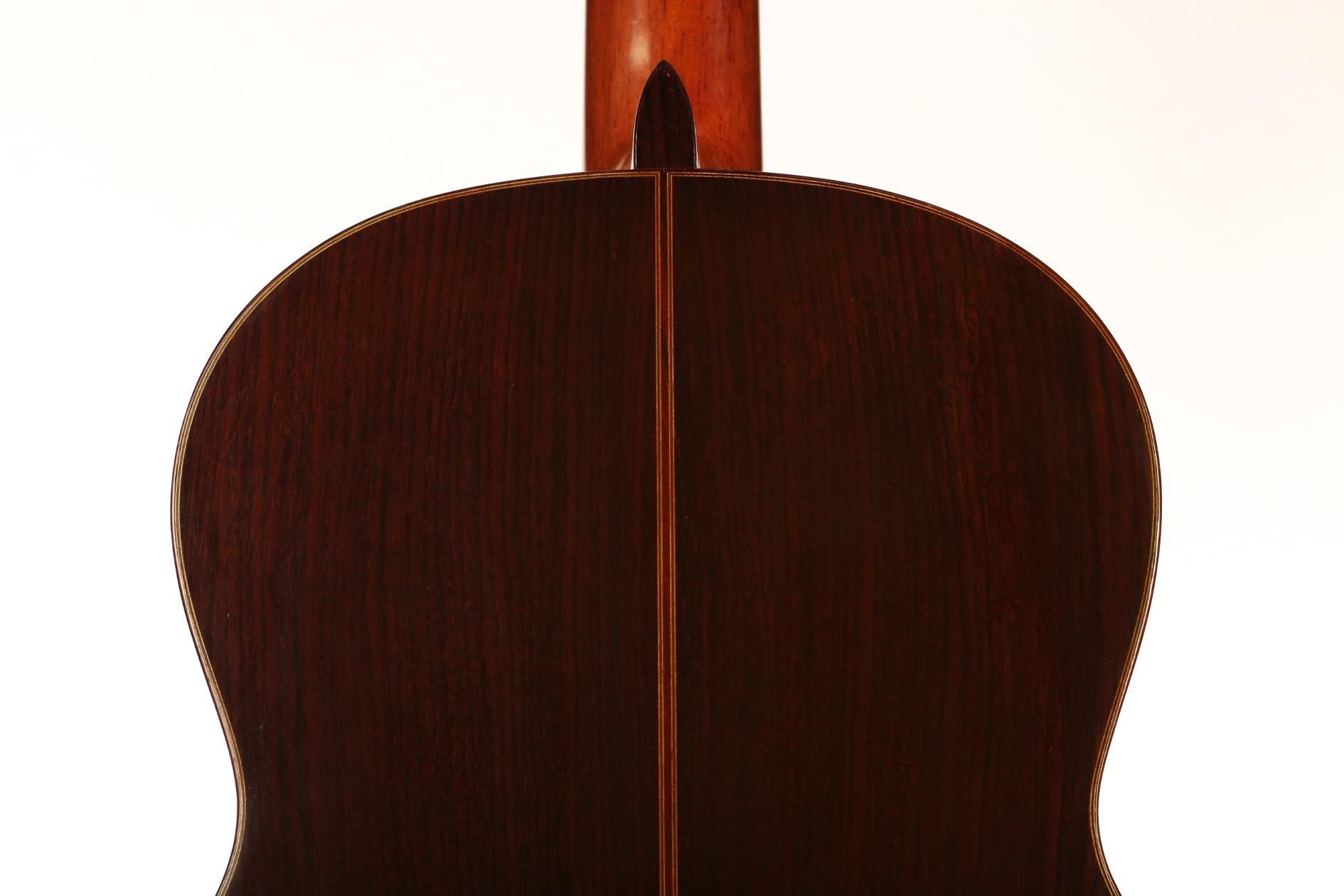 Ignacio Fleta (1897-1977) is one of the most famous luthiers of the twentieth century. In addition of being a successful guitarmaker, he was a recognised bowed and ancient instruments luthier (violins, violas, cellos, vihuelas, and violas de gamba). After his death, his work was continued by his two sons Gabriel and Francisco Fleta and later by his grandson Gabriel Fleta Jr. The current waiting time for a new guitar is about 20 years. This guitar’s rosette is very specific of Fleta’s work and inspired by the famous late ninteenth century guitar makers. The innermost and outermost part of the guitar’s rosette consists of a herringbone pattern ring. In the middle of those two rings, the central mosaic is in the shape of blossoms. This instrument has a cedar top and Indian rosewood back and sides. It is equipped with Fustero machine heads. This guitar is a true rarity for guitar collectors and players. A hard-shell case is included.
