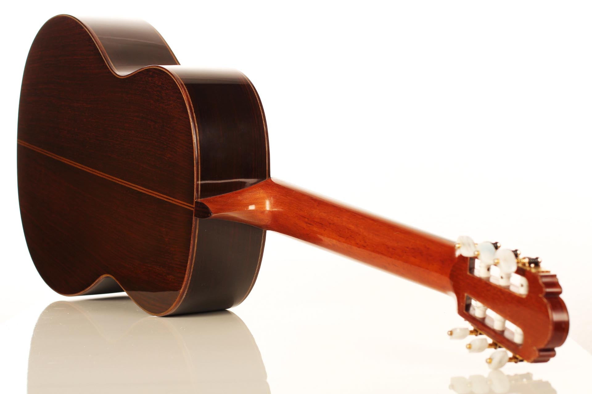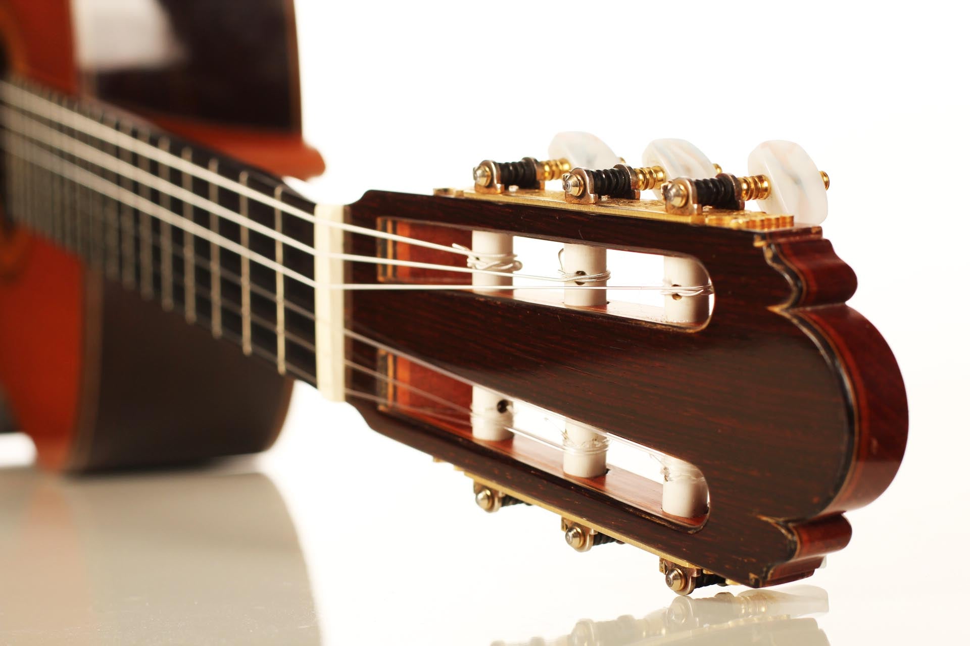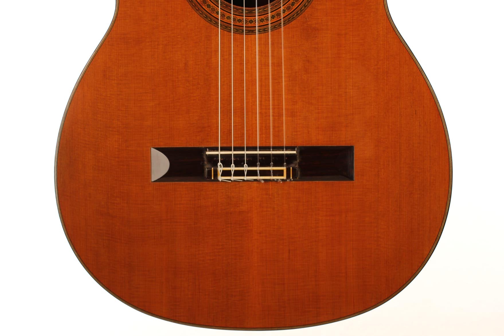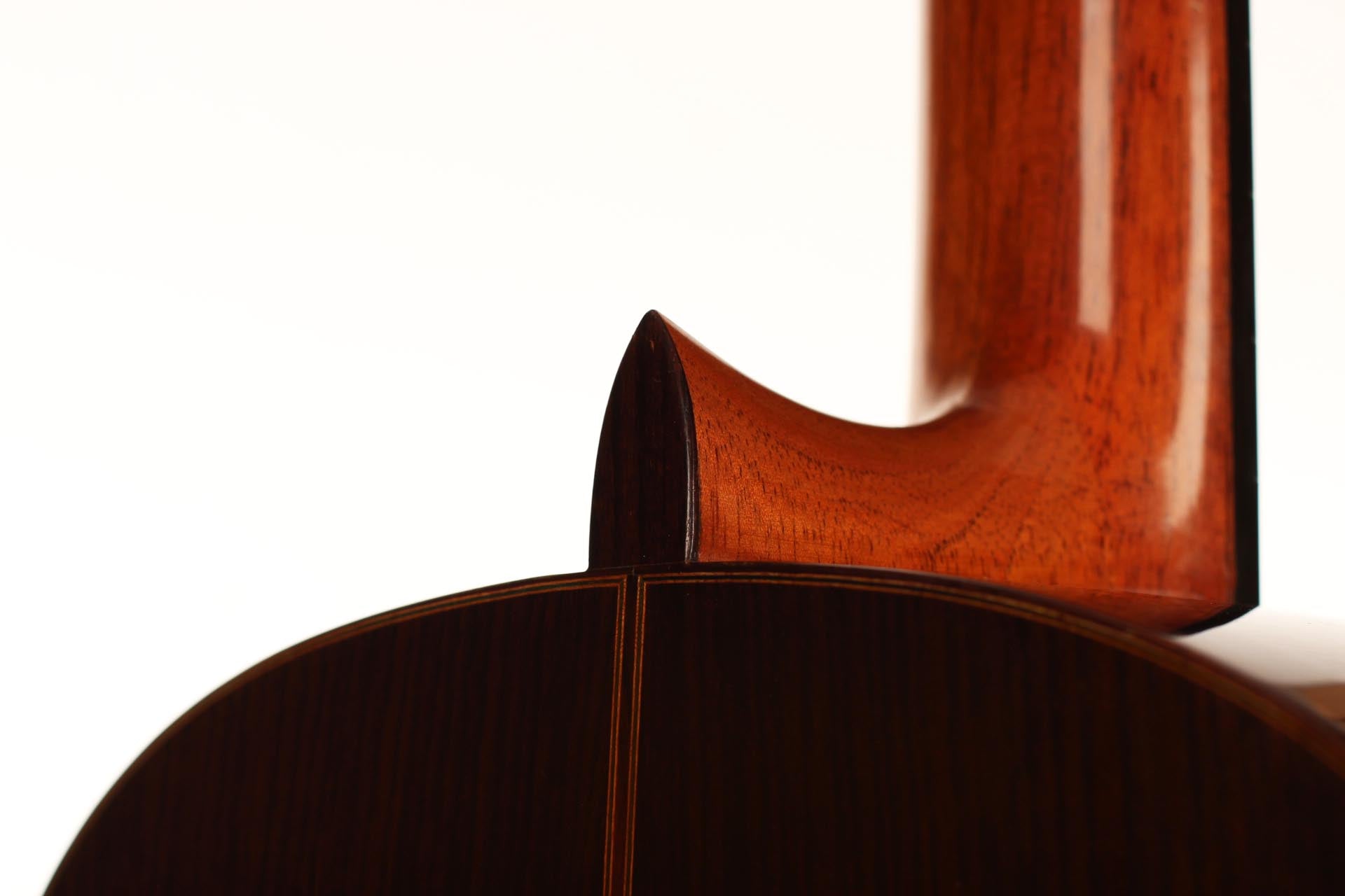 Ignacio Fleta (1897-1977) is one of the most famous luthiers of the twentieth century. In addition of being a successful guitarmaker, he was a recognised bowed and ancient instruments luthier (violins, violas, cellos, vihuelas, and violas de gamba). After his death, his work was continued by his two sons Gabriel and Francisco Fleta and later by his grandson Gabriel Fleta Jr. The current waiting time for a new guitar is about 20 years. This guitar’s rosette is very specific of Fleta’s work and inspired by the famous late ninteenth century guitar makers. The innermost and outermost part of the guitar’s rosette consists of a herringbone pattern ring. In the middle of those two rings, the central mosaic is in the shape of blossoms. This instrument has a cedar top and Indian rosewood back and sides. It is equipped with Fustero machine heads. This guitar is a true rarity for guitar collectors and players. A hard-shell case is included.