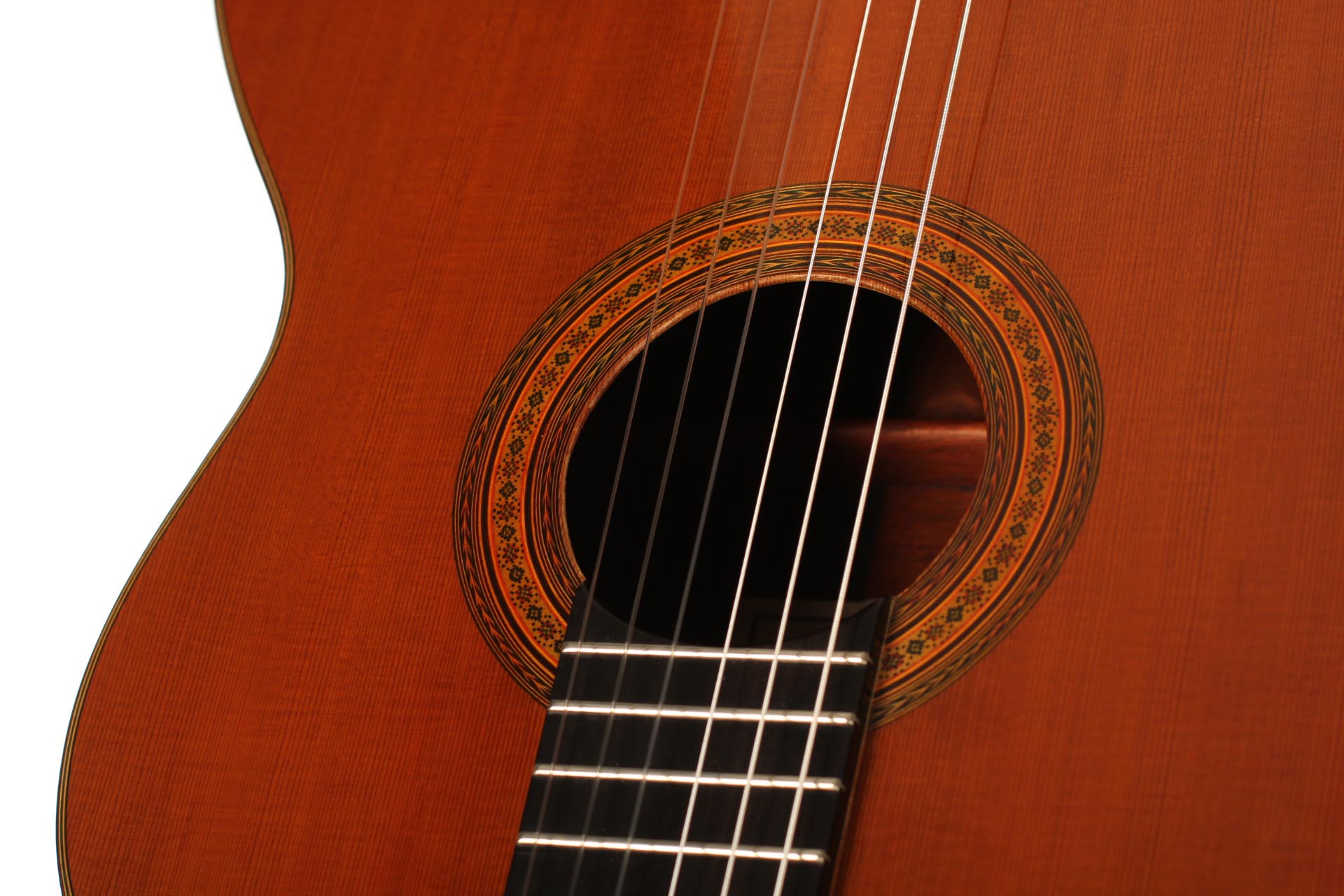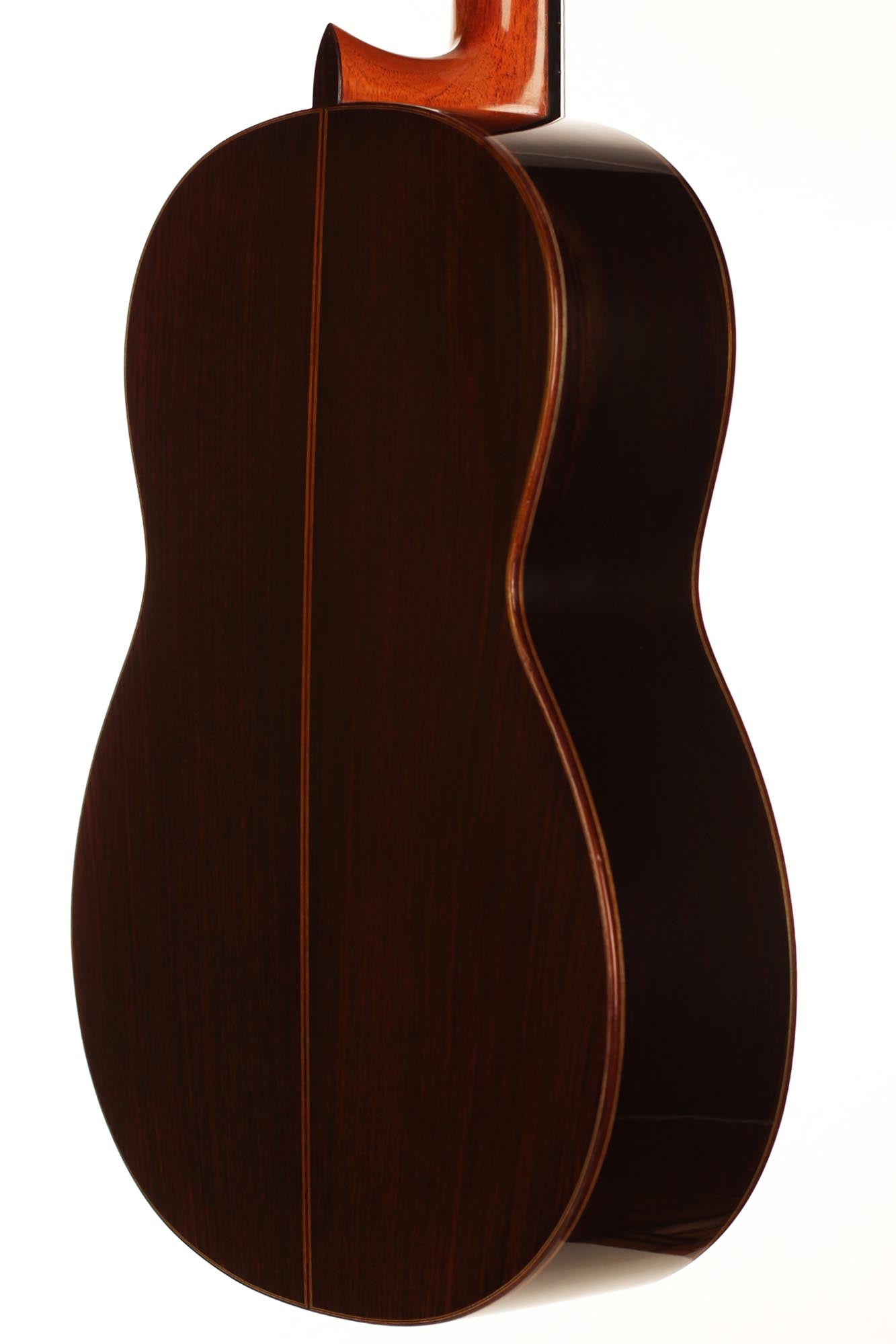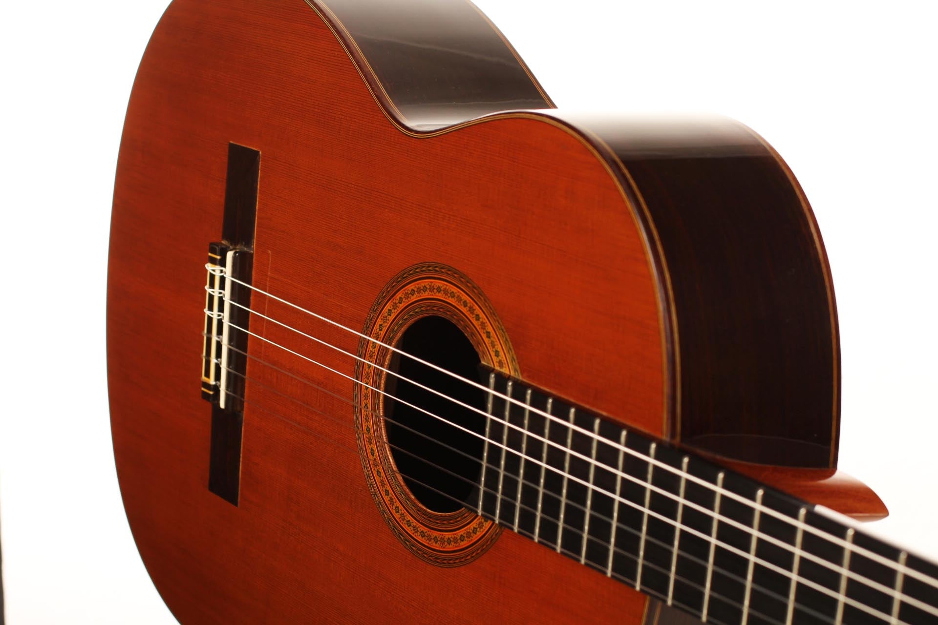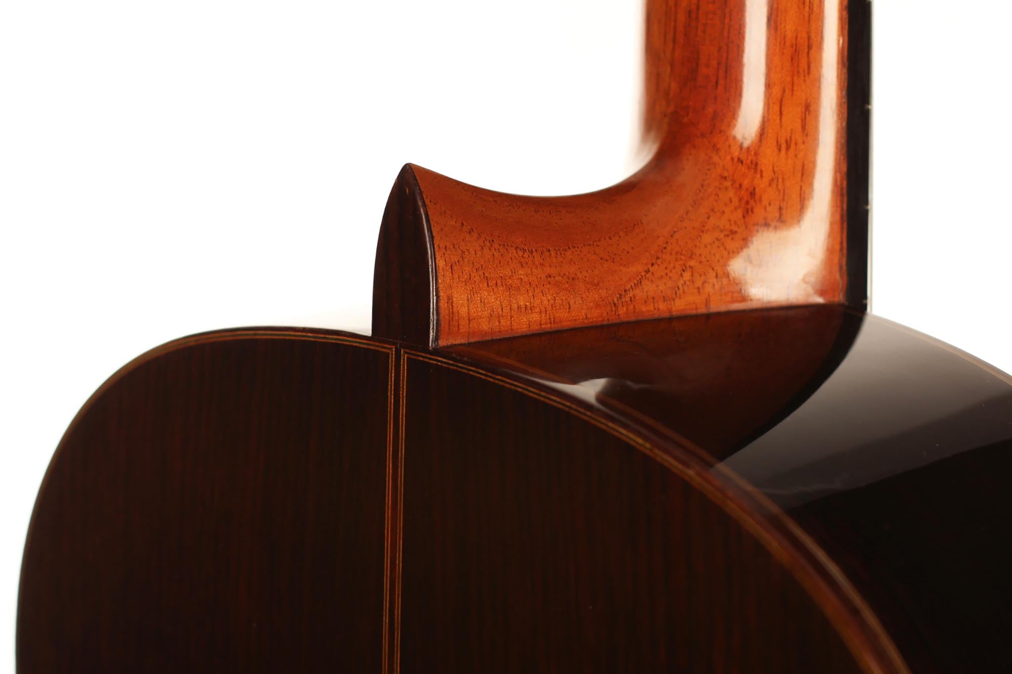 Ignacio Fleta (1897-1977) is one of the most famous luthiers of the twentieth century. In addition of being a successful guitarmaker, he was a recognised bowed and ancient instruments luthier (violins, violas, cellos, vihuelas, and violas de gamba). After his death, his work was continued by his two sons Gabriel and Francisco Fleta and later by his grandson Gabriel Fleta Jr. The current waiting time for a new guitar is about 20 years. This guitar’s rosette is very specific of Fleta’s work and inspired by the famous late ninteenth century guitar makers. The innermost and outermost part of the guitar’s rosette consists of a herringbone pattern ring. In the middle of those two rings, the central mosaic is in the shape of blossoms. This instrument has a cedar top and Indian rosewood back and sides. It is equipped with Fustero machine heads. This guitar is a true rarity for guitar collectors and players. A hard-shell case is included.