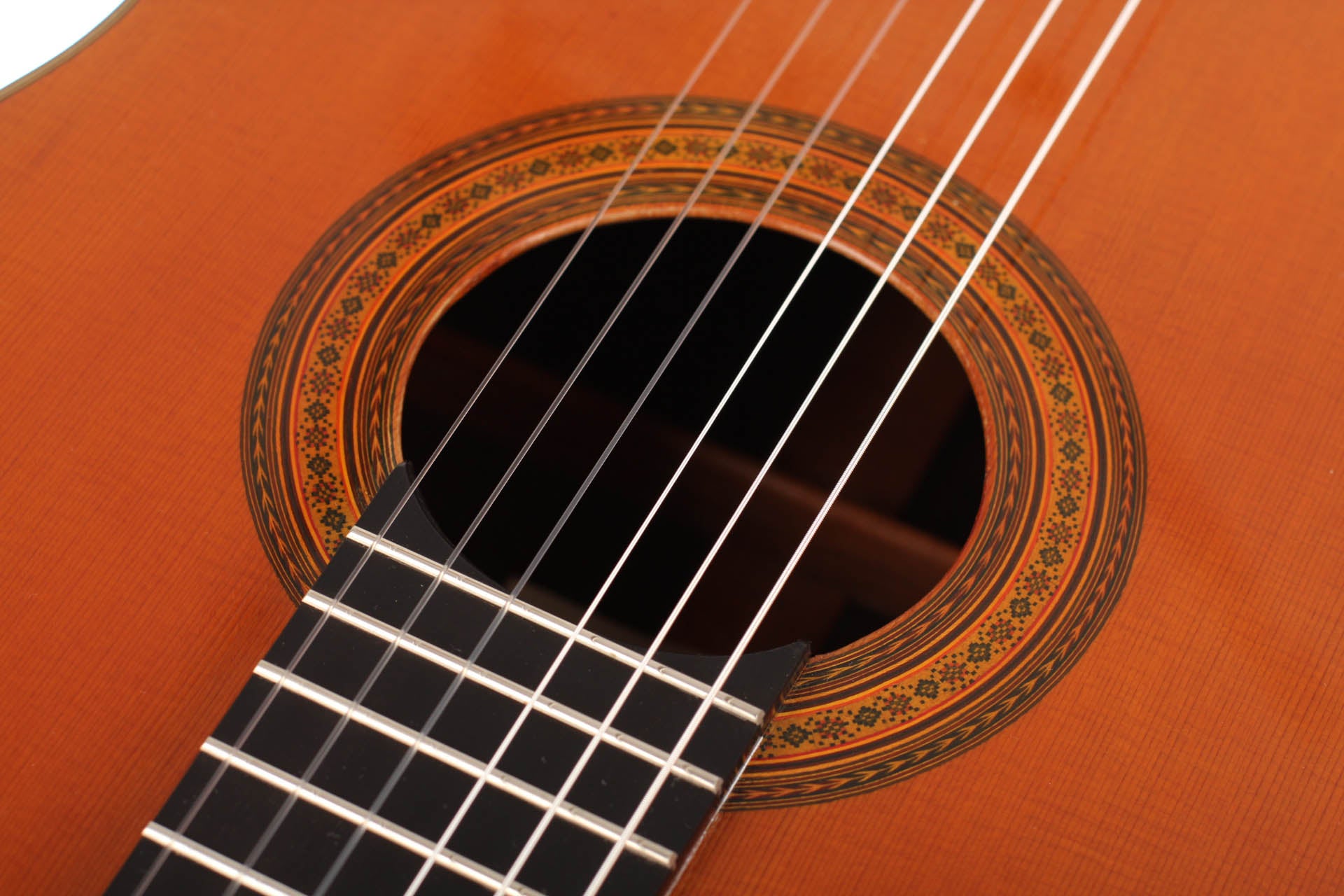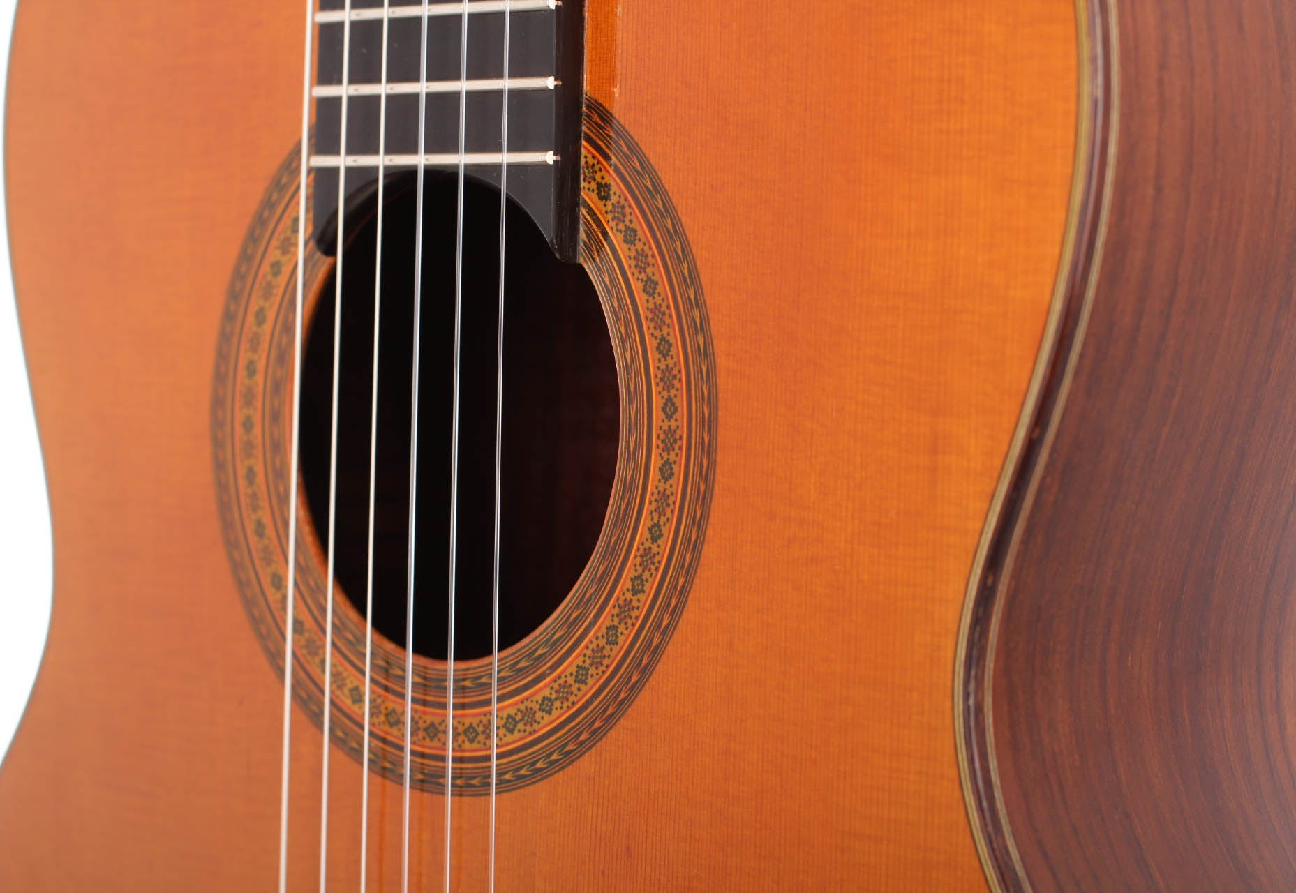 The rosette consists of two rings with herringbone pattern on the innermost and the outermost part and is magnificently decorated. In the middle of those two rings another ring can be found which shows a mosaic in the shape of blossoms. The top is made of cedar and the sides and the back are made of Indian rosewood. The guitar is equipped with Fustero tuning machines. The overall condition is excellent; it has a few signs of playing on the top and on the back. This guitar is a true rarity for guitar collectors and players. A hardshell case is included.