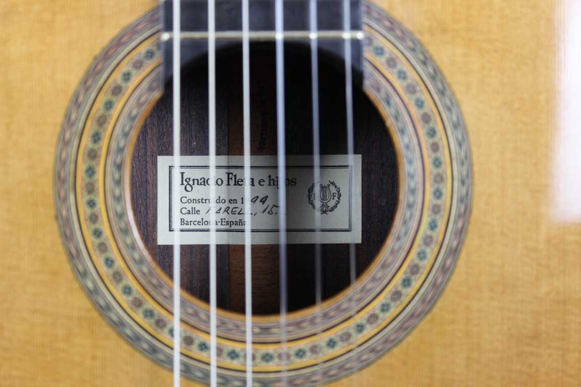 Ignacio Fleta lived from 1897 till 1977 and belongs to the most famous luthiers worldwide. He did not only build guitars, but also violins, violas, violoncellos, vihuelas, and violas de gamba. After his death, his work was continued by his two sons Gabriel and Francisco Fleta and his grandson Gabriel Fleta Jr. The waiting time after a new order today amounts to approximately 20 years. This guitar is a true rarity for guitar collectors and players. The innermost and outermost part of the guitar’s rosette consists of one ring with herringbone pattern design respectively. In the middle of those two rings another ring can be found which shows a mosaic in the shape of blossoms. The top is made of cedar and the sides and the back are made of Indian rosewood. The guitar is equipped with Fustero machine heads. The overall condition is very good, it has only a few signs of playing wear. This guitar is a true rarity for guitar collectors and players.