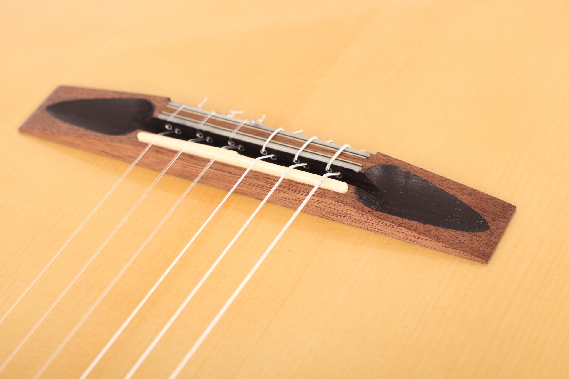 The nomex double back construction is definitely unique to his instruments and the “structured sides” enhance the movement of the top and reduce stresses on the system that would otherwise compromise tone. As a result, this guitar has strong sound and projection. The sustain is a dream! The 12-hole walnut bridge has aluminum reinforced string holes to reduce the long-term distortion of the tie block ensuring a consistent break angle over the life of the instrument. The guitar has Gotoh premium machine heads with aluminum rollers. A hardshell case is included.