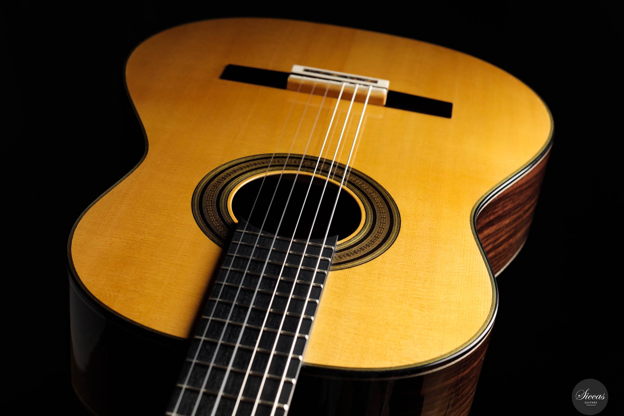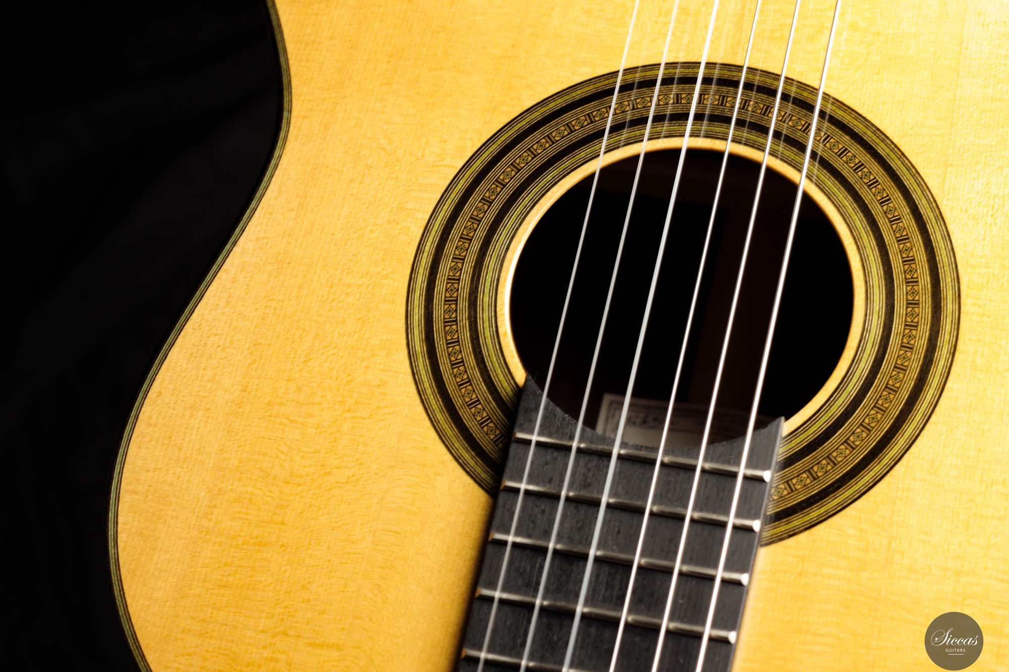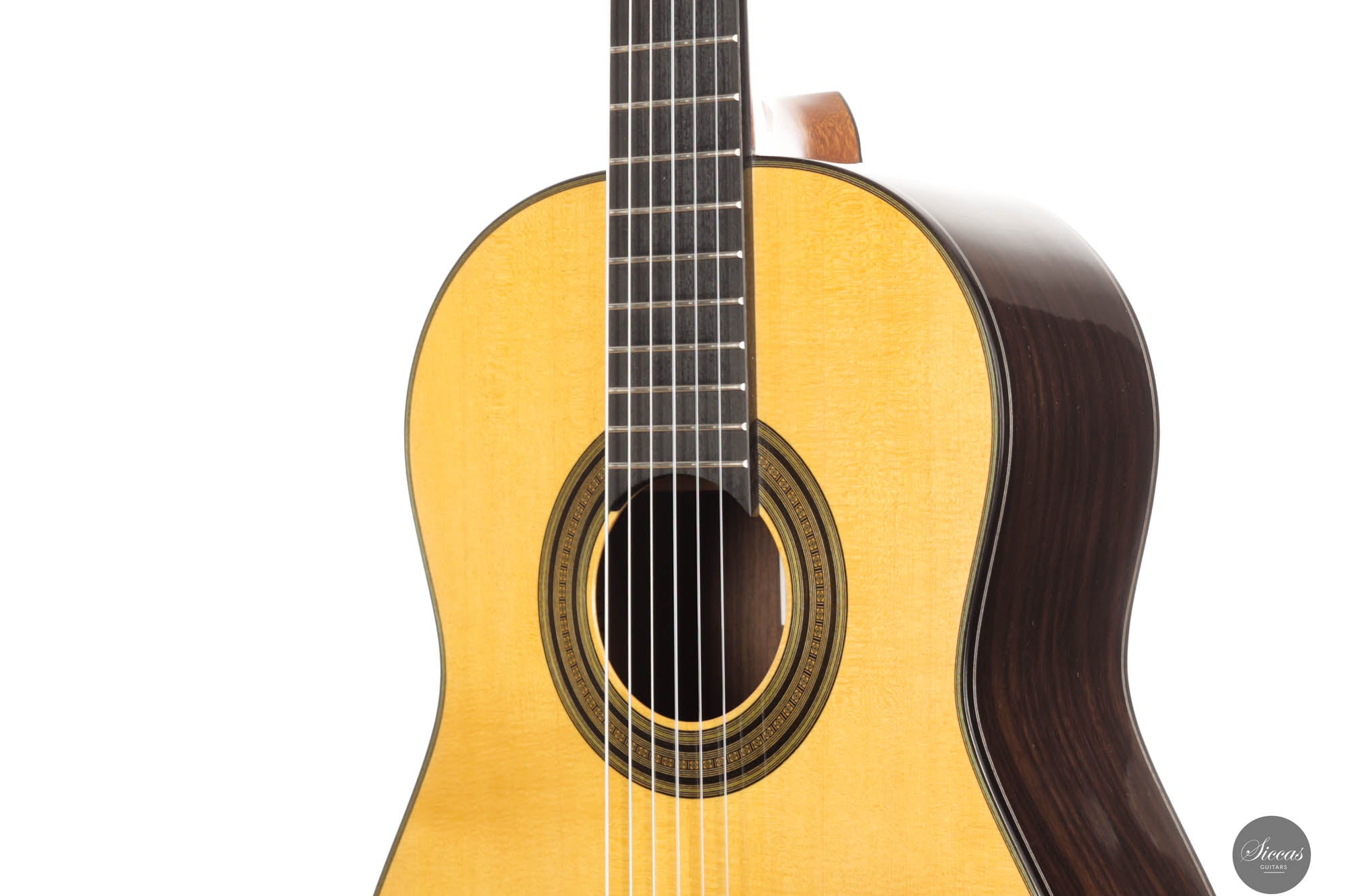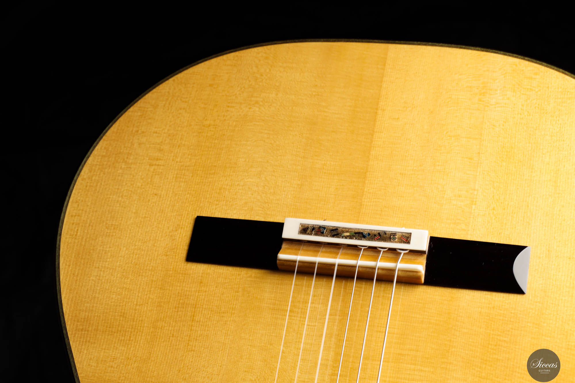 This guitar, crafted by Jialan, is a stunning tribute to the renowned guitar maker Robert Bouchet, capturing the essence and signature sound of the Bouchet tradition. Its back and sides are crafted from exquisite Indian Rosewood, perfectly complemented by a finely grained Spruce top. Paying tribute to the Master, Jialan includes colored ornaments on this instrument by the green inlay in the rosette, which forms a wonderful harmony with the honey-colored spruce top. Together with the Bouchet-inspired bracing, this combination produces a warm, rounded tone with exceptional projection. The trebles are smooth and rounded, delivering clear, articulate notes, while the overall volume is impressively powerful. Designed for the concert stage, this guitar excels in every aspect expected of a high-caliber instrument, making it a true treasure for both performers and collectors alike.