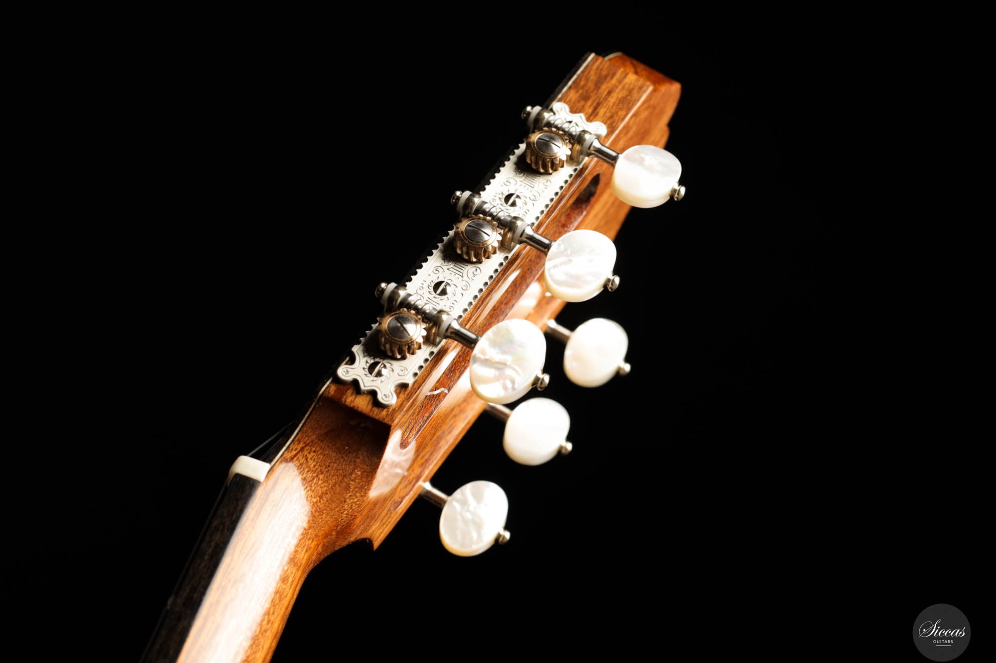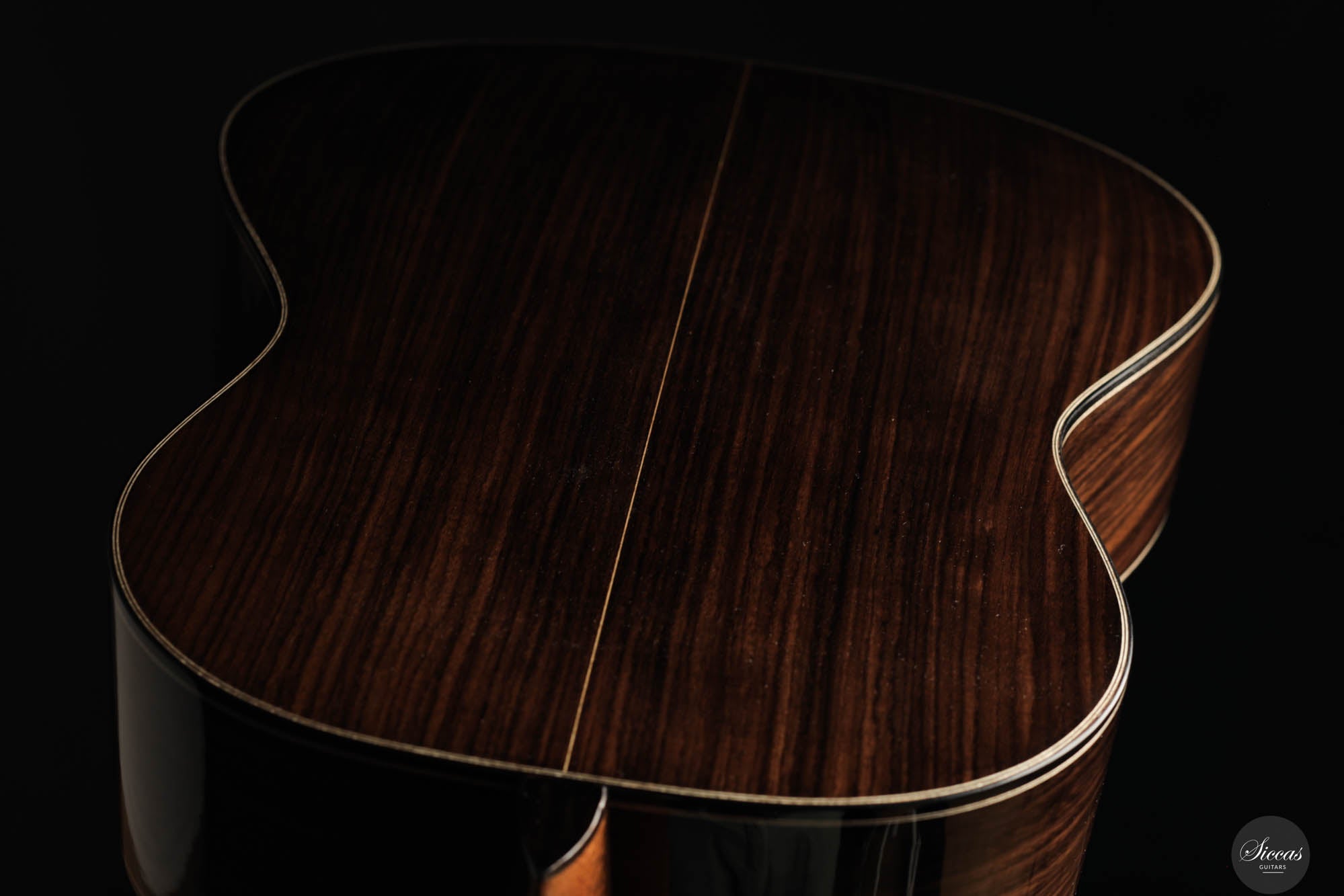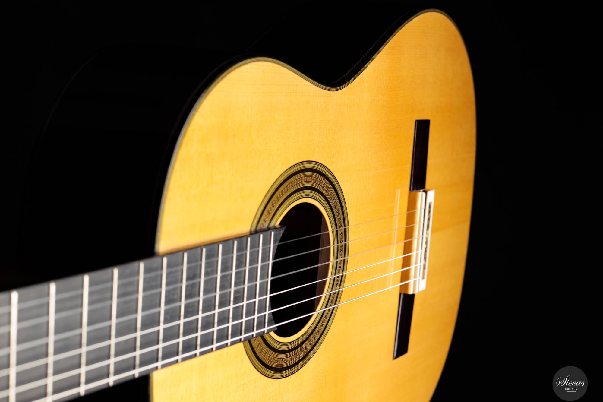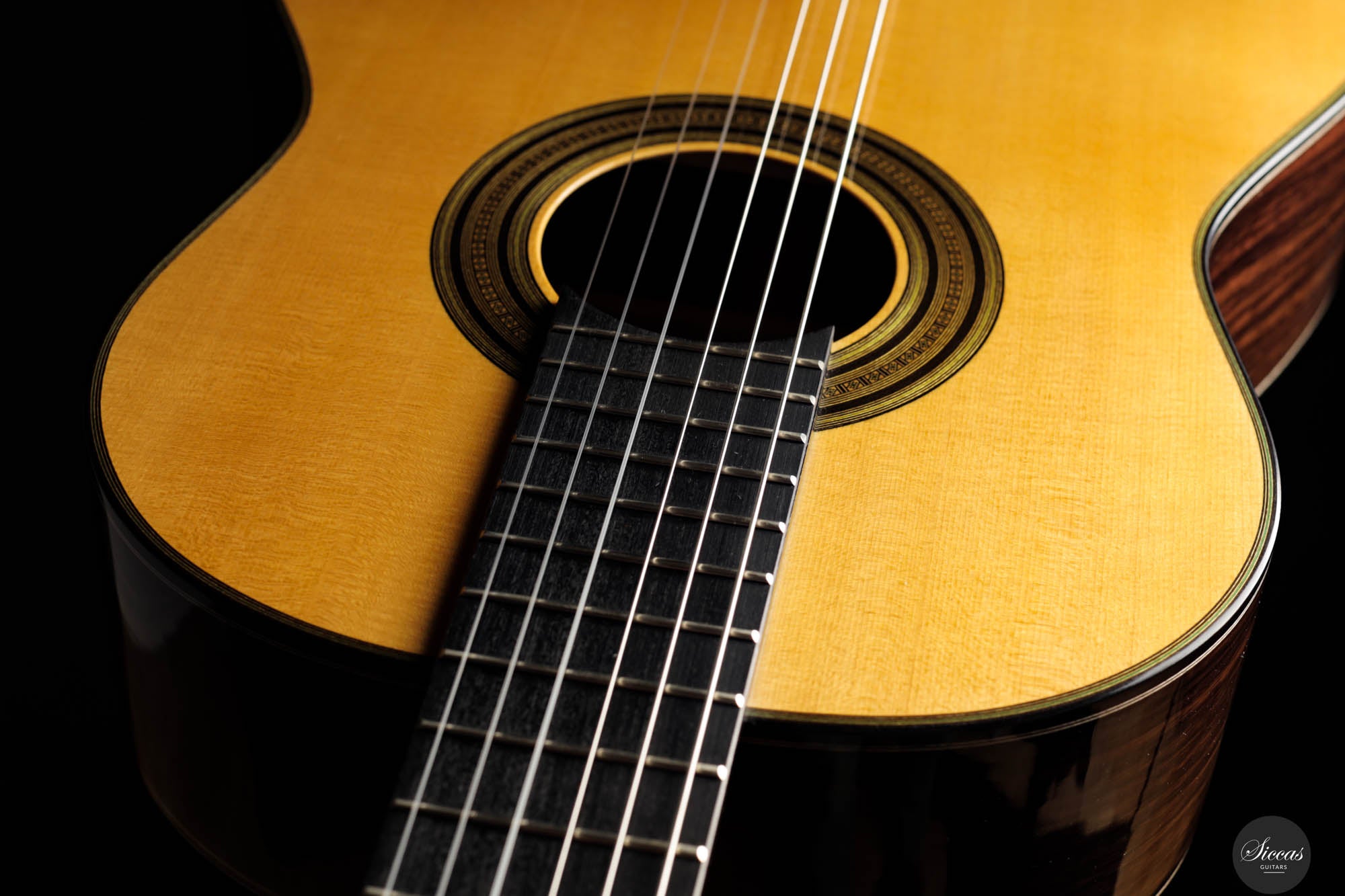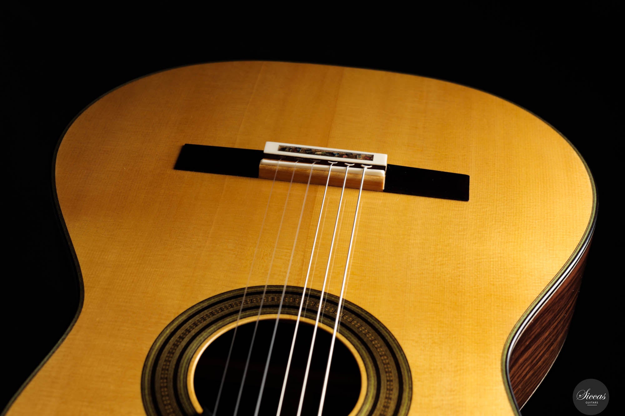 This guitar, crafted by Jialan, is a stunning tribute to the renowned guitar maker Robert Bouchet, capturing the essence and signature sound of the Bouchet tradition. Its back and sides are crafted from exquisite Indian Rosewood, perfectly complemented by a finely grained Spruce top. Paying tribute to the Master, Jialan includes colored ornaments on this instrument by the green inlay in the rosette, which forms a wonderful harmony with the honey-colored spruce top. Together with the Bouchet-inspired bracing, this combination produces a warm, rounded tone with exceptional projection. The trebles are smooth and rounded, delivering clear, articulate notes, while the overall volume is impressively powerful. Designed for the concert stage, this guitar excels in every aspect expected of a high-caliber instrument, making it a true treasure for both performers and collectors alike.