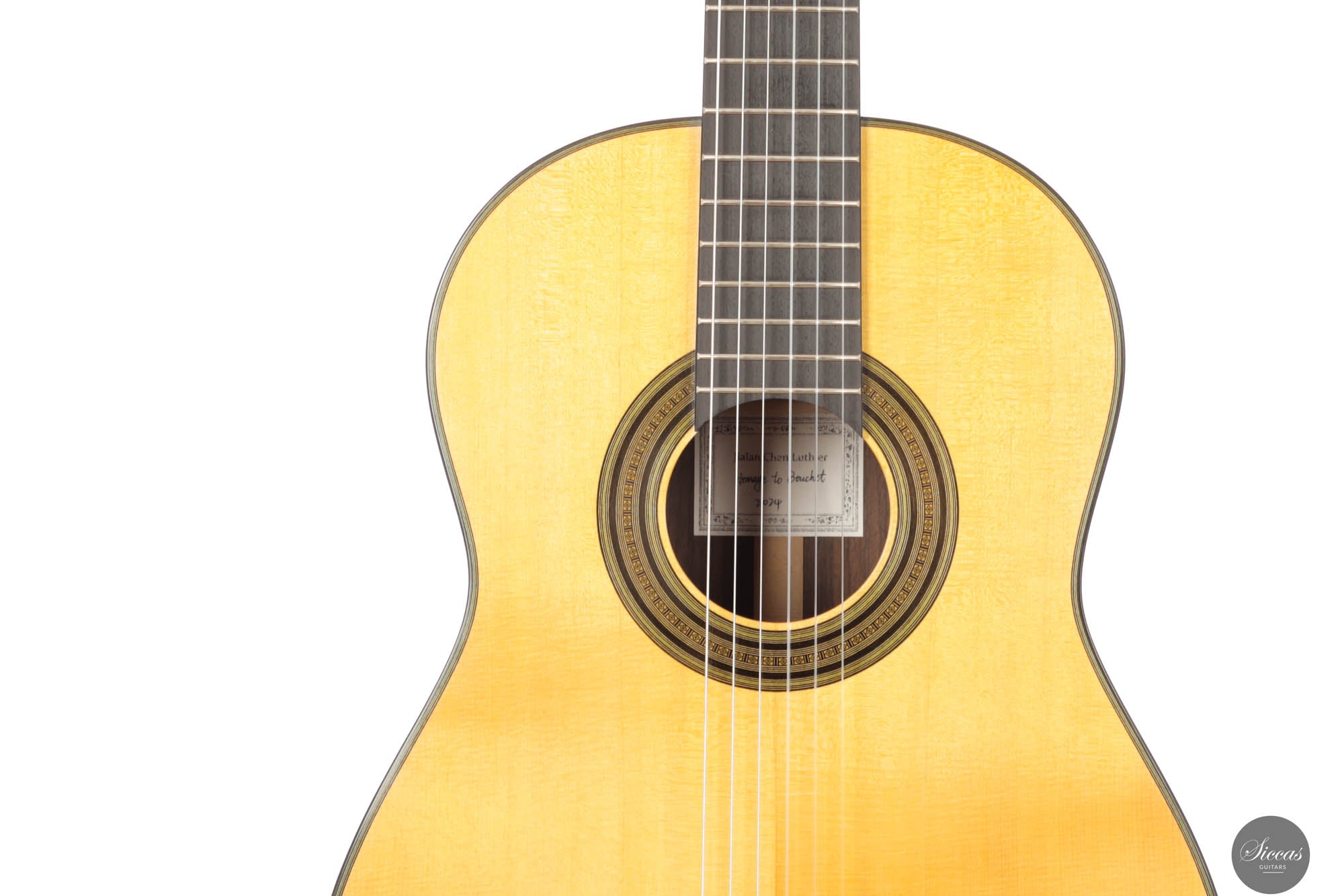 Jialan Chen, a distinguished luthier since 2013, initially specialized in crafting Torres style guitars, before expanding his repertoire in 2018 with this Bouchet model. His profound understanding of music and guitar performance art is reflected in the high-level sound aesthetics of his creations. His career took a significant leap forward in 2014 when he met and learned from the renowned guitar makers Andrea Tacchi and Paolo Coriani in Italy, gaining invaluable insights and skills. This experience, coupled with his study and documentation of historical guitars in Europe, has profoundly enriched his craftsmanship. Renowned for their sophisticated materials, exceptional sound quality, and elegant design, Jialan’s guitars are highly esteemed worldwide, with notable musicians like Swedish guitarist Per-Olov Kindgren favouring his Bouchet model since 2018.