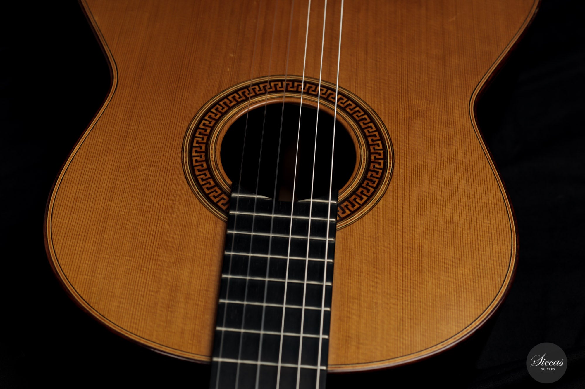 The flowing and long-lasting trebles echoes to deep round bass notes, and the warm variety of colors form an overall sense of balance. This lattice has remarkable responsiveness, a discreet attack, and easy playability. The result is a powerful and legato sound that will gently comfort its player in public performances and inspire him in a recording session. Overall, it is a wonderful, rare, and highly sought-after concert guitar.
