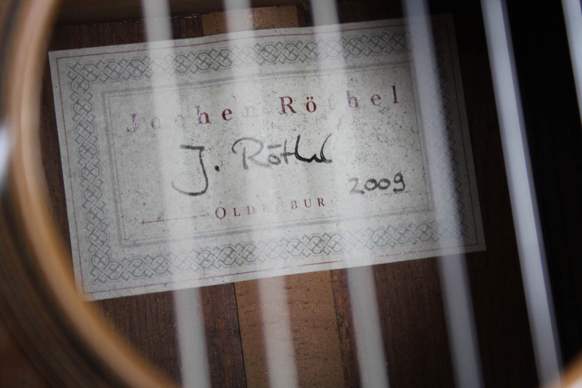 Jochen Röthel is a well-known luthier from Germany. He began building guitars very early at the workshop of Martin Seeliger (Lakewood Guitars). At the “Staatliche Geigenbauschule Mittenwald” he recieved his “Meisterbrief” (Master Degree) in luthiery. The craftsmanship is perfect. Only the best woods were used, such as Ziricote for back and sides and very fine cedar for the top. The sound is warm, deep and very consistant – the trebles have a lot of sustain. This instrument has a beautiful French polish finish and the machine heads are by Alessi. The guitar has some minor signs on the back, sides and the top. Overall condition is very good.