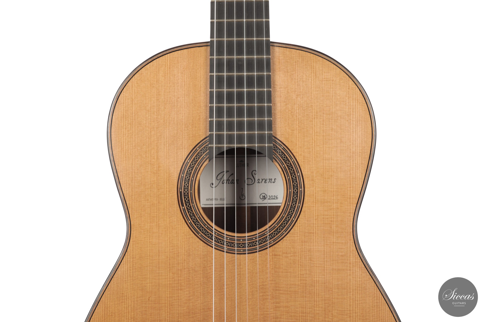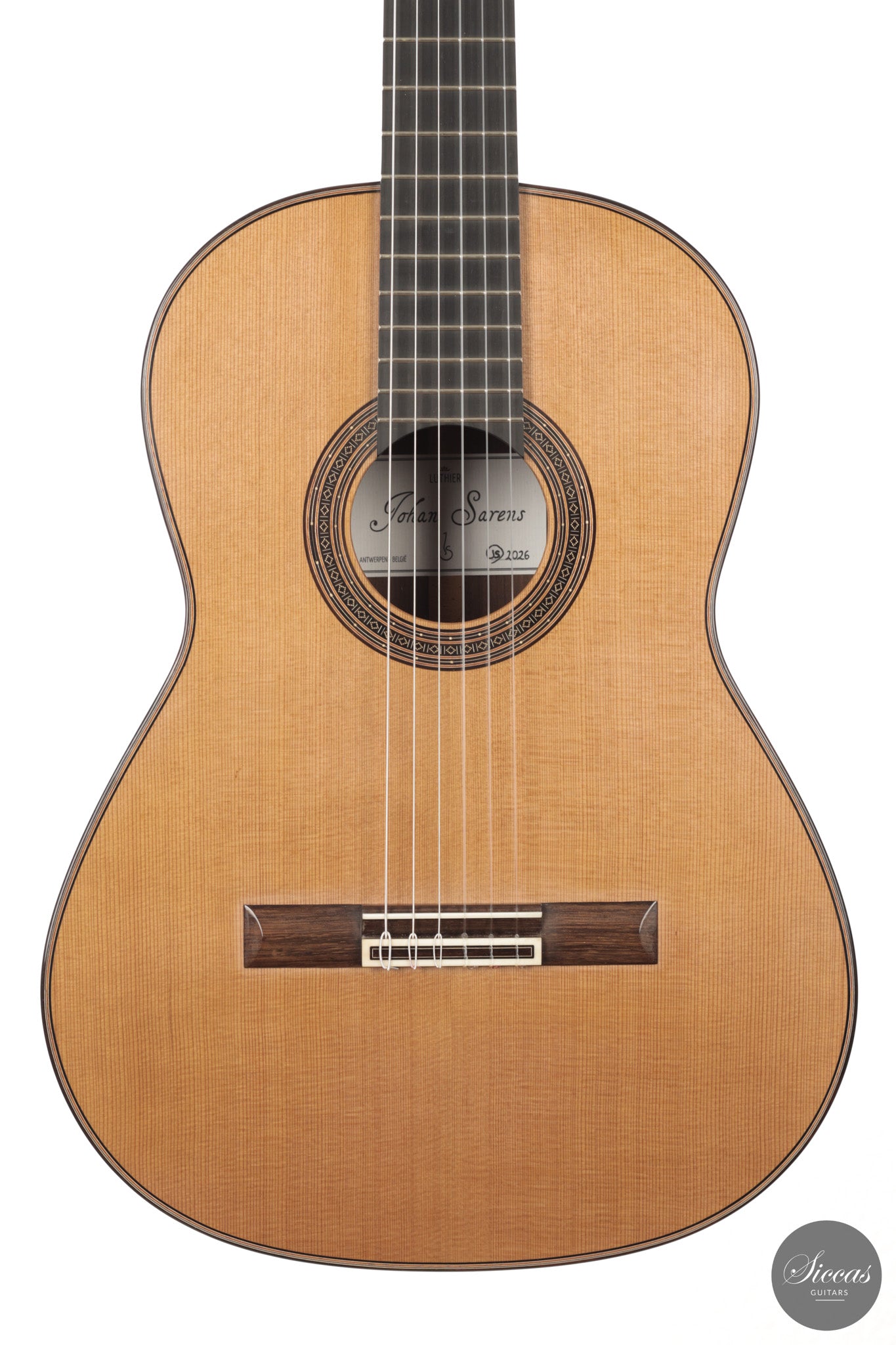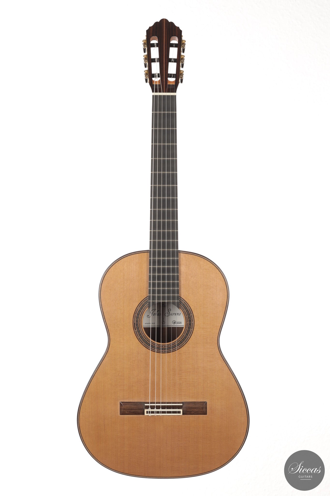 This guitar from 2026 represents Johan Sarens’ interpretation of a modern lattice braced concert instrument. Built with a cedar top and Indian rosewood back and sides, the relatively light construction results in a highly immediate response. Notes develop quickly after the attack and reach their full presence with very little effort from the player.